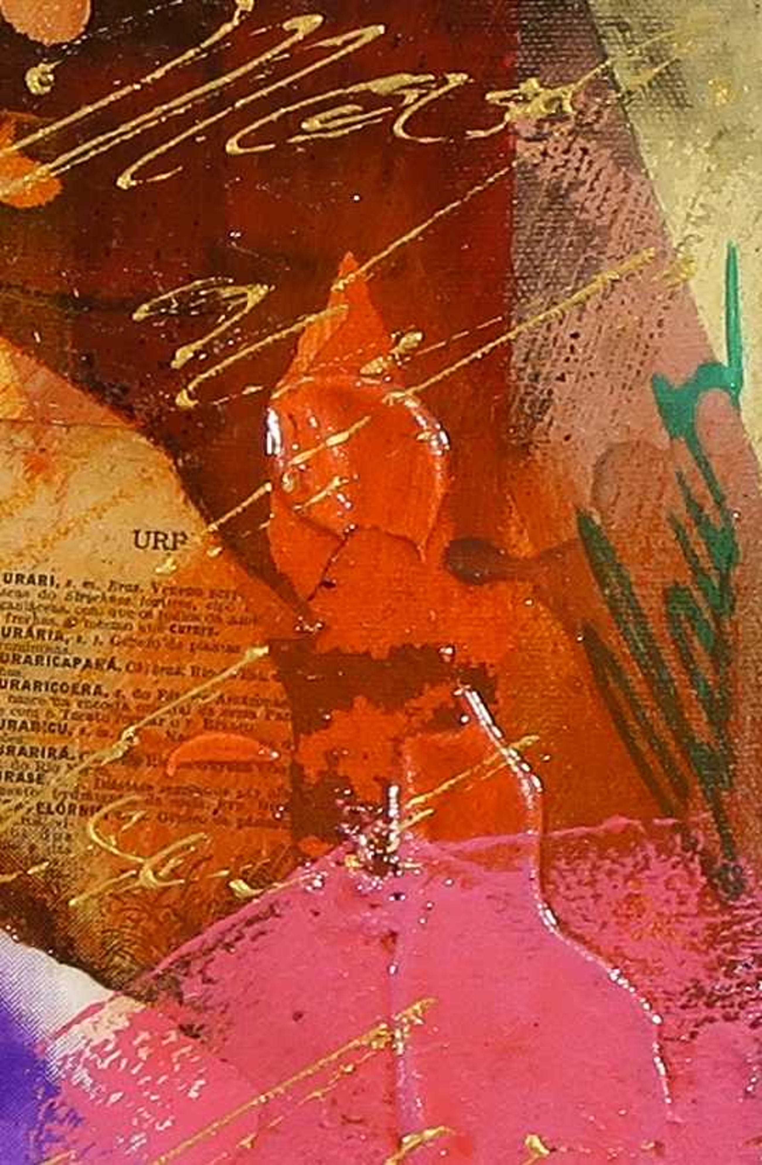 gemengde techniek: o.a. zeefdruk, collage en acryl