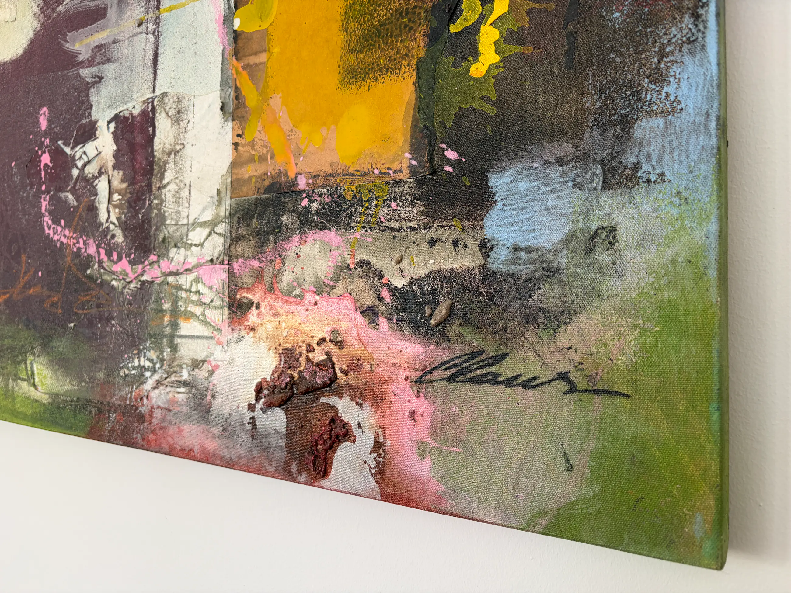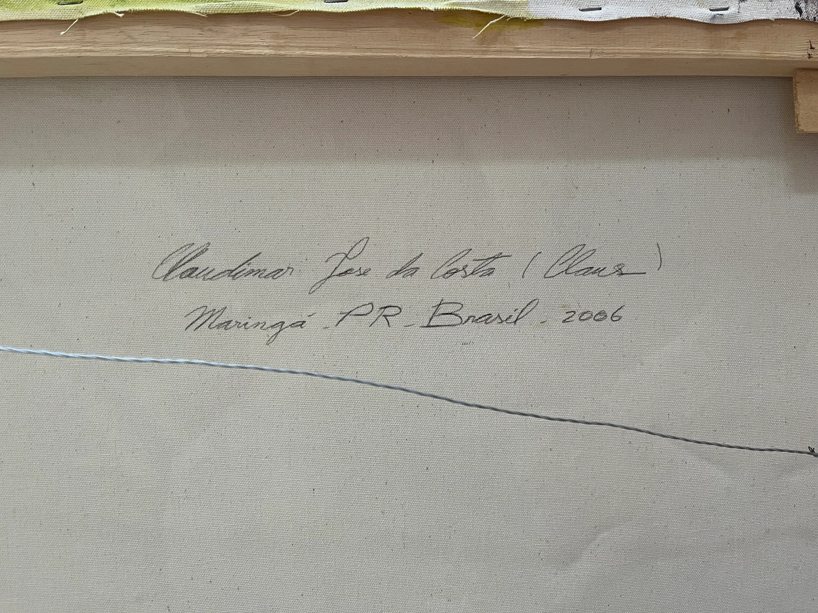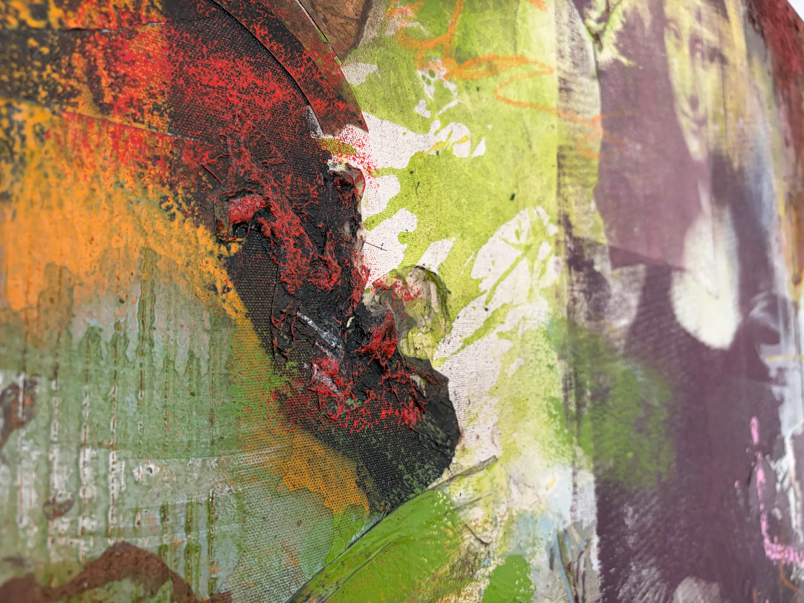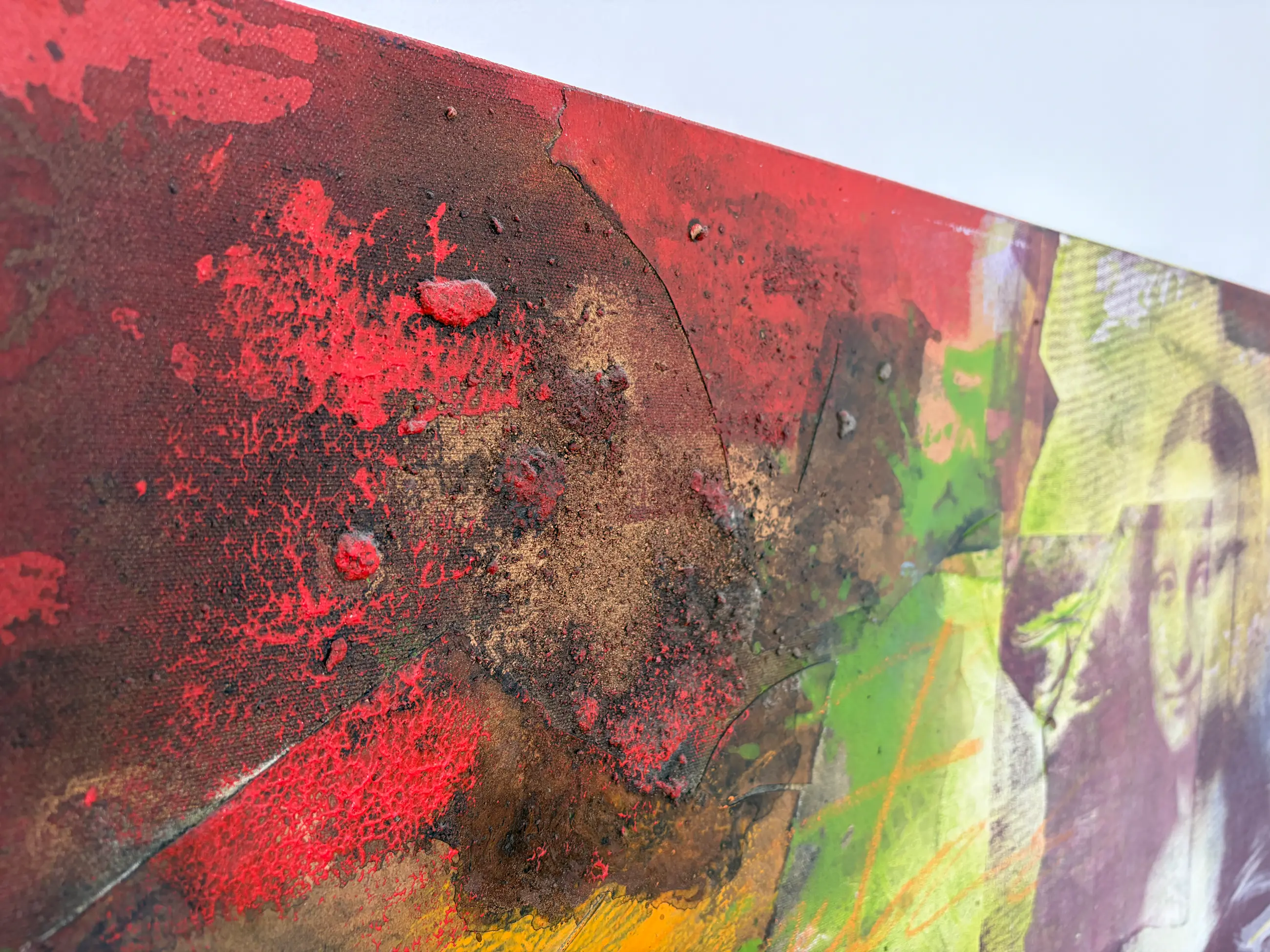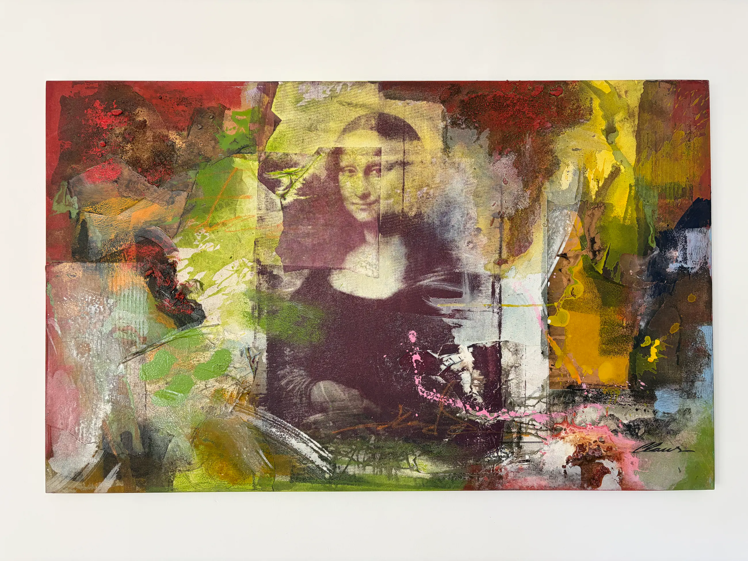 Vroeg werk van de onvolprezen Braziliaanse kunstenaar Clause Costa. Collage rondom de iconische Mona Lisa met 3D-effecten door gebruik van papier en zand onder de verflagen.