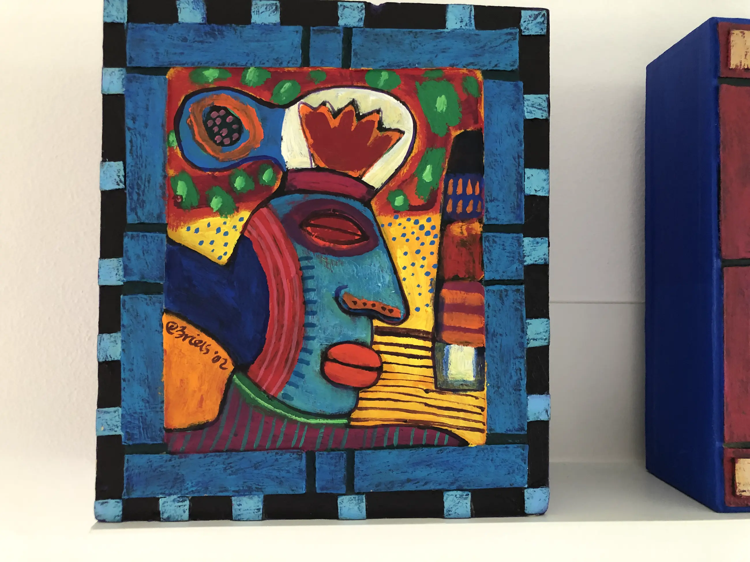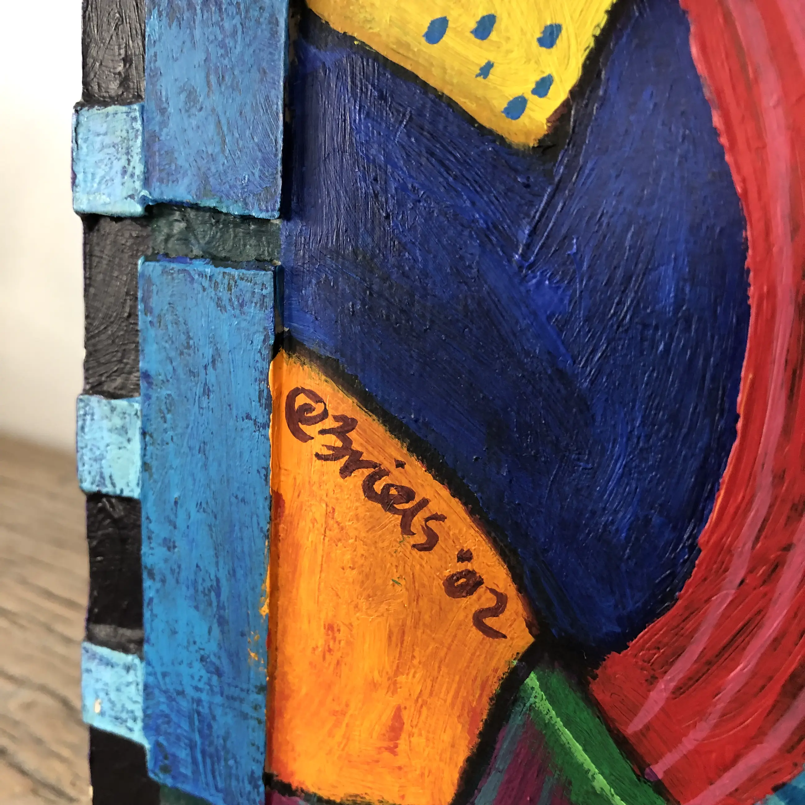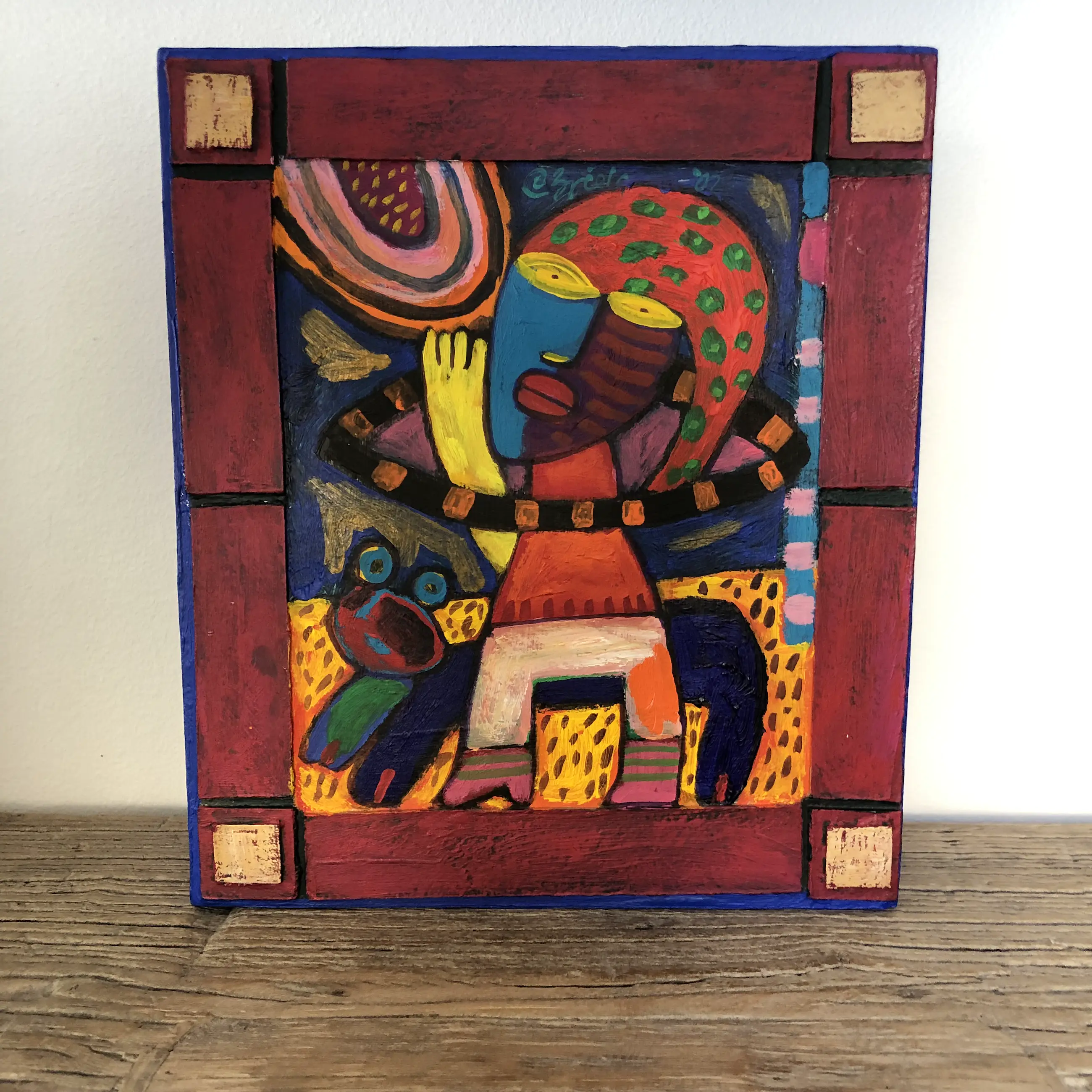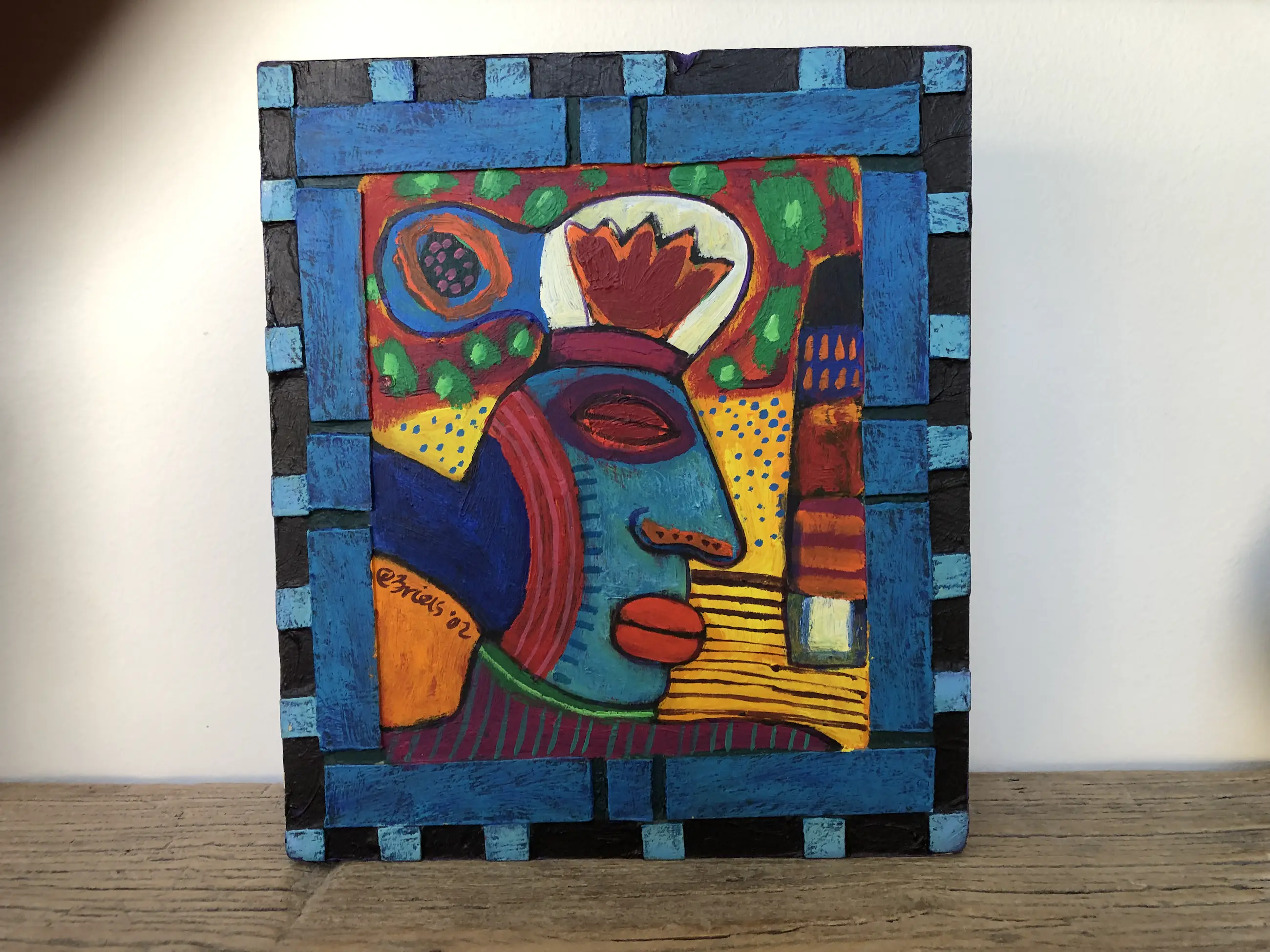 Opmerking: Het werk is geschilderd op een soort houten kistje. Geeft dieptewerking als het aan de muur wordt opgehangen Opmerking: Wordt per set van twee verkocht; daarop is de prijs gebaseerd. Jaartal: 2002 Techniek: Acryl Bijzonderheden: Collage langs de randen Drager: Paneel Afmetingen: 25 x 30 x 12,5 cm ( b x h x d) Gesigneerd: Hand gesigneerd Conditie: In zeer goede staat