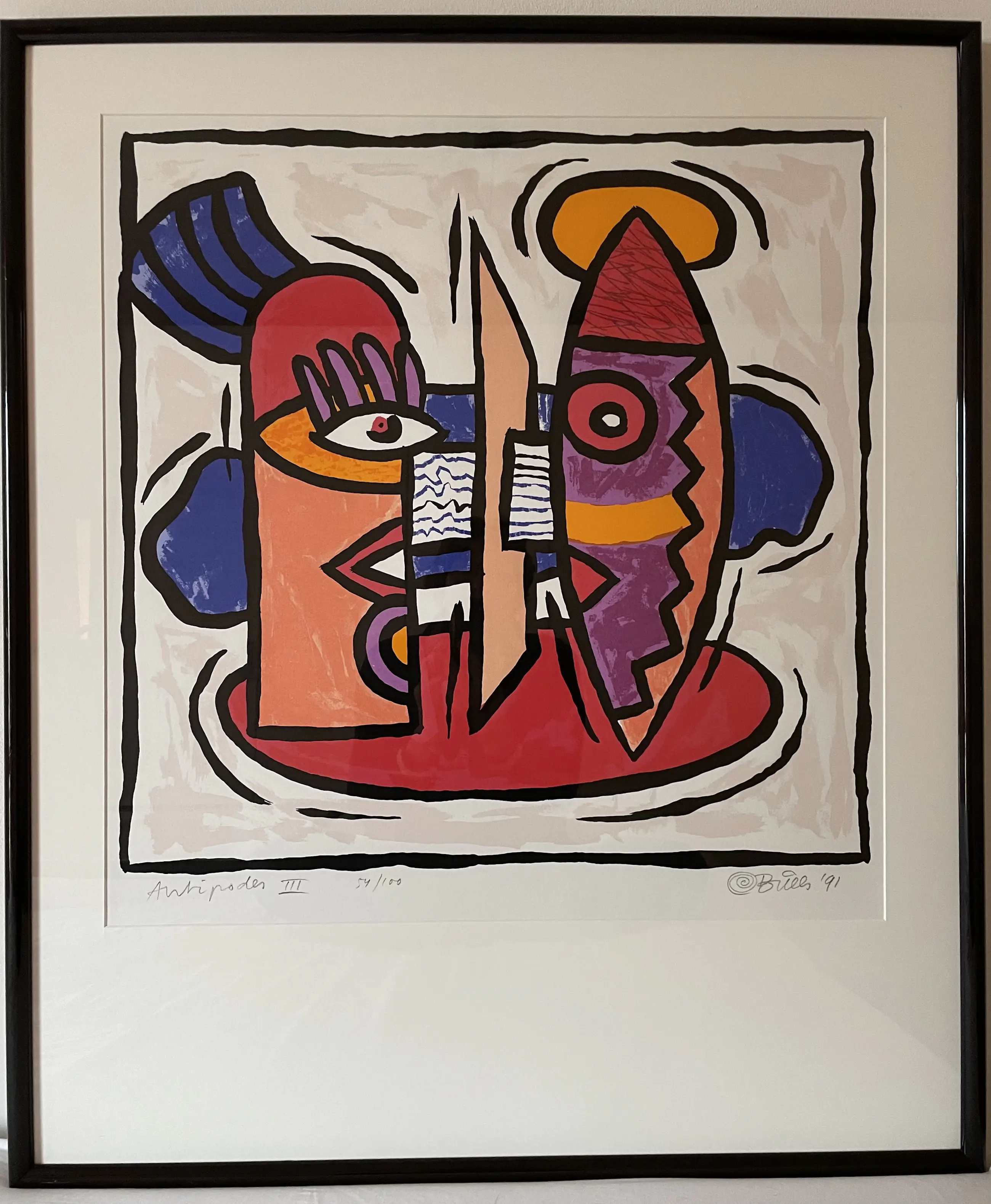 Antipodes III is een van het meer ingetogener werk van Clemens Briels. Deze zeefdruk met oplagenummer 54/100 is handgesigneerd ‘91 en professioneel ingelijst. Het geheel is prima staat.