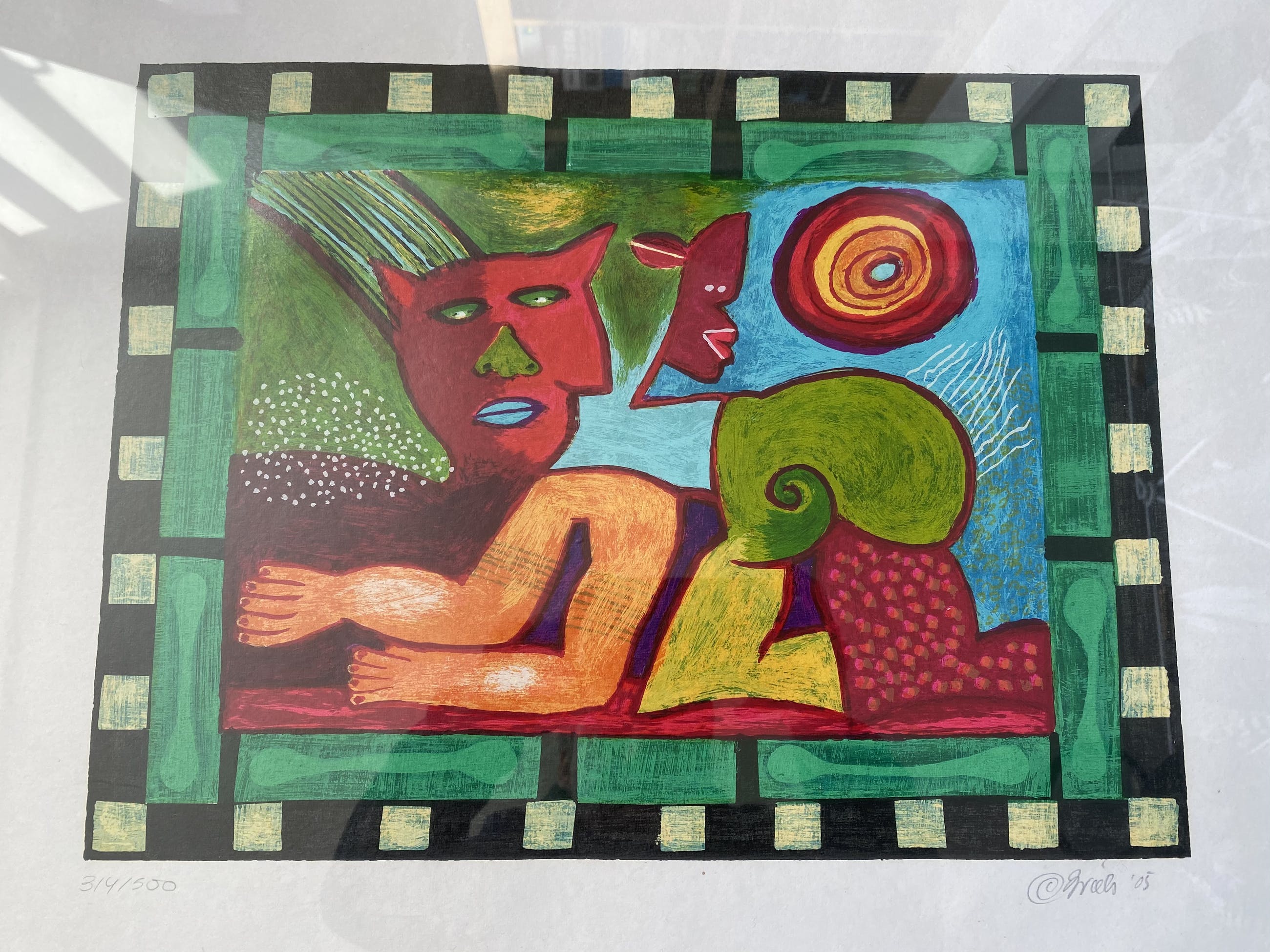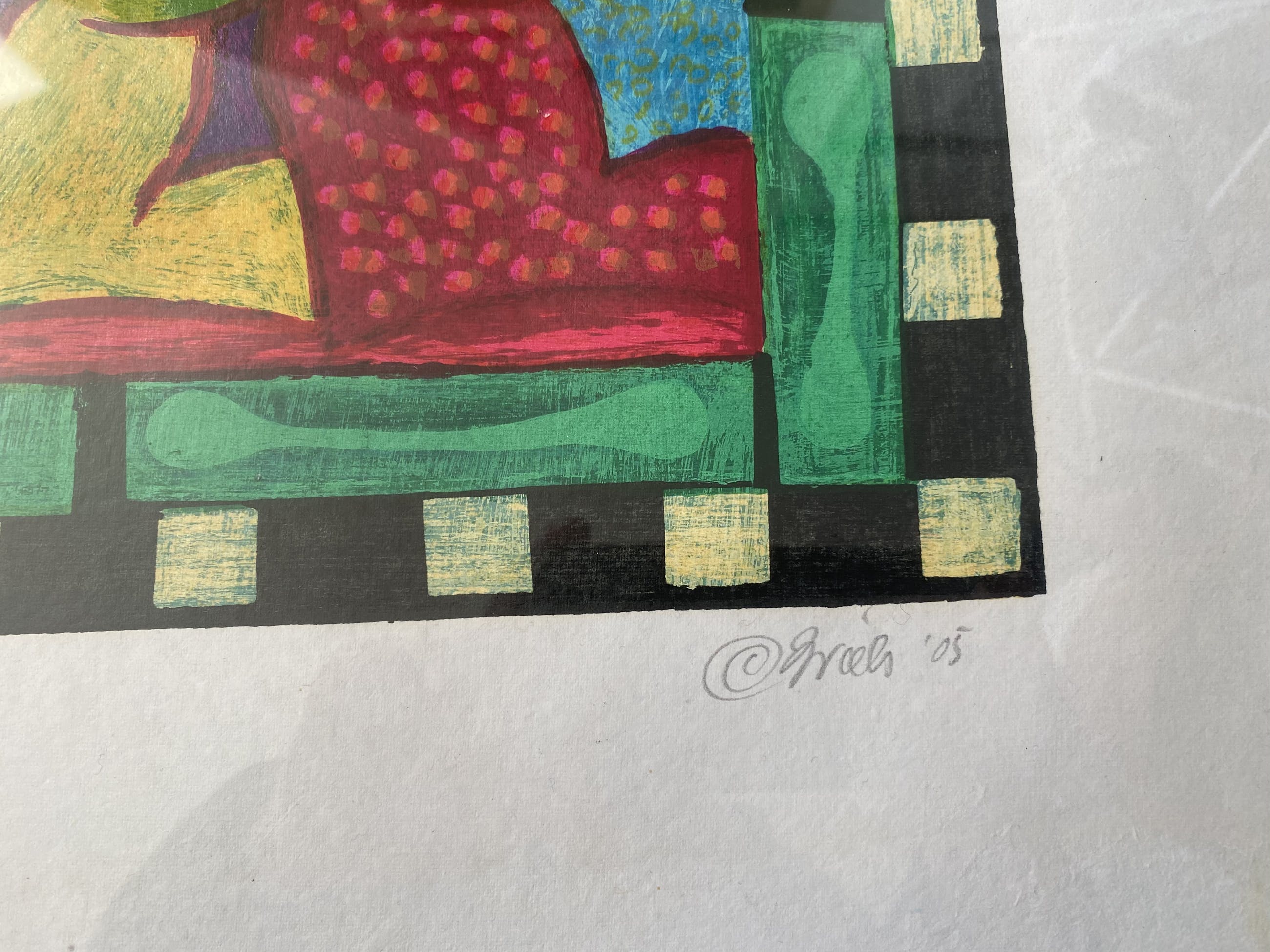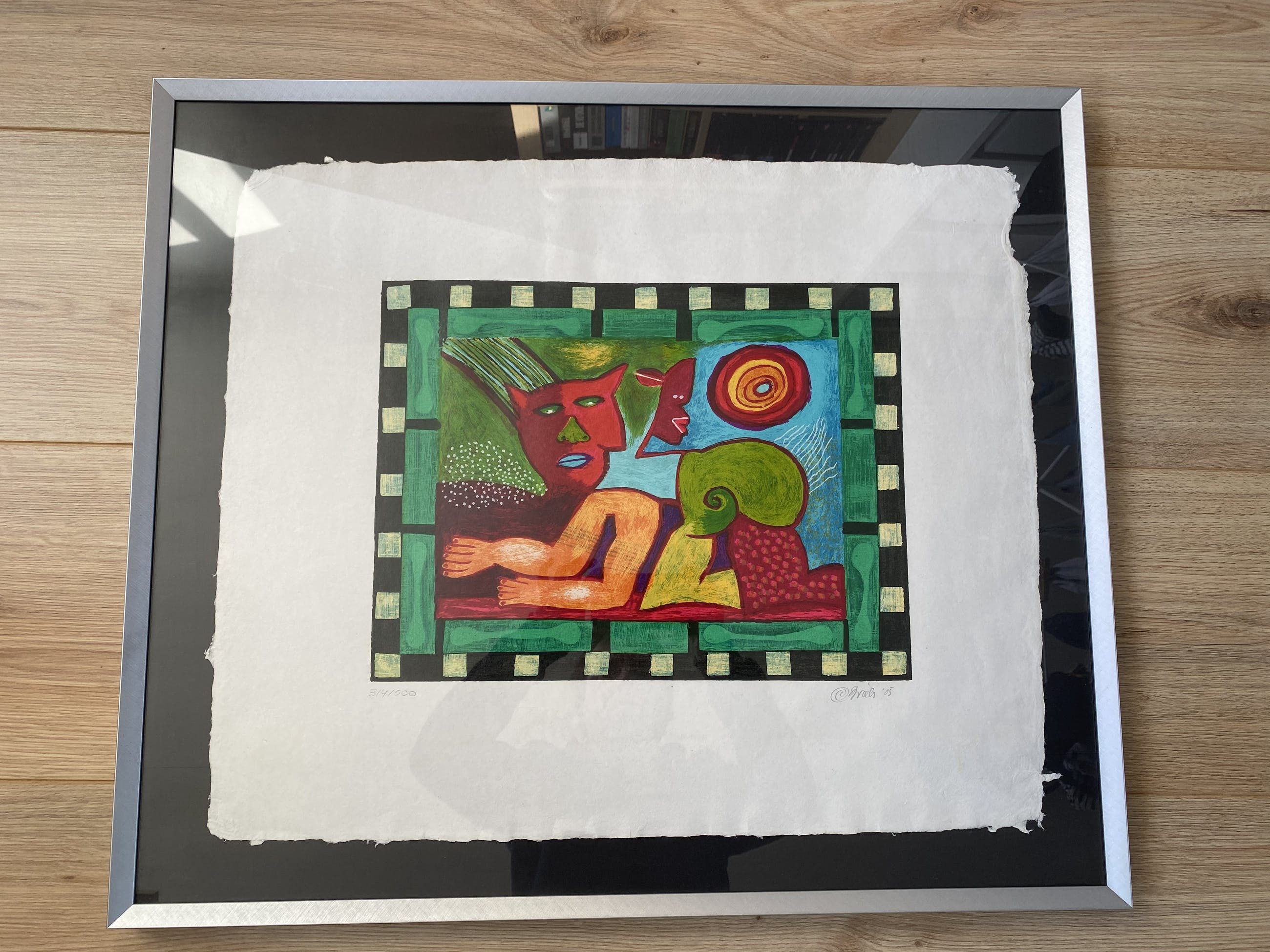 Mooie zeefdruk ‘el Gato’ van Clemens Briels (1946) uit 2005; #314 van 500. Verkeert in goede staat, inclusief nette lijst.