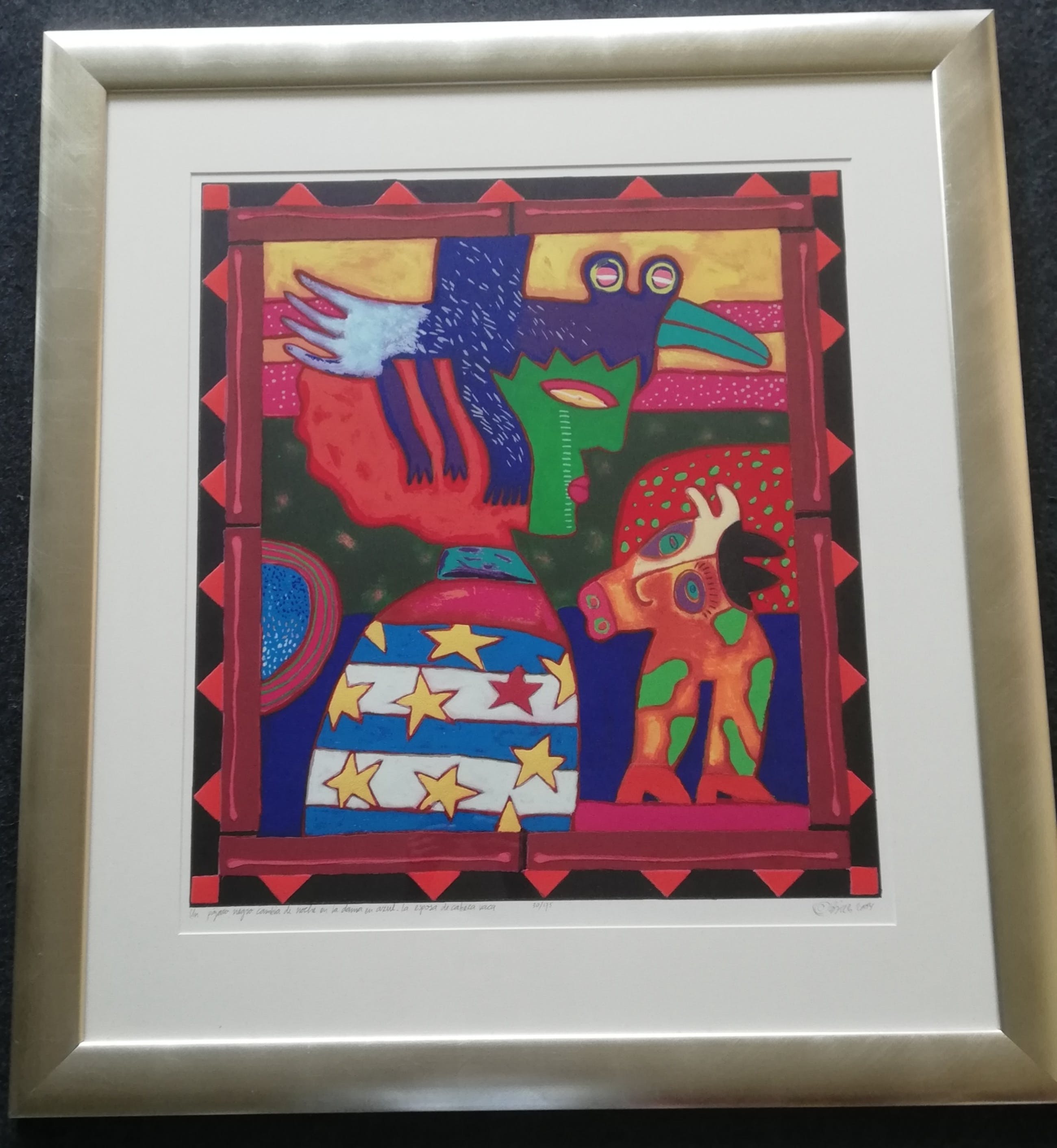 Bijzonder mooie 3D zeefdruk van Clemens Briels Gesigneerd Titel luidt: Un pajaro negro cambia de noche en la dama en Azul. La esposa de cabeza vaca