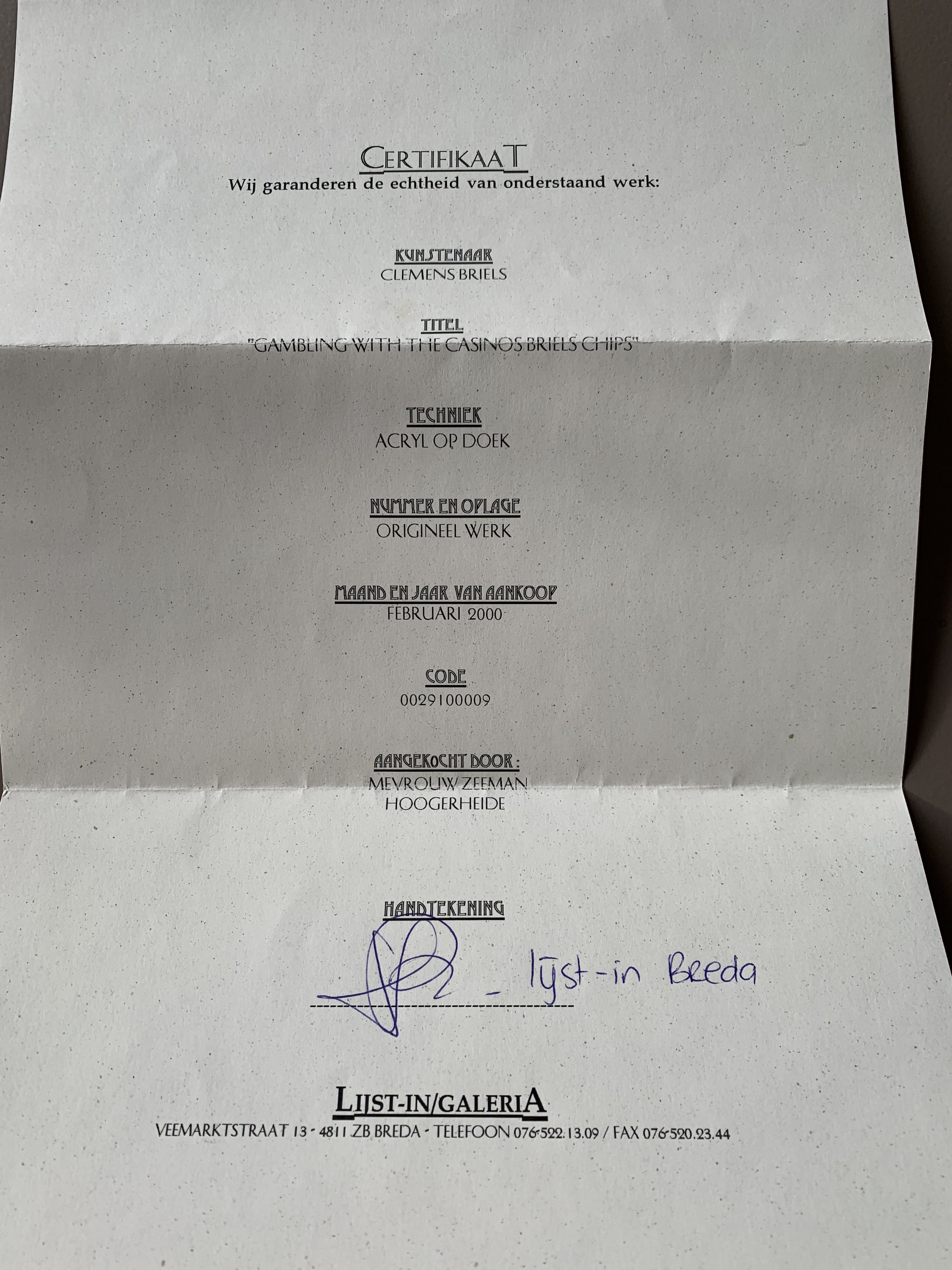 Schilderij is destijds gekocht bij Lijst-in/GaleriA te Breda. Echtheidscertificaat is aanwezig. Originele rekening is aanwezig. Aankoopprijs in 2000 was 9500,- Guldens. Verkoopschilderij heeft te maken met herinrichting huis.