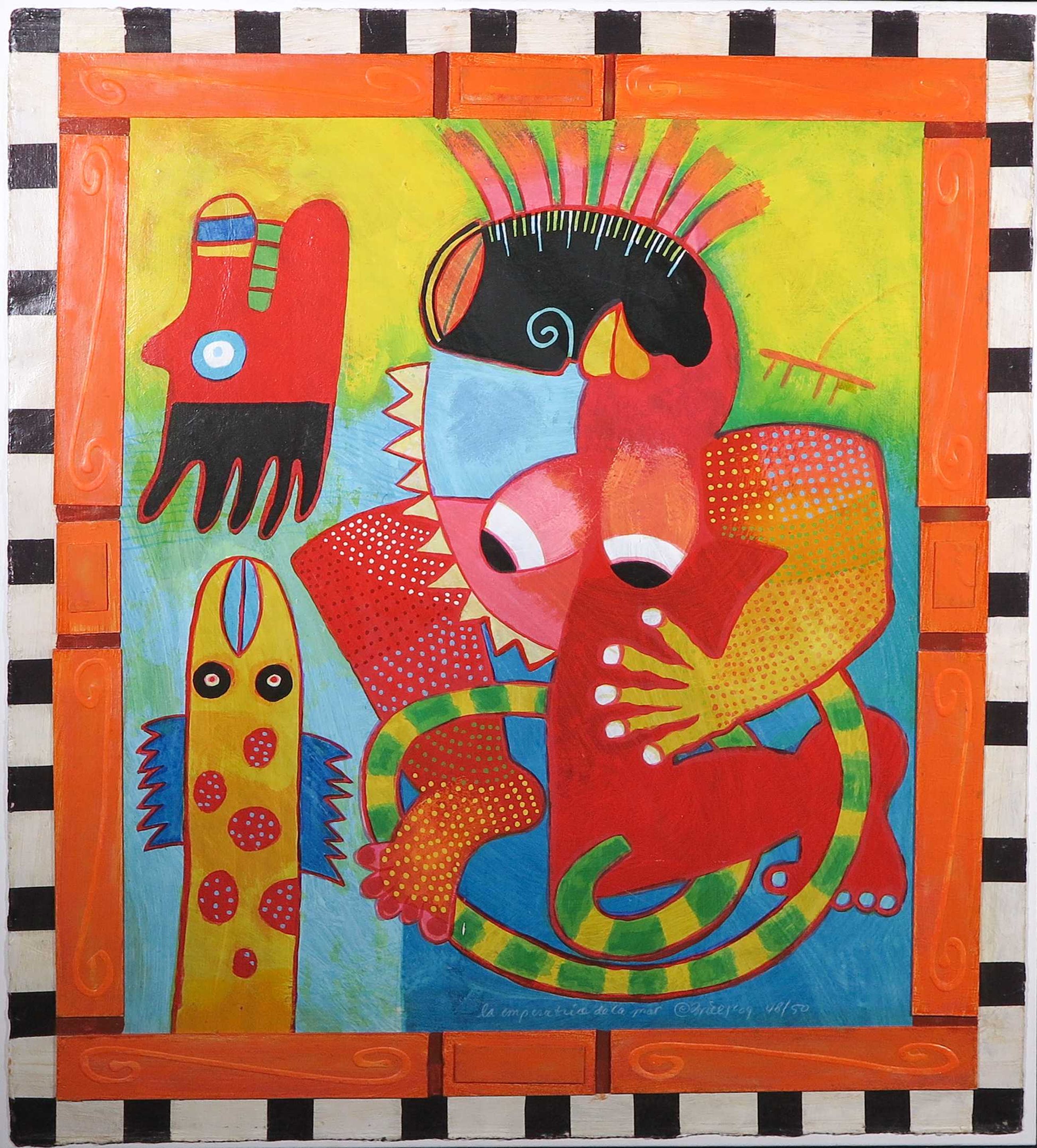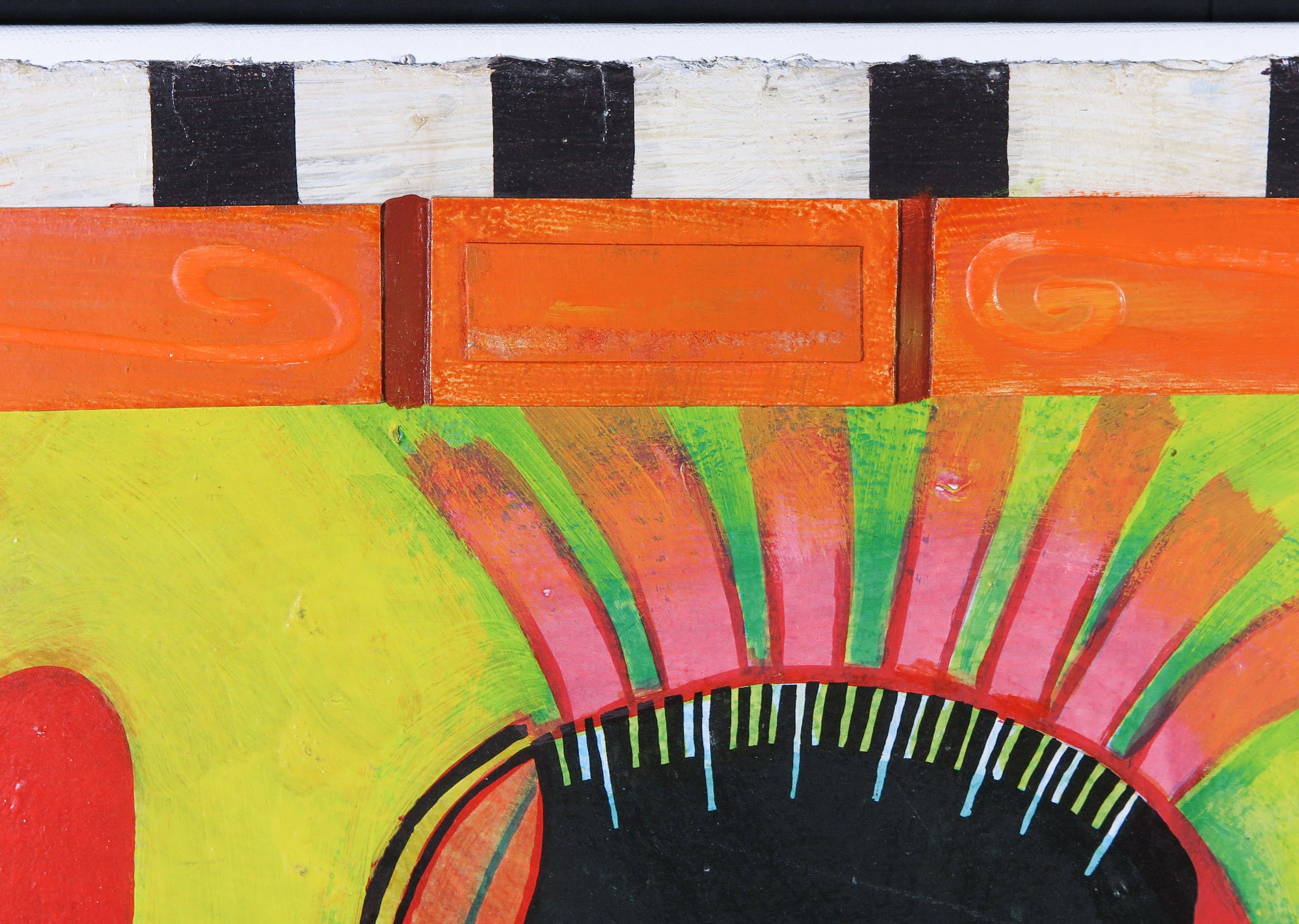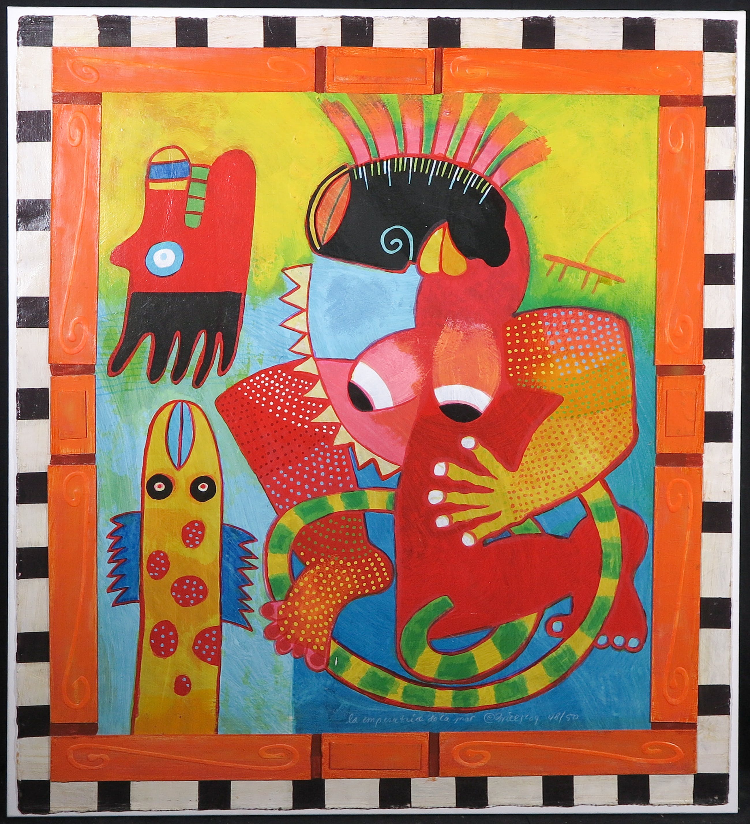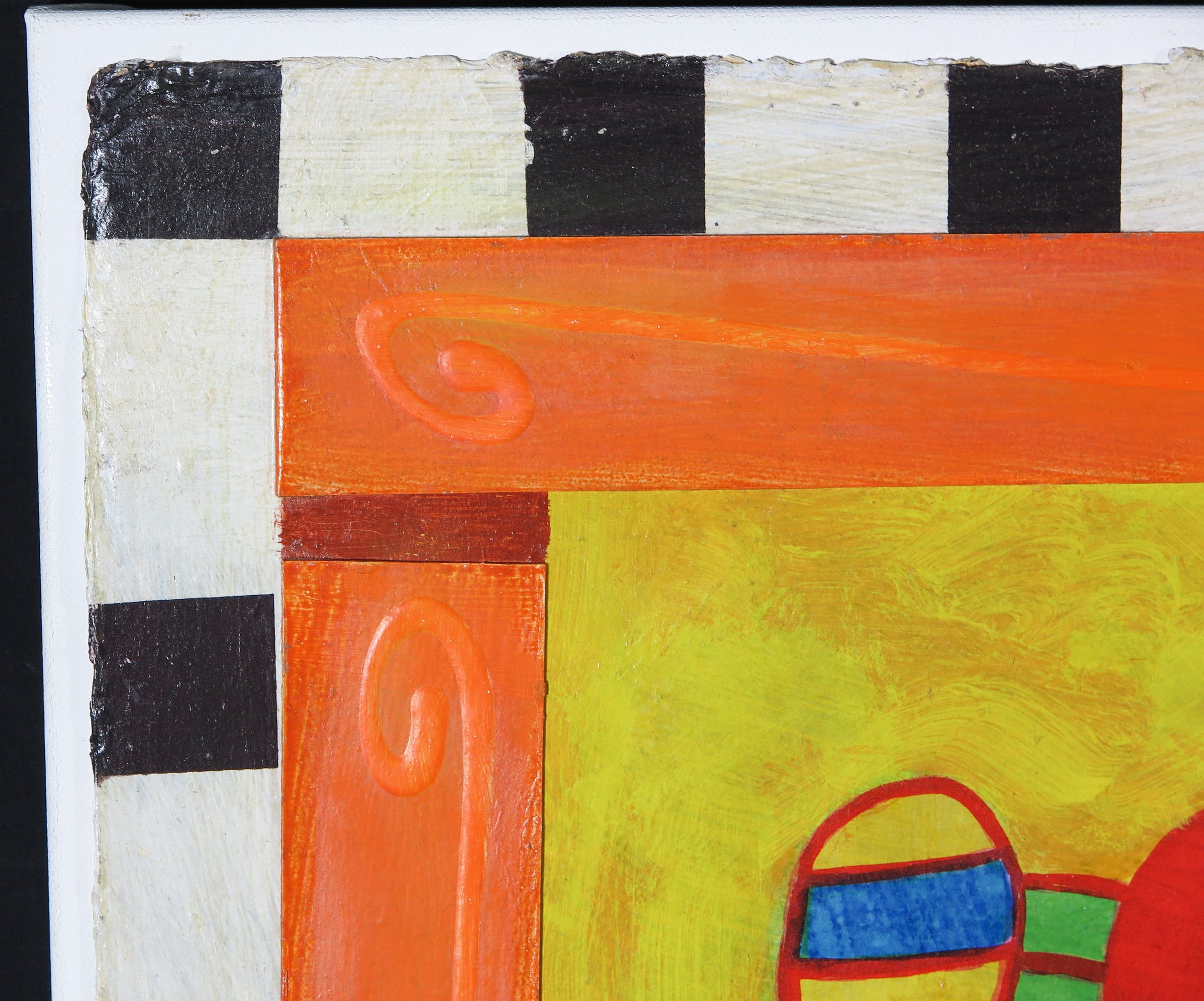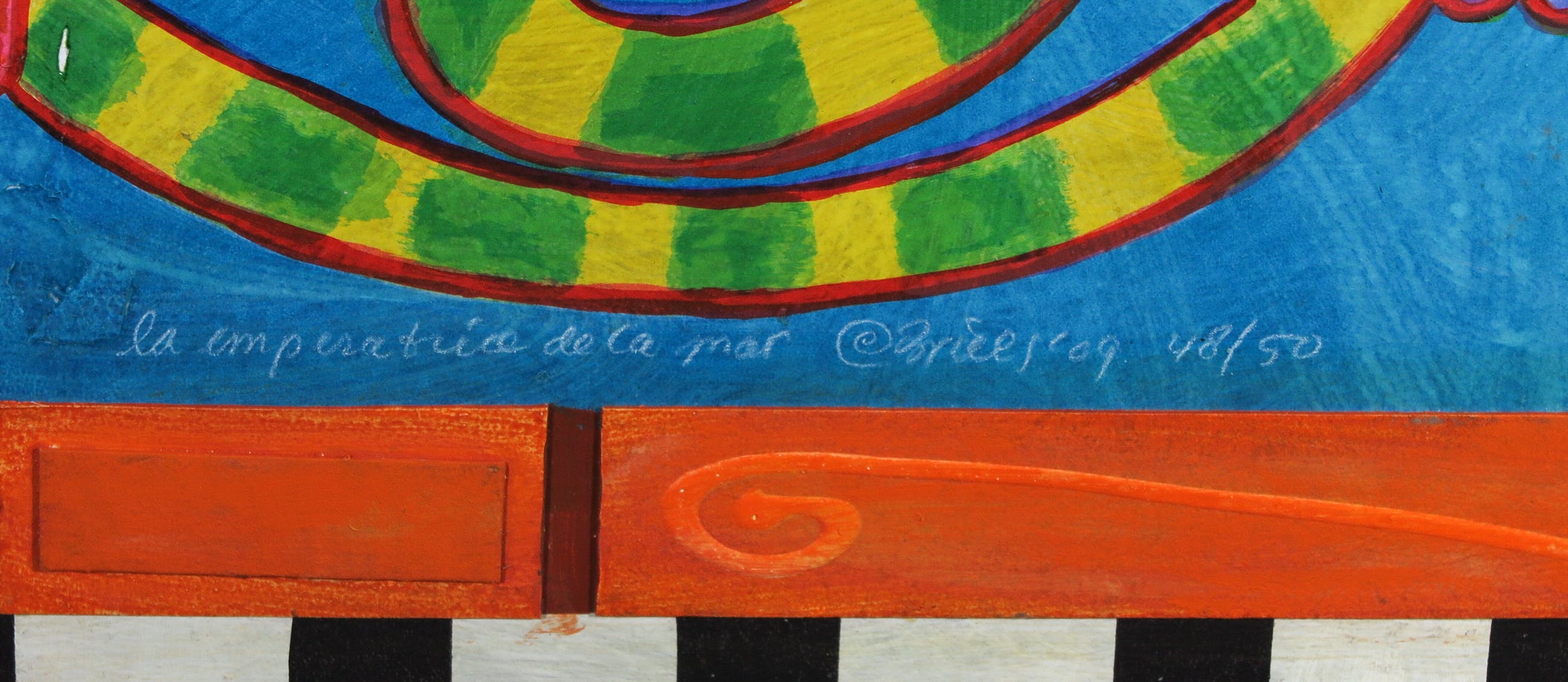 Het betreft een werk in gemengde techniek, waaronder zeefdruk en collage op geschept papier, bevestigd op doek.