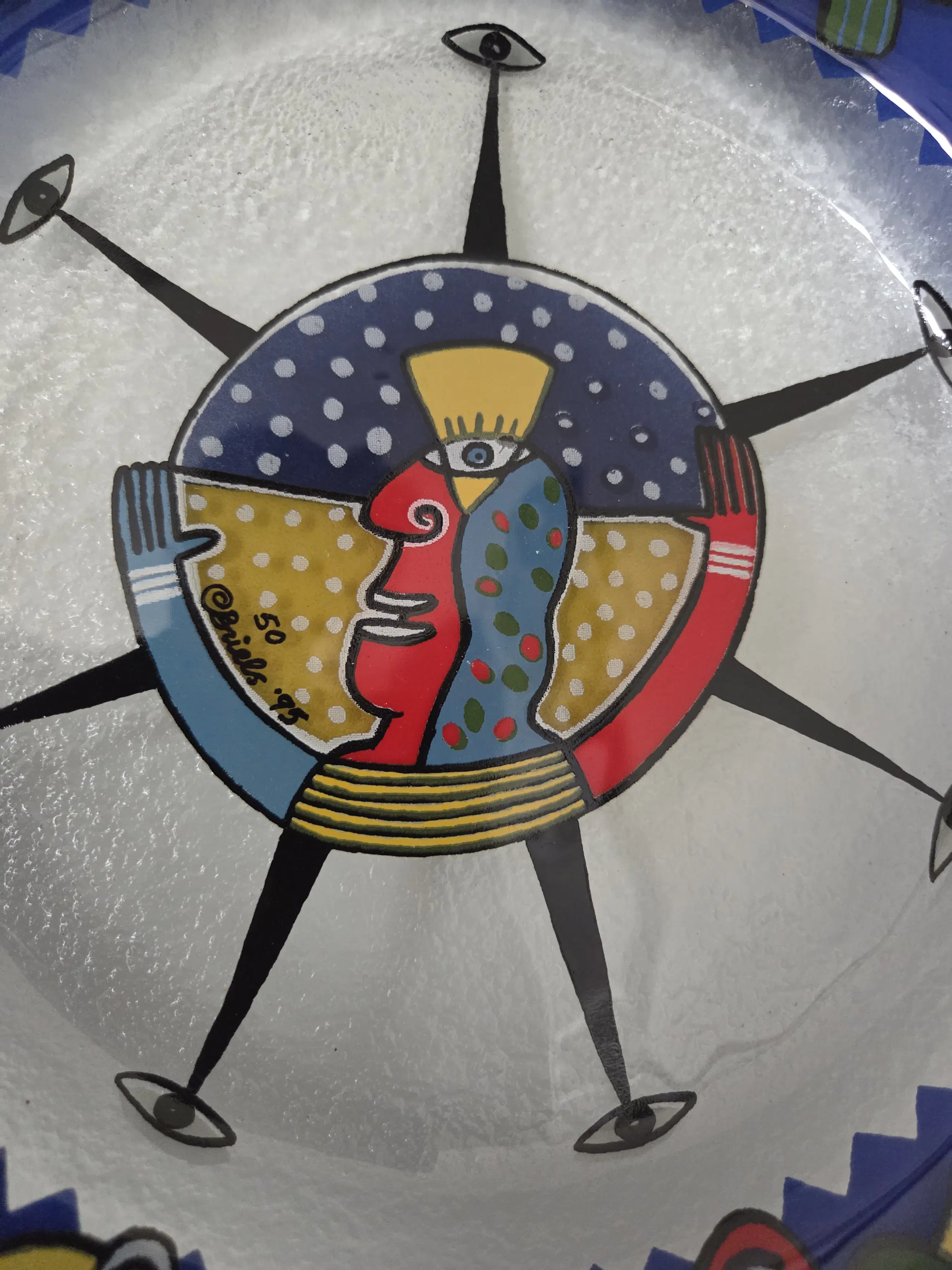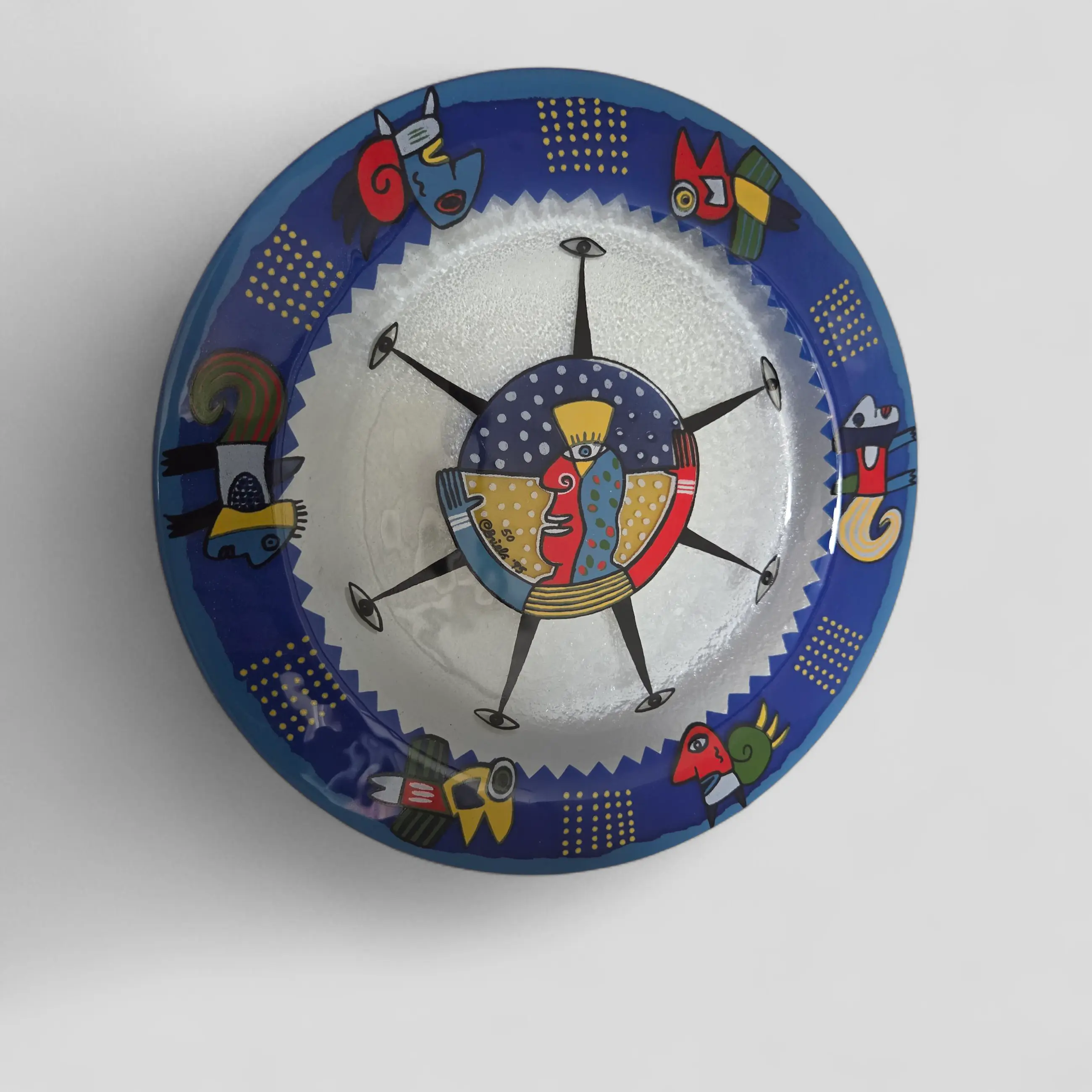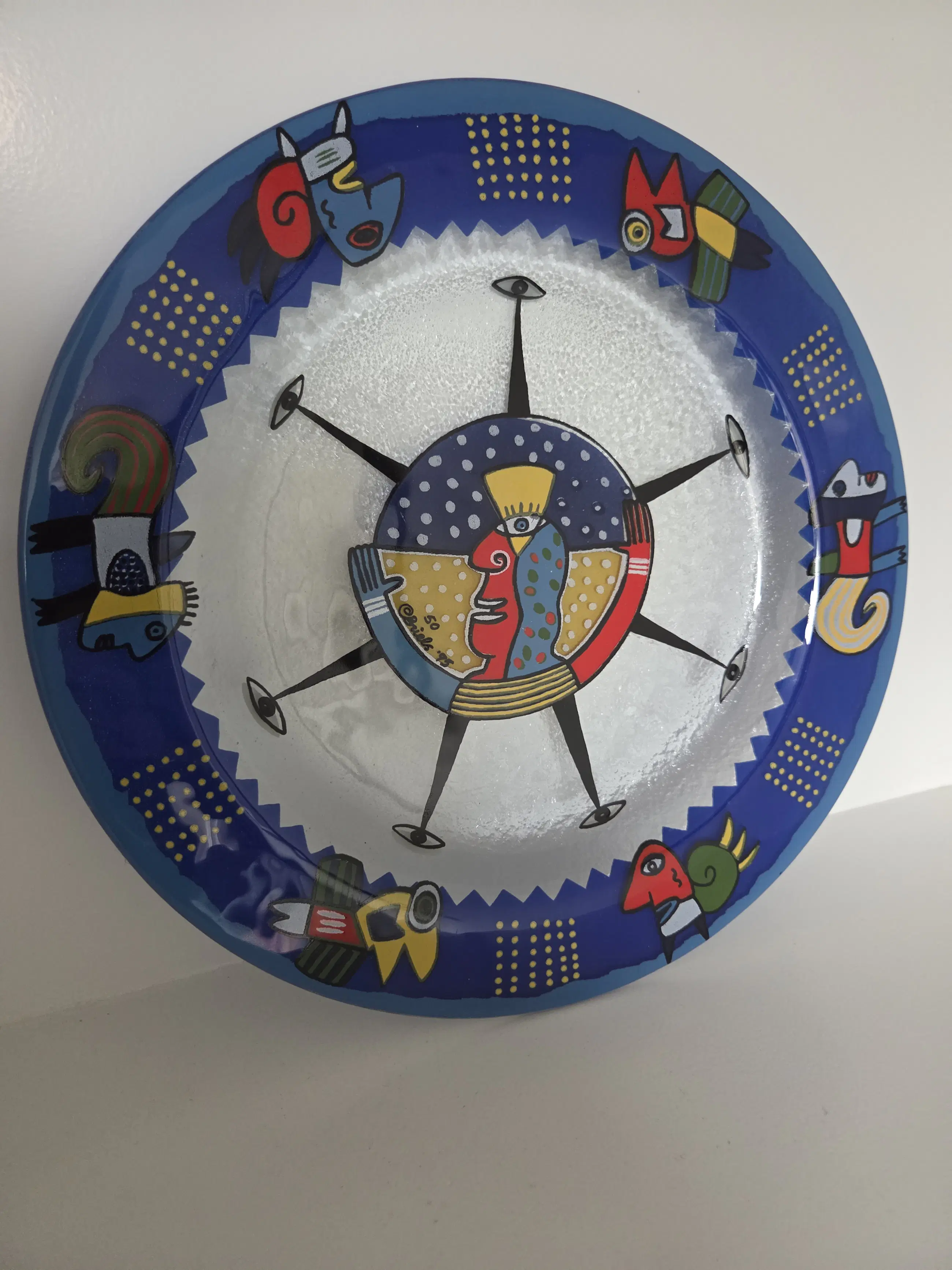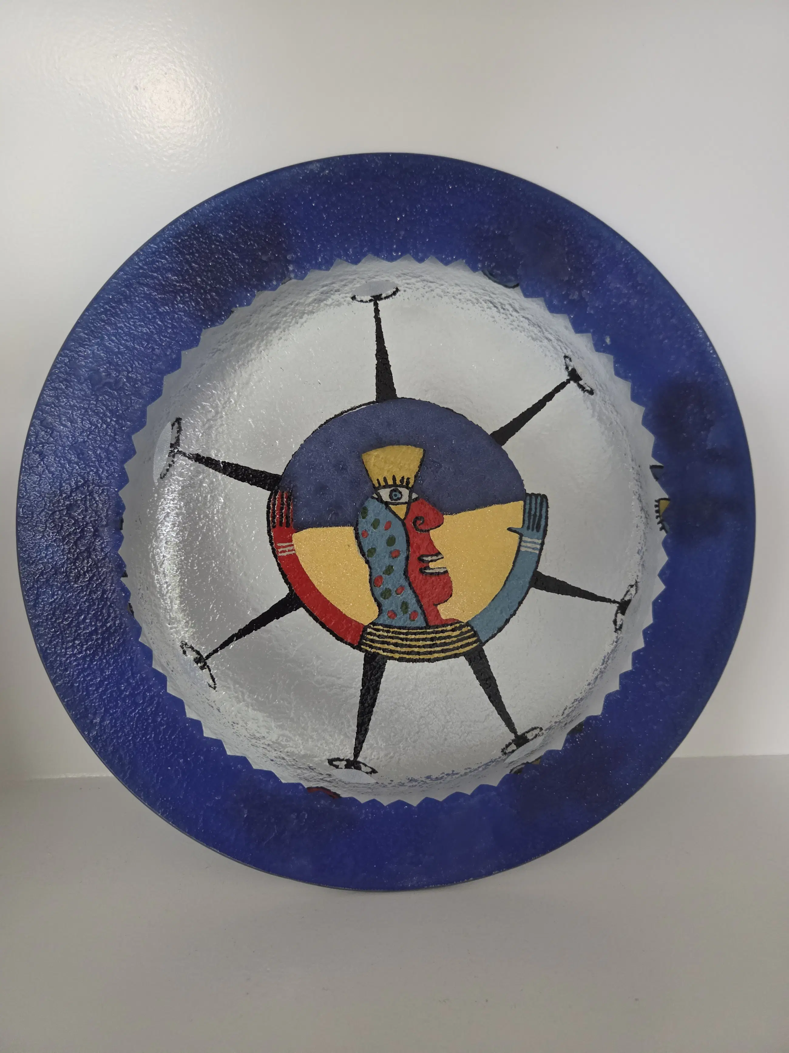 Decoratief glazen schaal met een diameter van 33 cm. Meerkleurig en uitstekende staat.