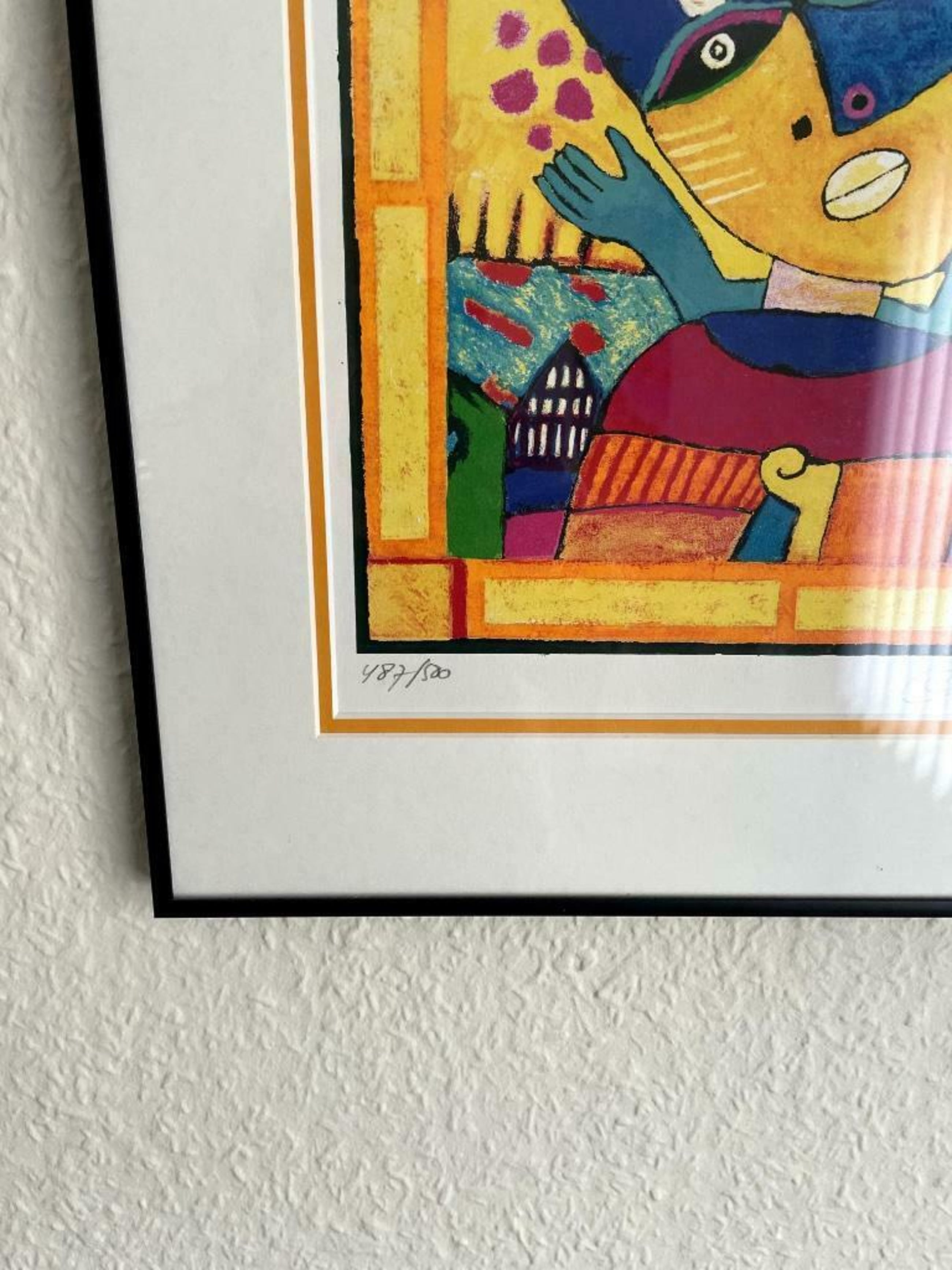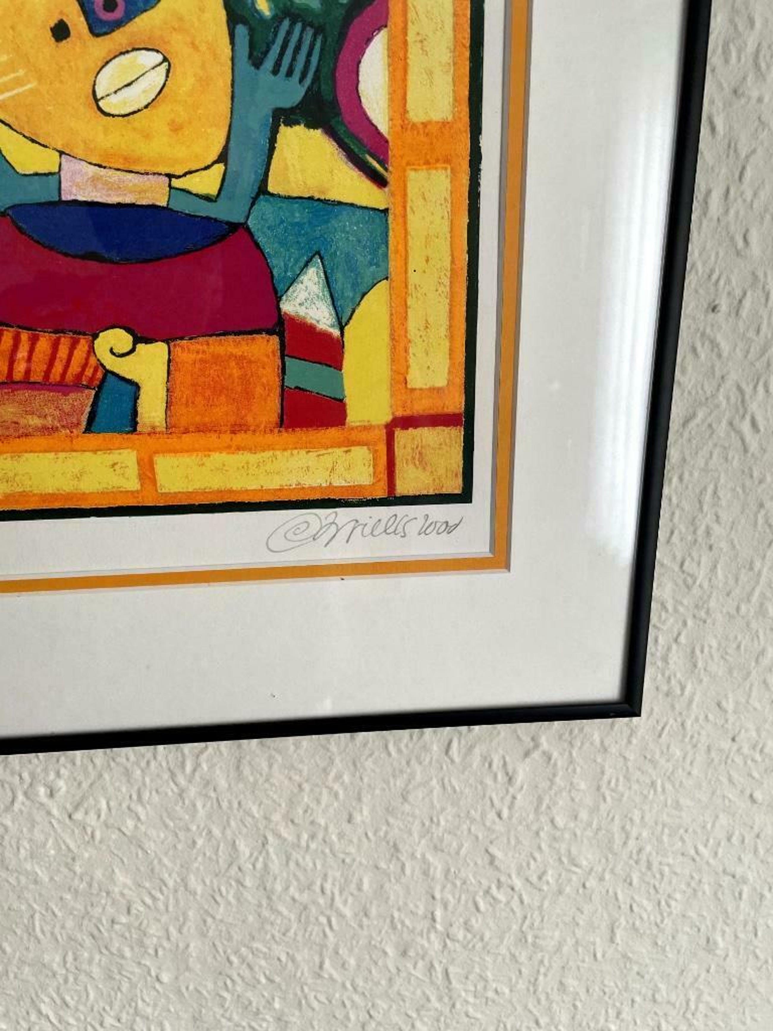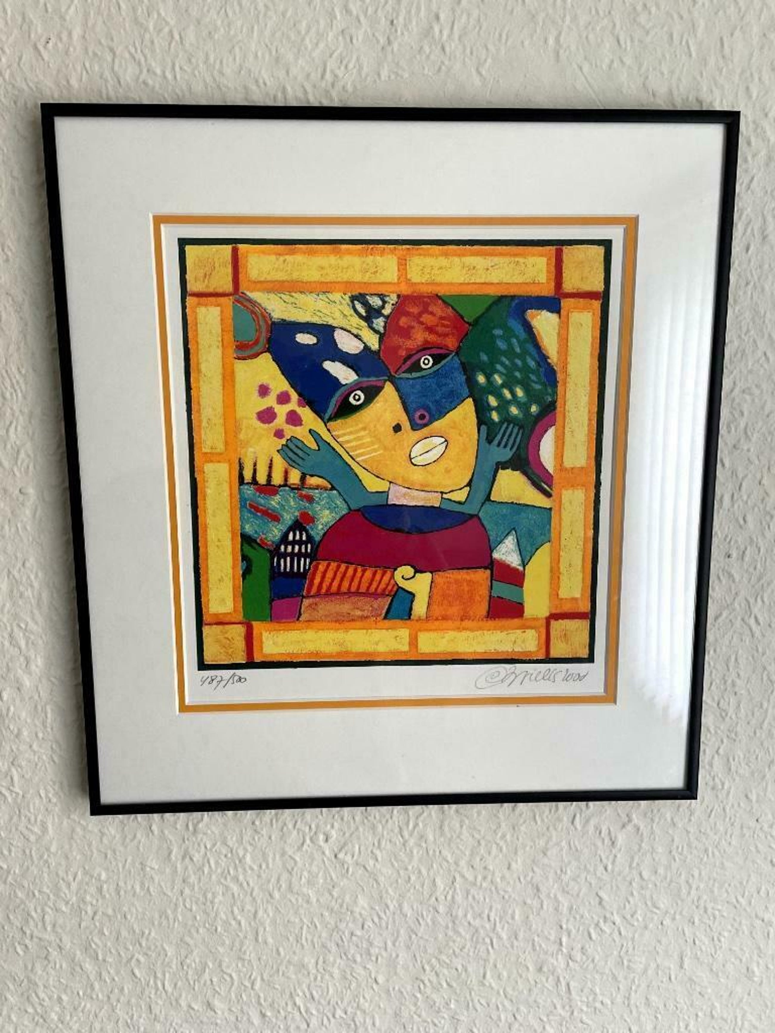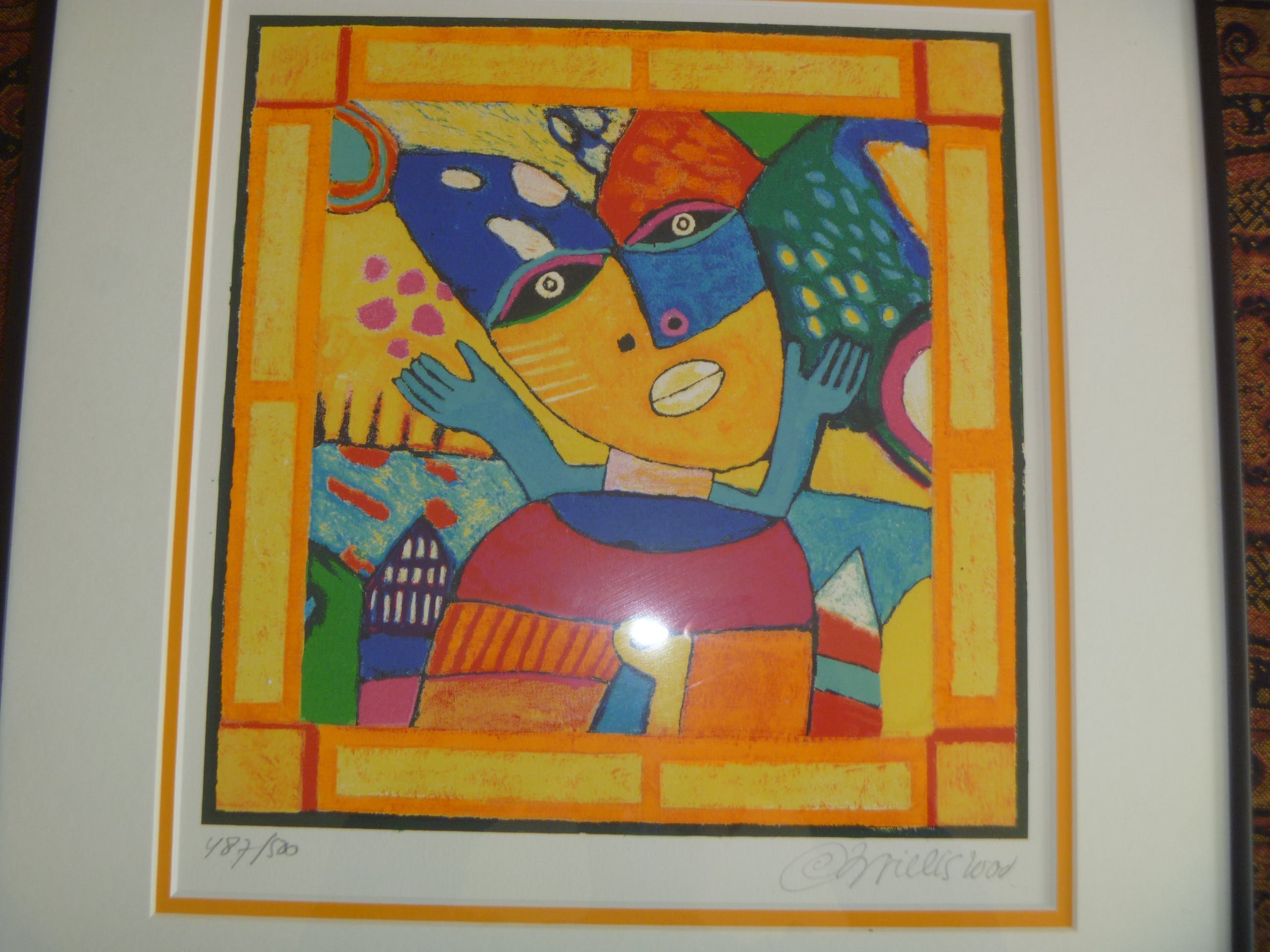 een mooie zeefdruk van Clemens , vakkundig ingelijst , het werk kan zo aam de muur .