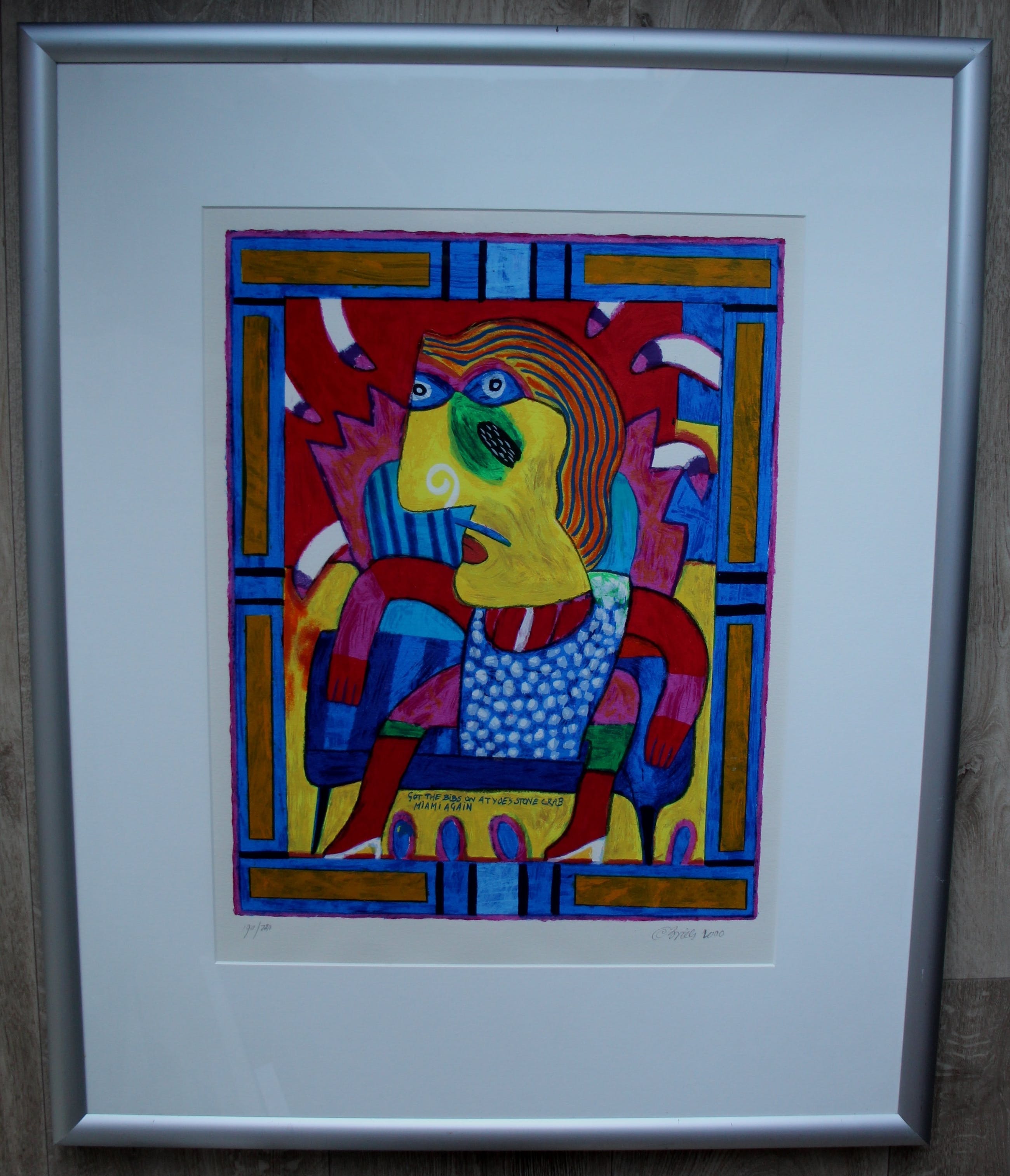 Ingelijste Zeefdruk van Clemens Briels. Titel: Got the bibs... Jaar: 2000. Afmetingen incl. lijst: H75 x b61 cm, afmetingen voorstelling: H44.5 x b34.5 cm. Het werk is rechtsonder, met potlood, gesigneerd door de kunstenaar. Het werk is rechtsonder gesigneerd door de kunstenaar. De authenticiteit van het, aangeboden, werk wordt volledig gegarandeerd. Een certificaat van echtheid kan, op aanvraag, worden gemaild.
