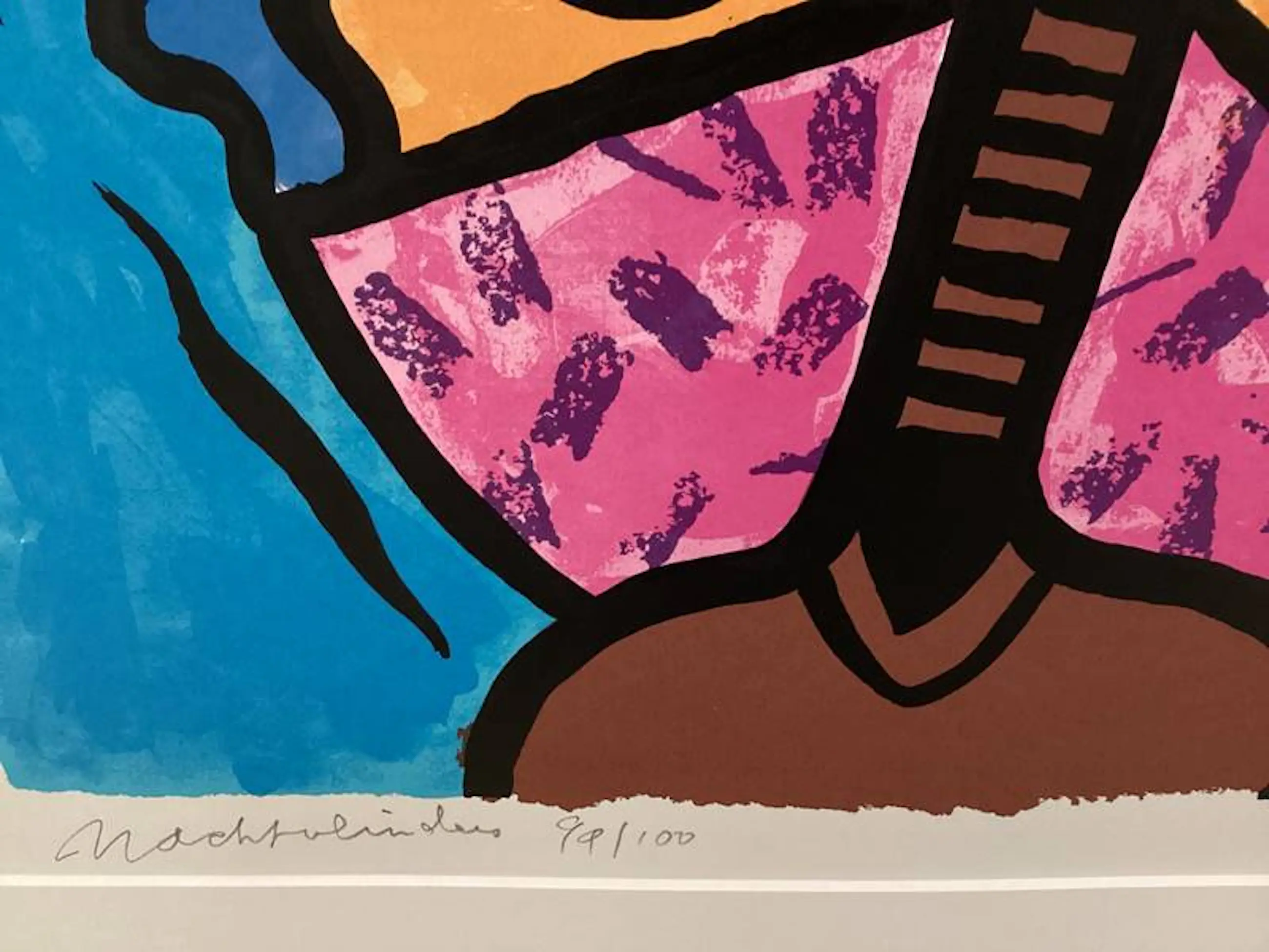 De zeefdruk ‘’Nachtvlinders” van Clemens Briels (Son 1946) komt uit 1991 en is met de hand gesigneerd en genummerd. De zeefdruk is ingelijst in een bijpassende zwarte houten lijst. De lijst heeft de afmetingen 95 x 2 x 85 cm. (h x b x l); de afbeelding is 63 x 62 cm.