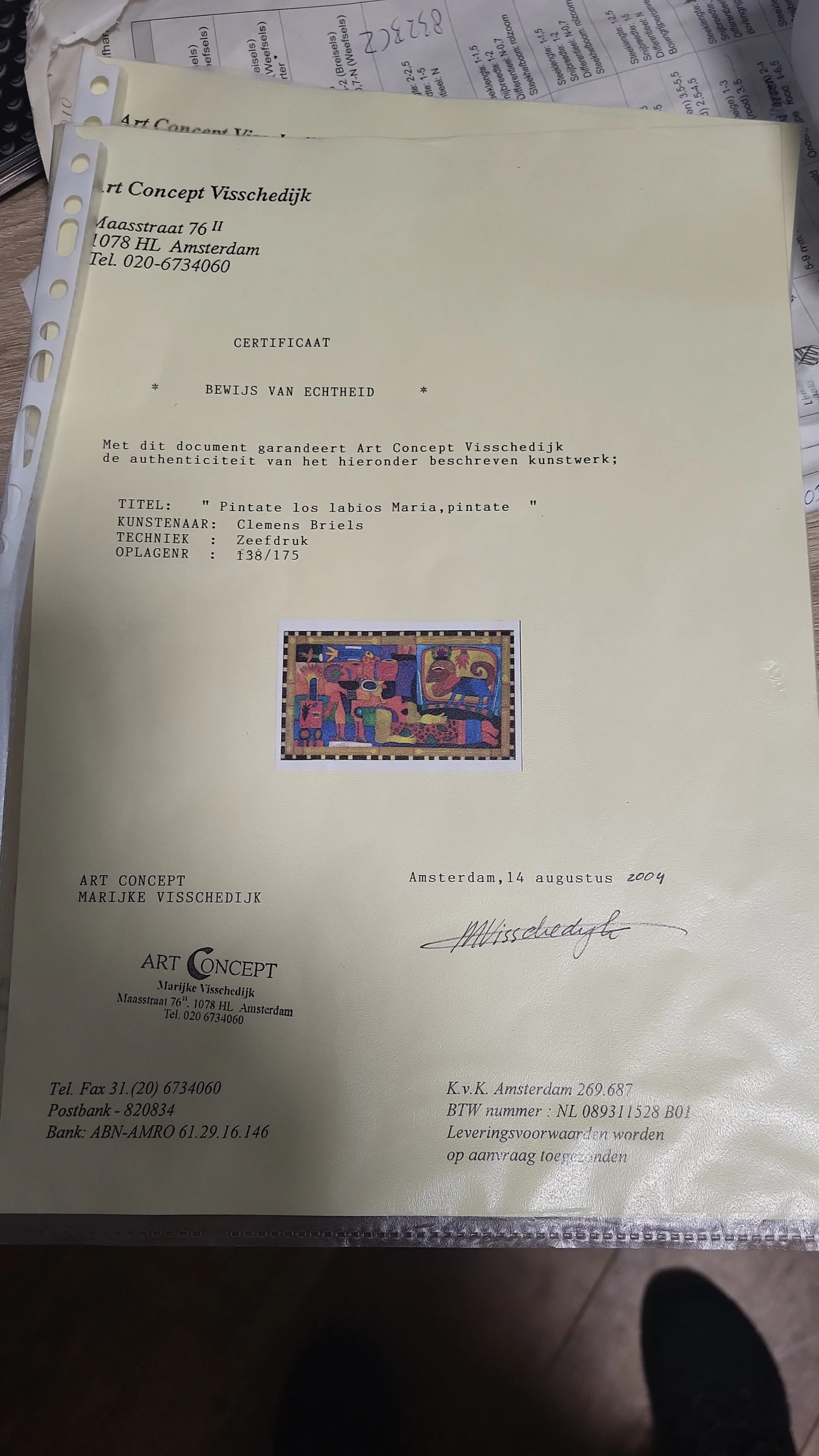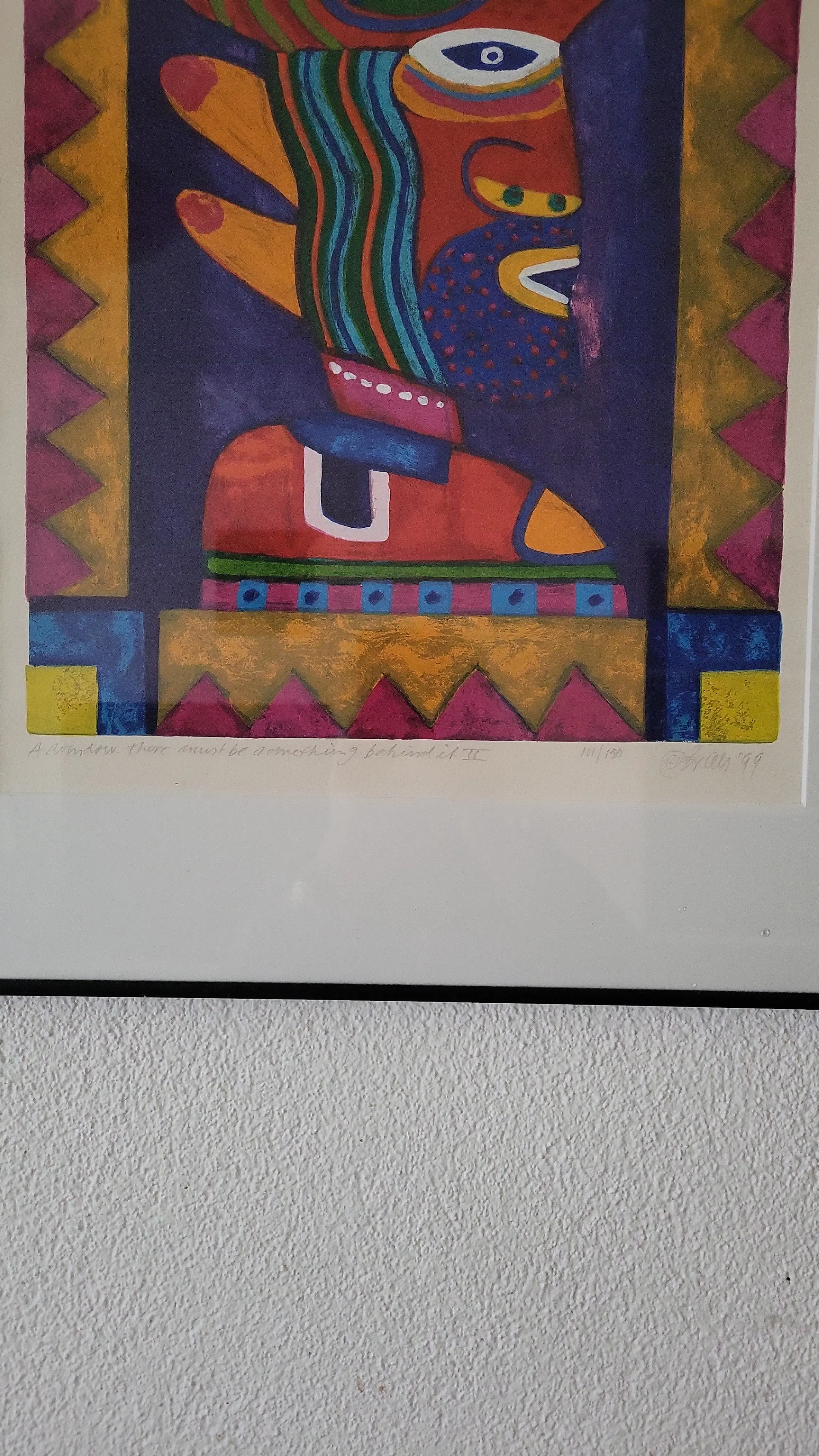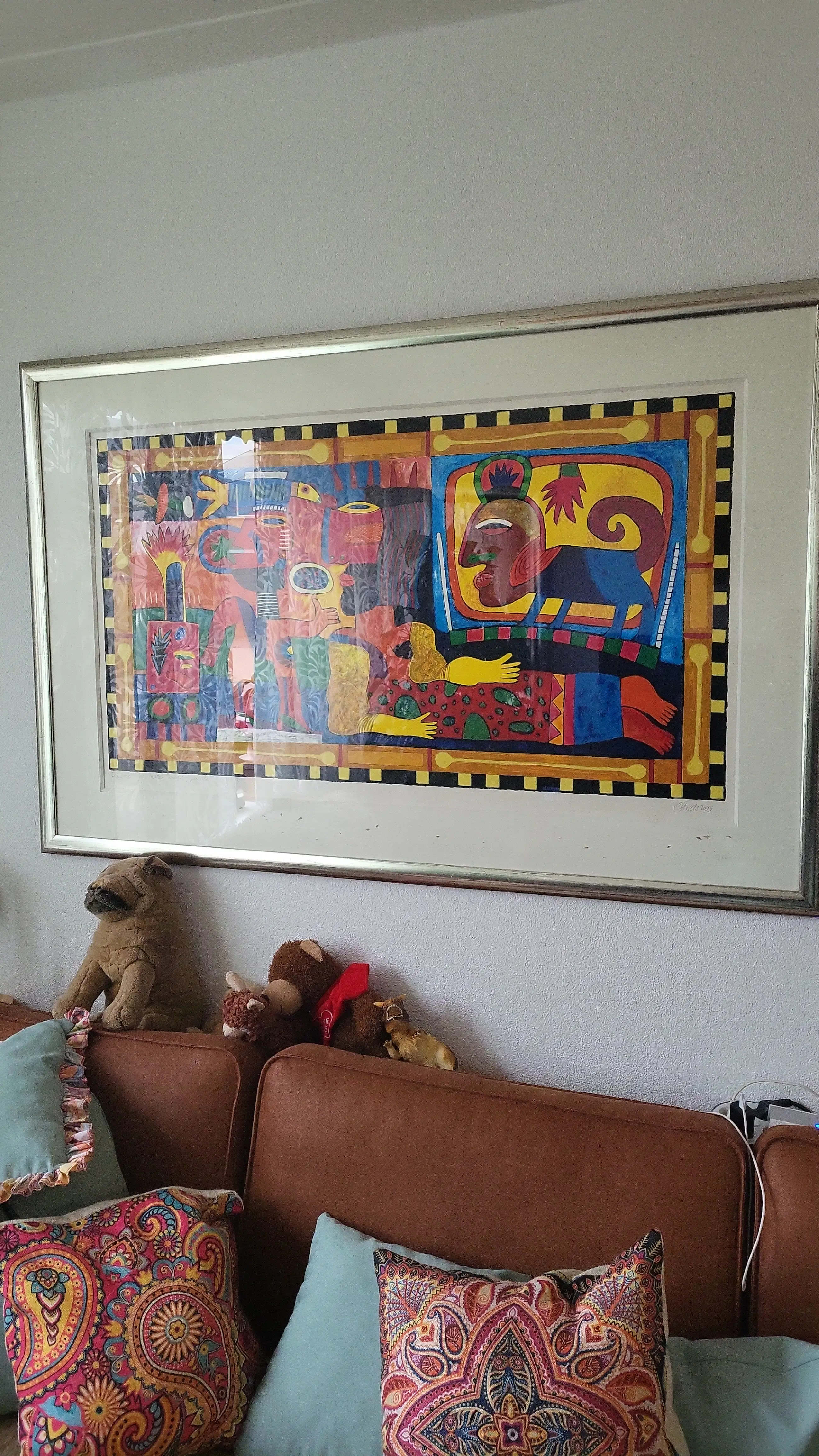 Vrolijke grote zeefdruk....mooi ingelijst... Er zit wat vuil aan de onderkant in de lijst...al denk ik 10 jaar....geen idee waar het vandaan gekomen is...het hangt al ruim 20 jaar op dezelfde plek. Certificaat van echtheid aanwezig