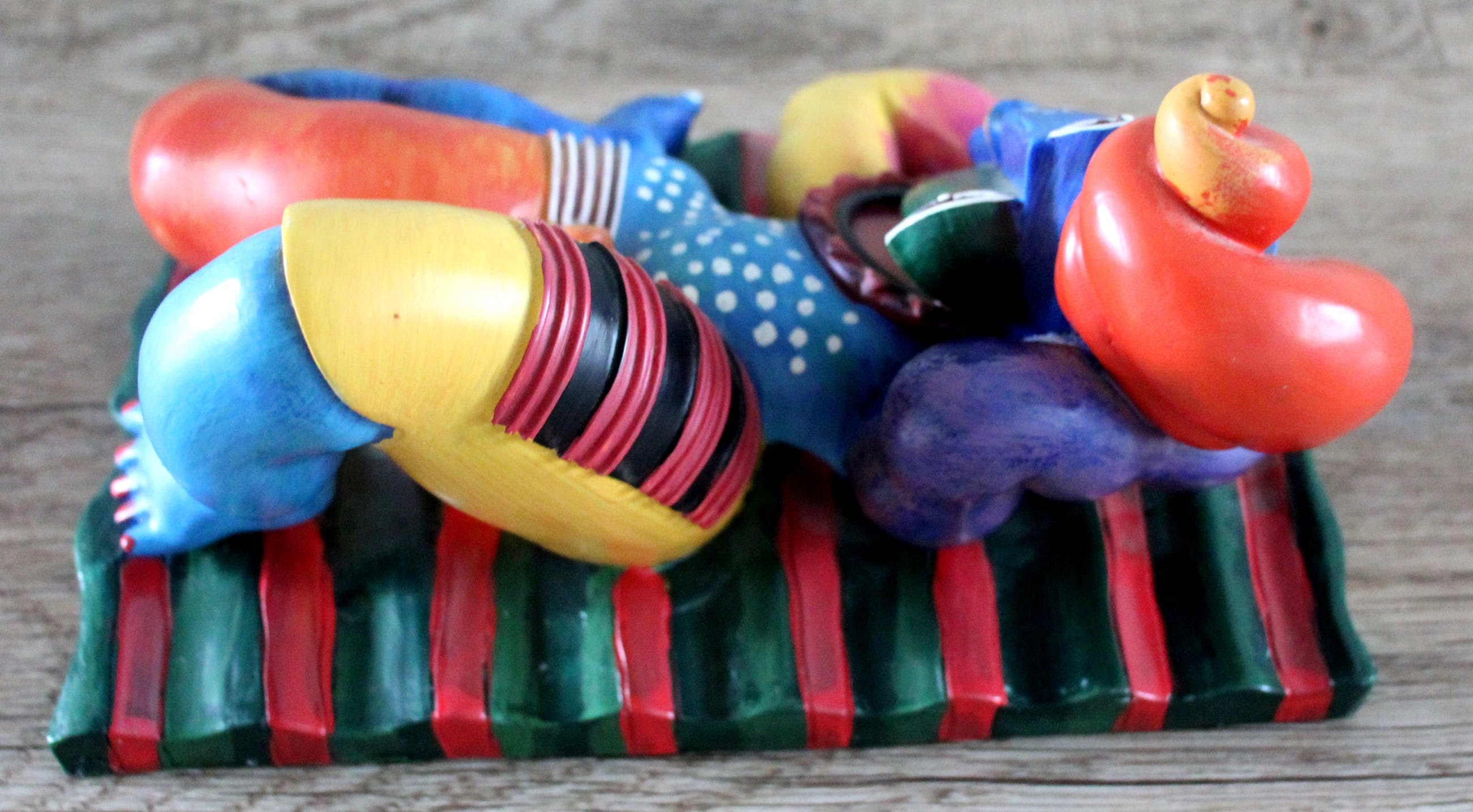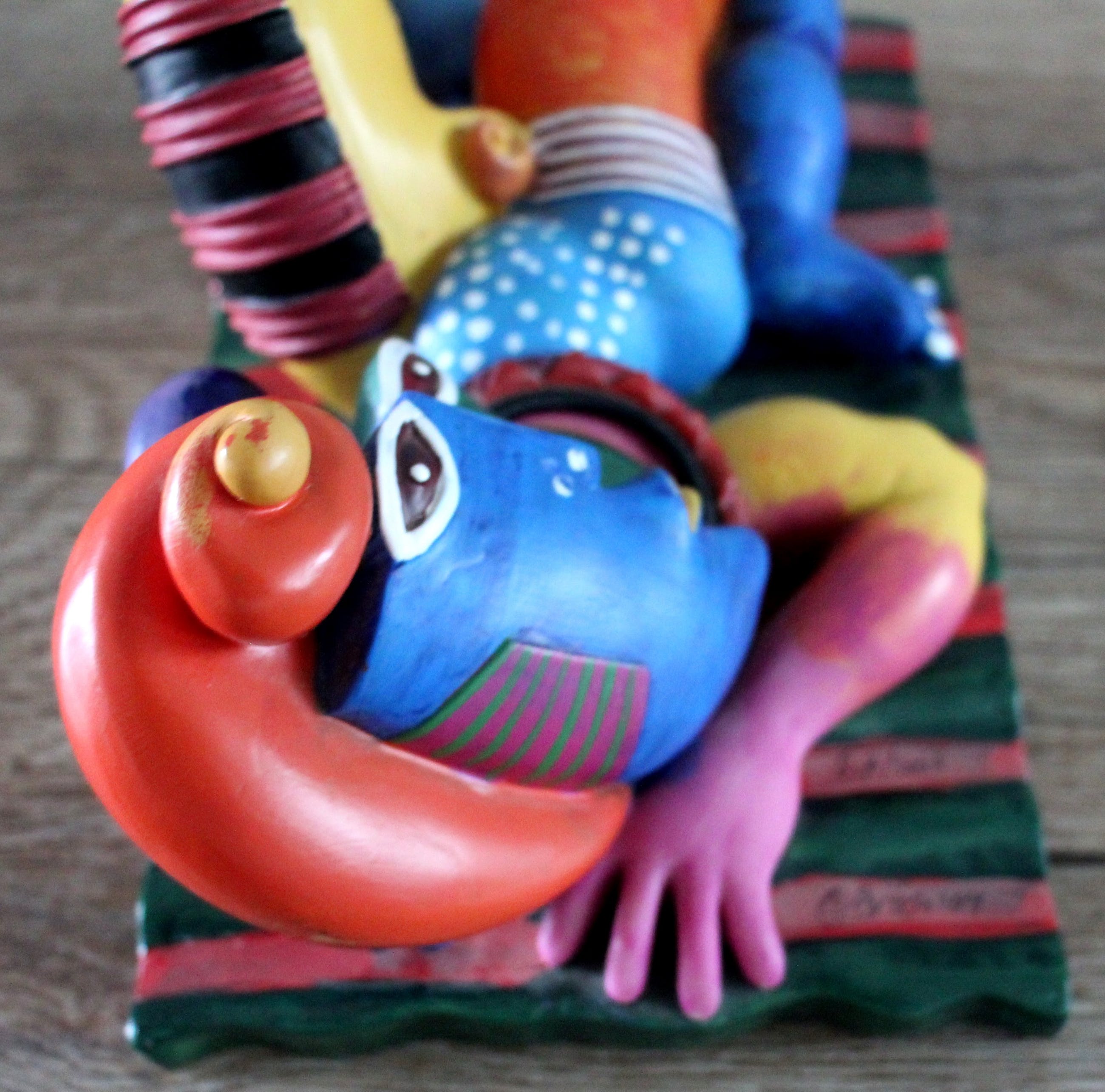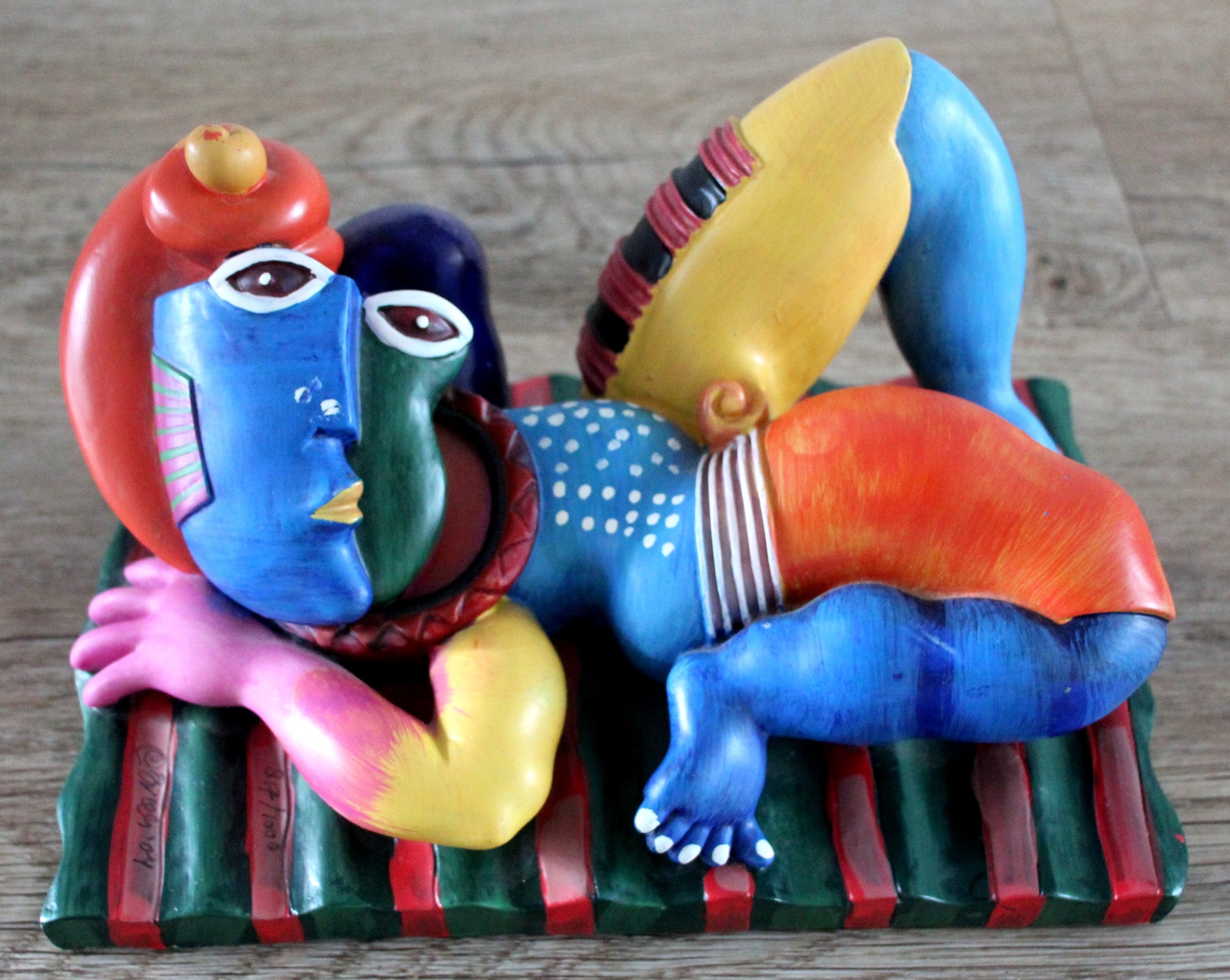 Deze sculptuur 'Un mediodia en la playa enamorada' heeft Clemens Briels in 2004 speciaal ontworpen in opdracht van Ford Nederland. Clemens Briels is momenteel een van de toonaangevende Nederlandse kunstenaars met vele exposities wereldwijd. Zijn werk wordt gekenmerkt door typische herkenbare vormen en kleurgebruik, deels geïnspireerd op Zuid Amerikaanse culturen. Het materiaal is handbeschilderd kunsthars. De sculptuur is in zeer goede staat. Deze sculptuur is 11 cm hoog, 14 cm breed en 20 cm lang en is gesigneerd door de kunstenaar. De authenticiteit van het aangeboden werk wordt volledig gegarandeerd. Een certificaat van echtheid kan, op aanvraag, worden gemaild. Het is een fraai beeld met de typische Briels kleurstelling. Het beeld is in gelimiteerde oplage gemaakt en heeft no. 817/1000. De sculptuur is dus vrij zeldzaam.