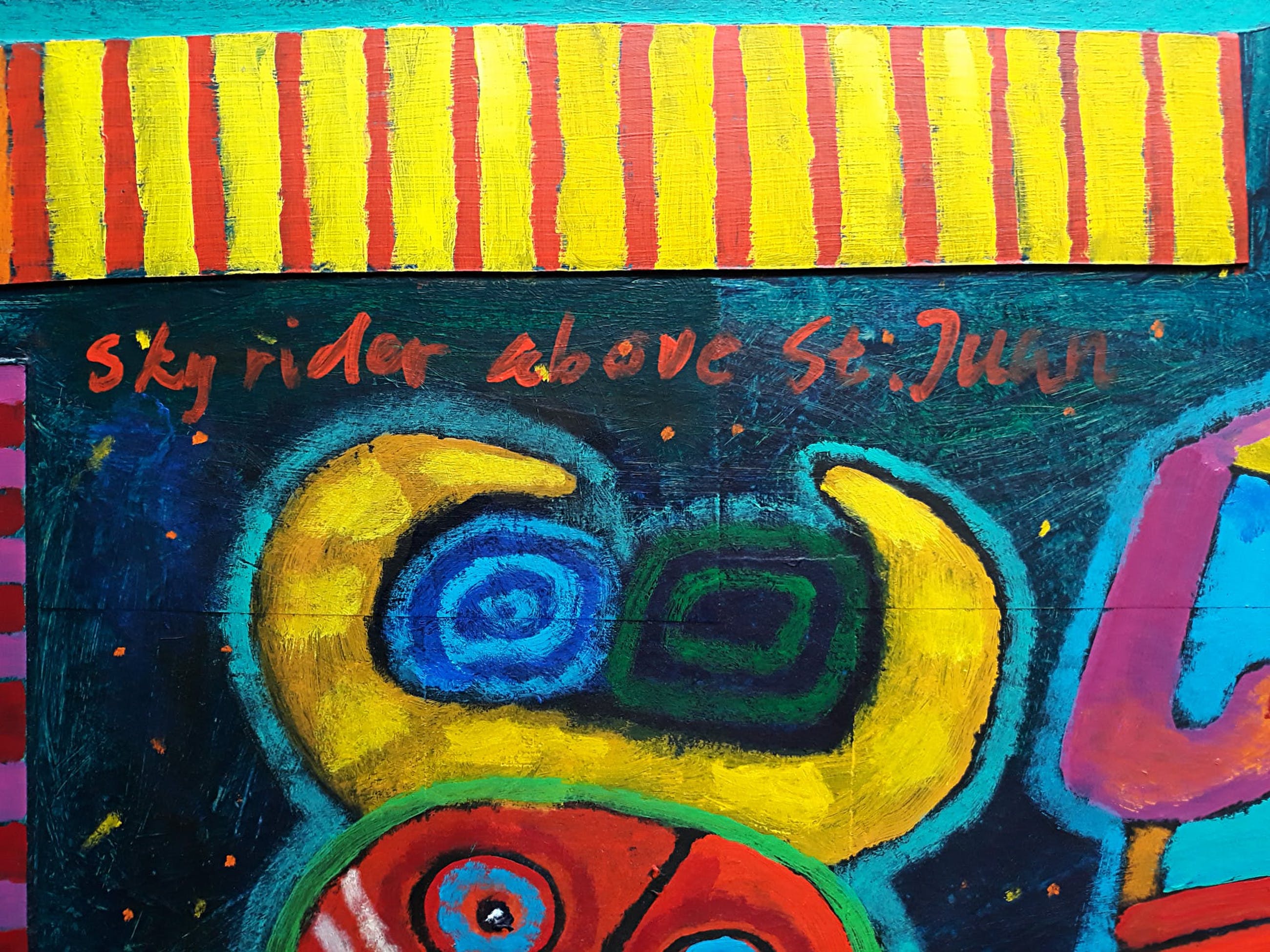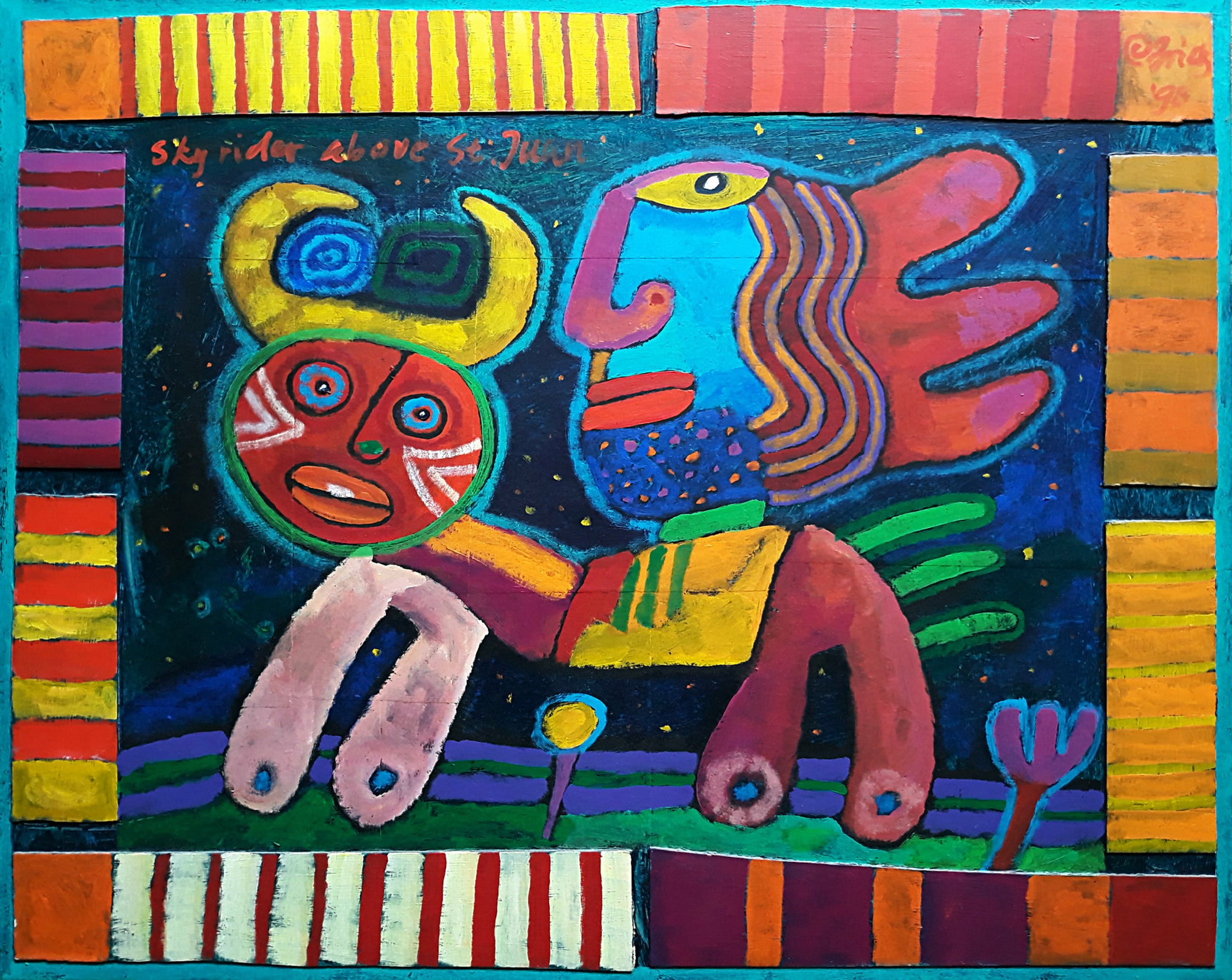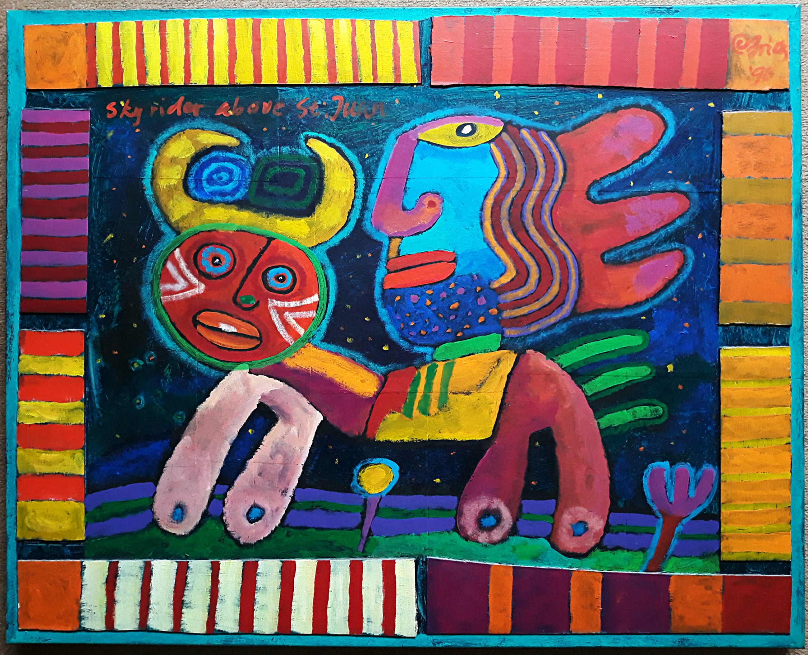 Zeer herkenbaar werk van Clemens Briels, een explosie van kleur in een Latijns-Amerikaans setting. Acrylverf op collage op doek, rechtsboven gesigneerd en gedateerd (’98), linksboven getiteld. Op een zeer solide spieraam en over de zijkanten heen geschilderd, kan/moet dus zo opgehangen worden. In zeer goede conditie.