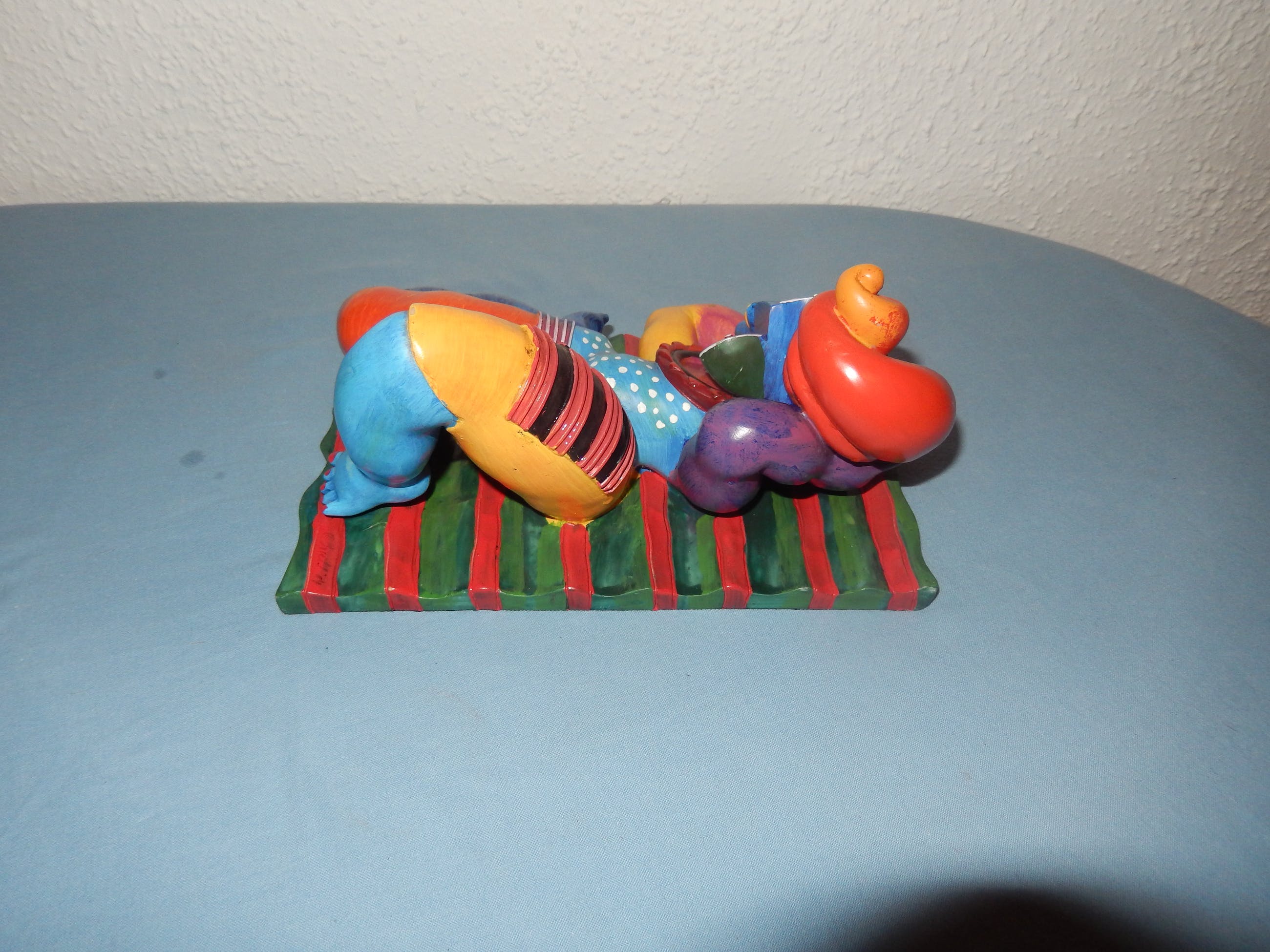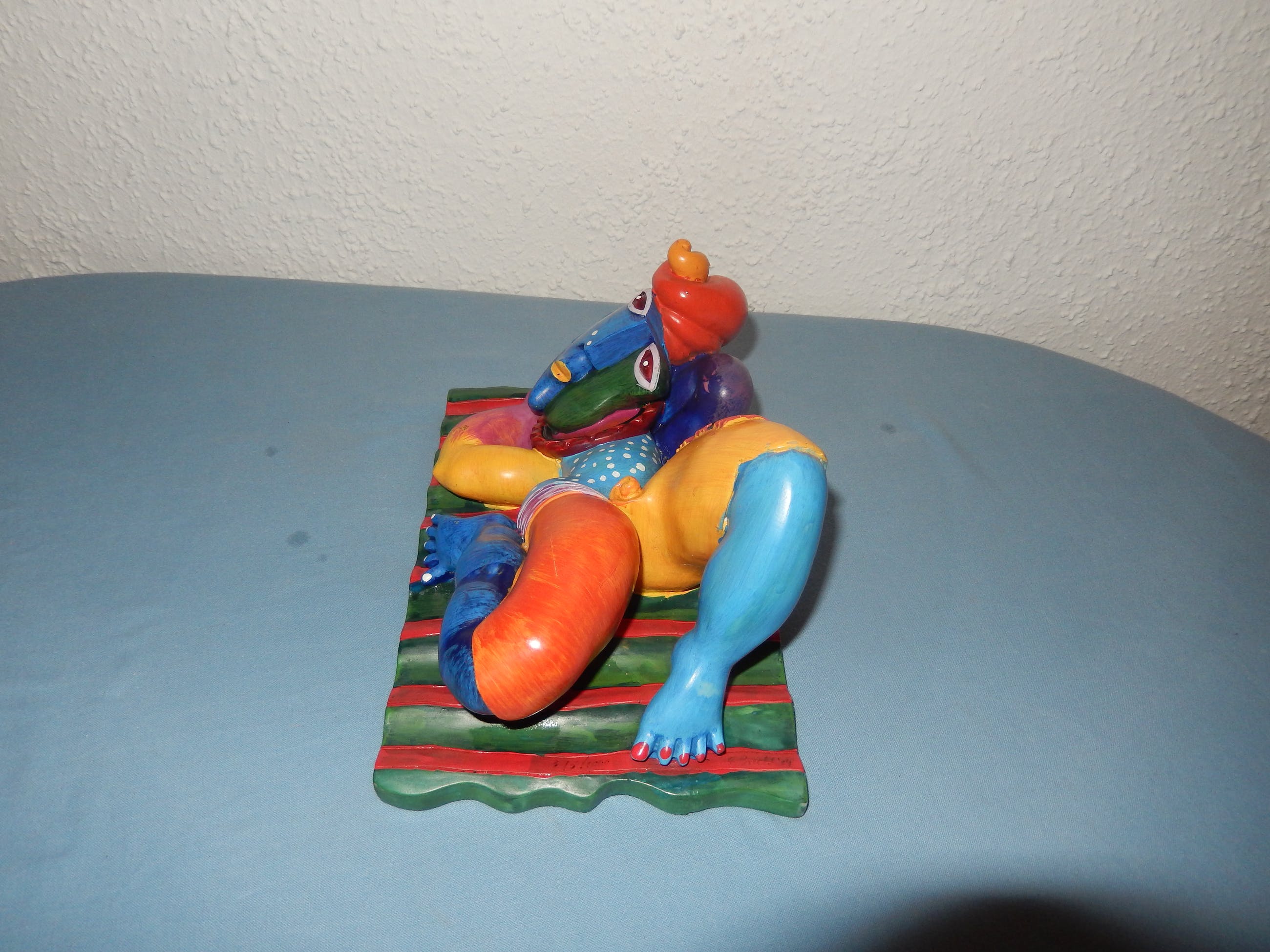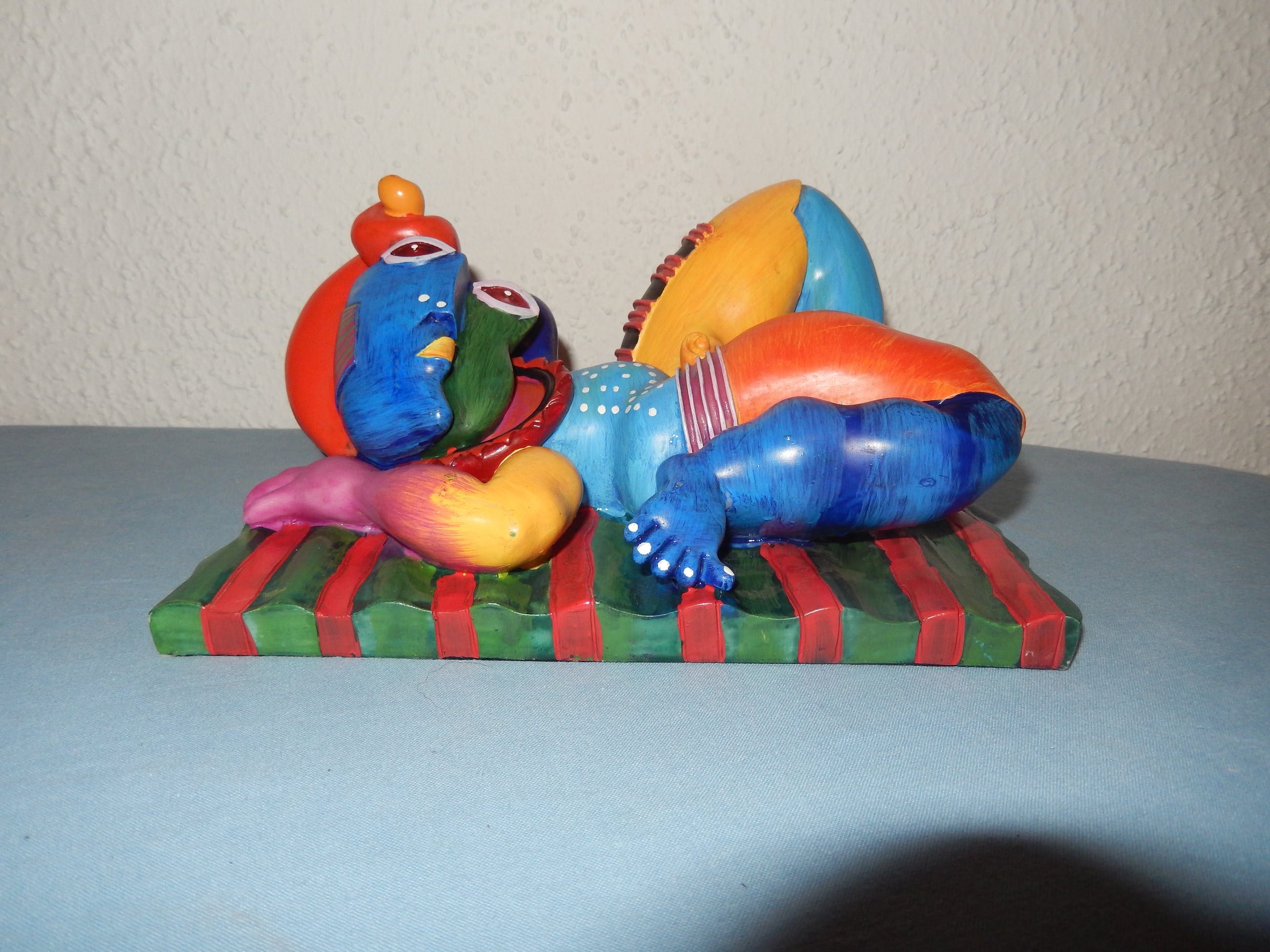 De sculptuur is gesigneerd en genummerd , echter het nummer is vervaagd. Het materiaal is handbeschilderd kunsthars. De sculptuur is in redelijk goede staat. Wordt zorgvuldig verpakt, aangetekend verzonden.