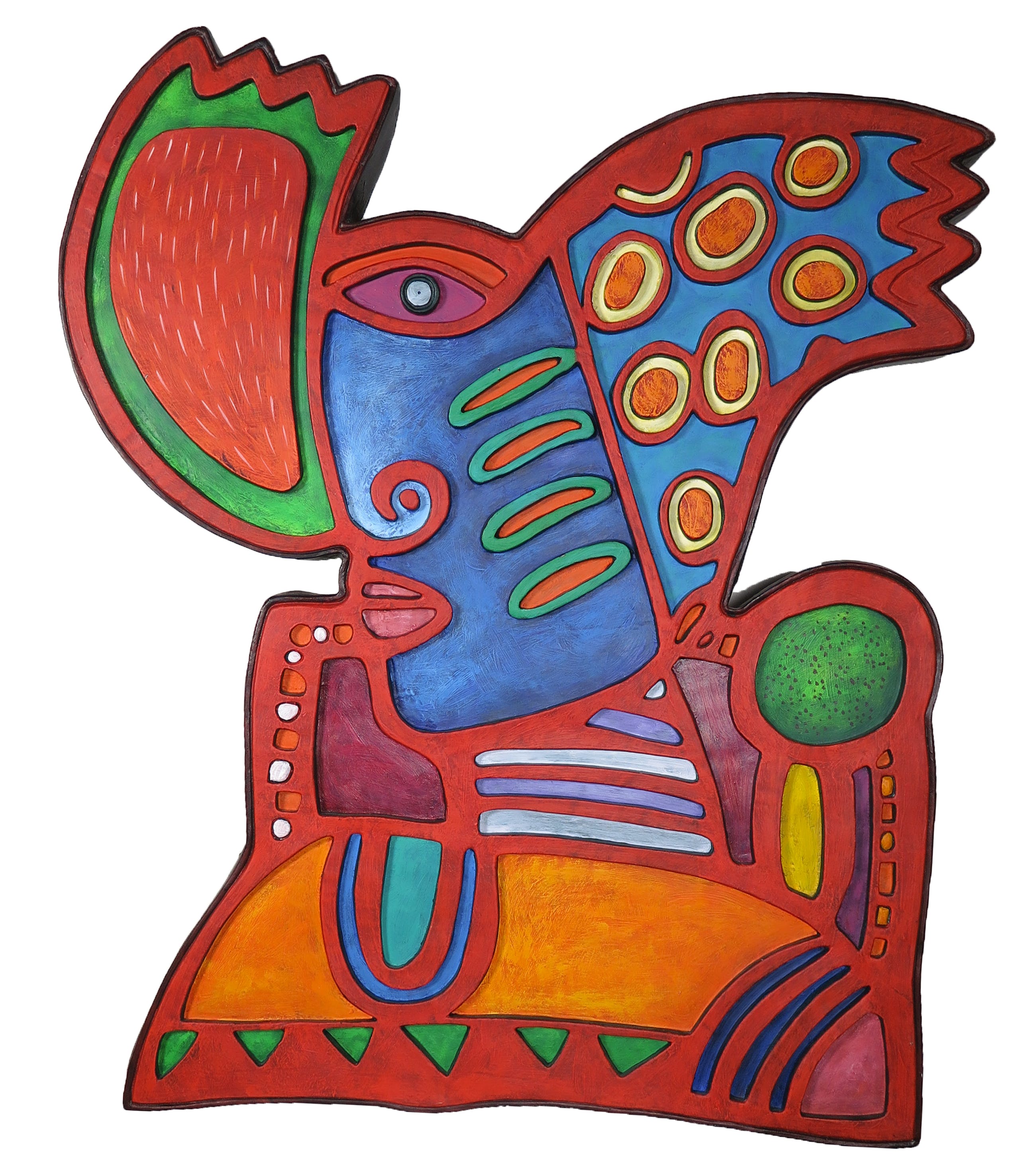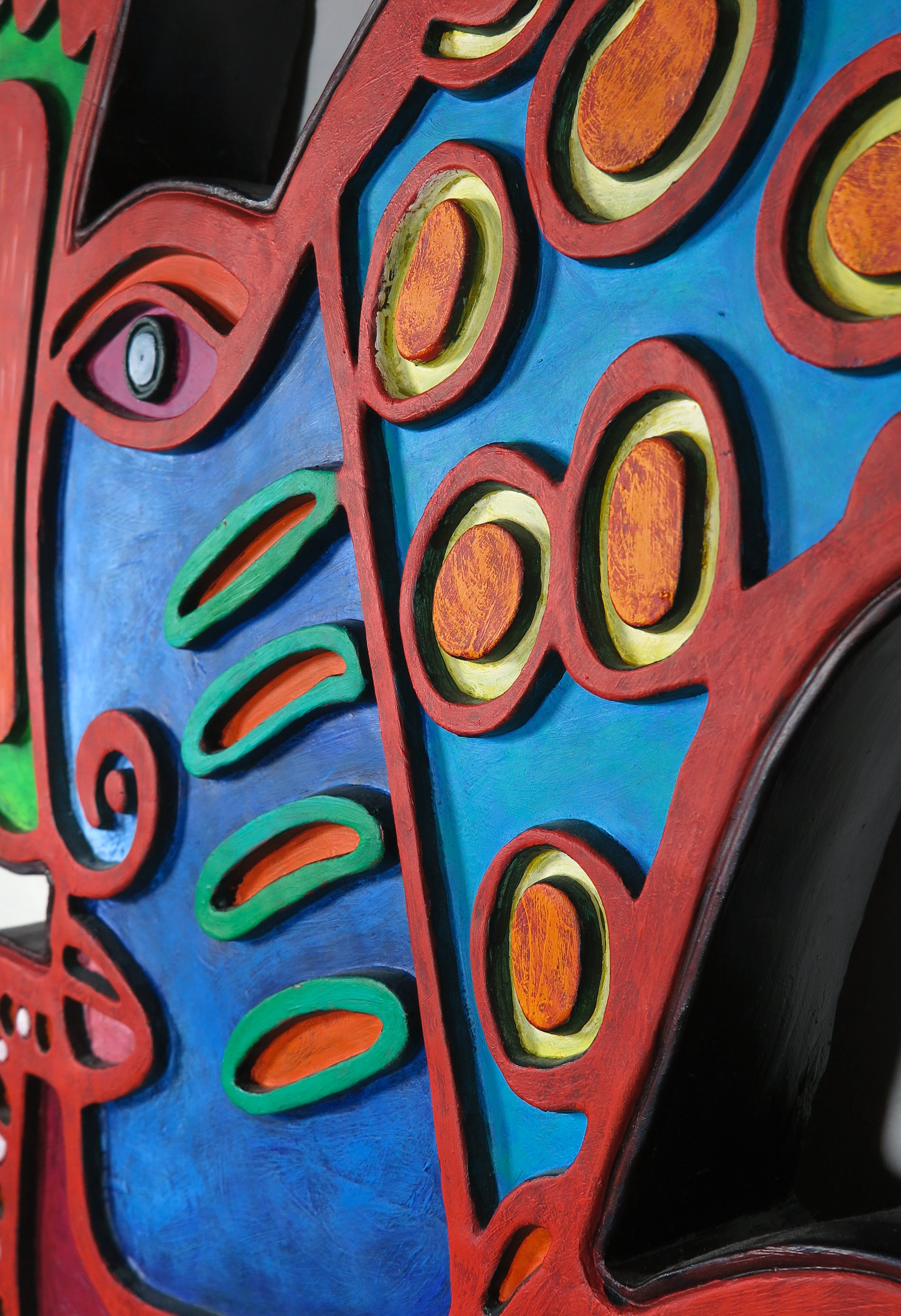 Groot kleurrijk sculptuur, gemaakt van een soort kunsthars.