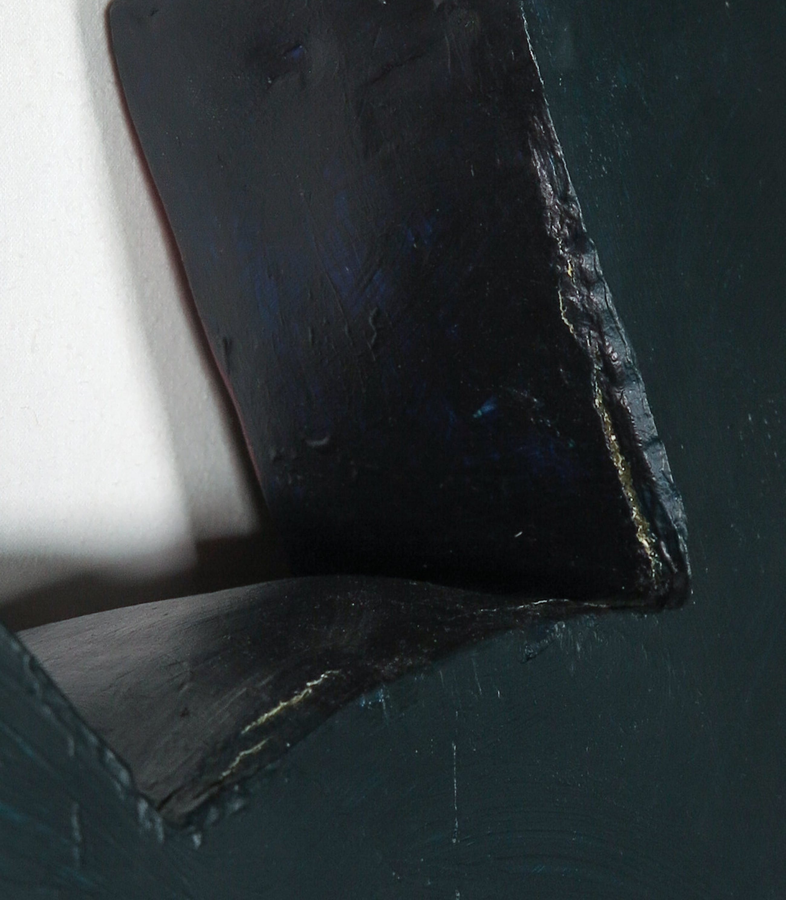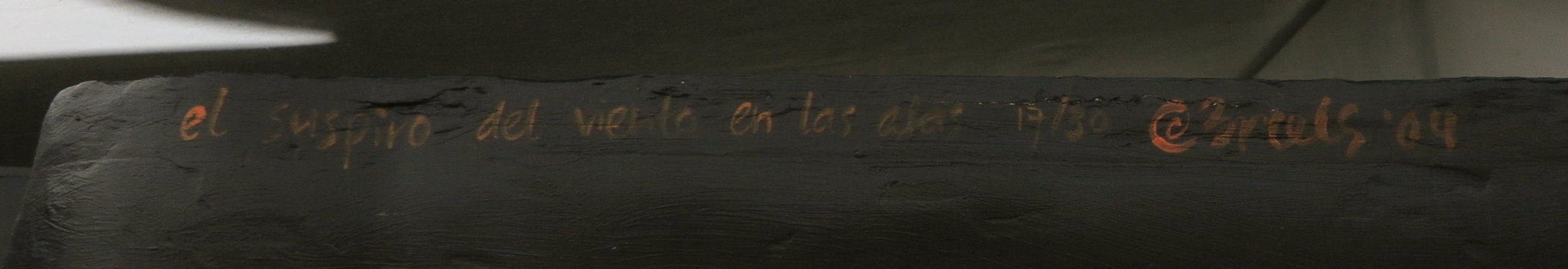 Wat stof en enkele slijtageplekjes aan de achterzijde (doordat het sculptuur is ophangen, zoals bedoeld). Aan de achterzijde ook een scheurtje op de rand (zie laatste foto). Twee minuscule plekjes aan de voorzijde op de randen. | |