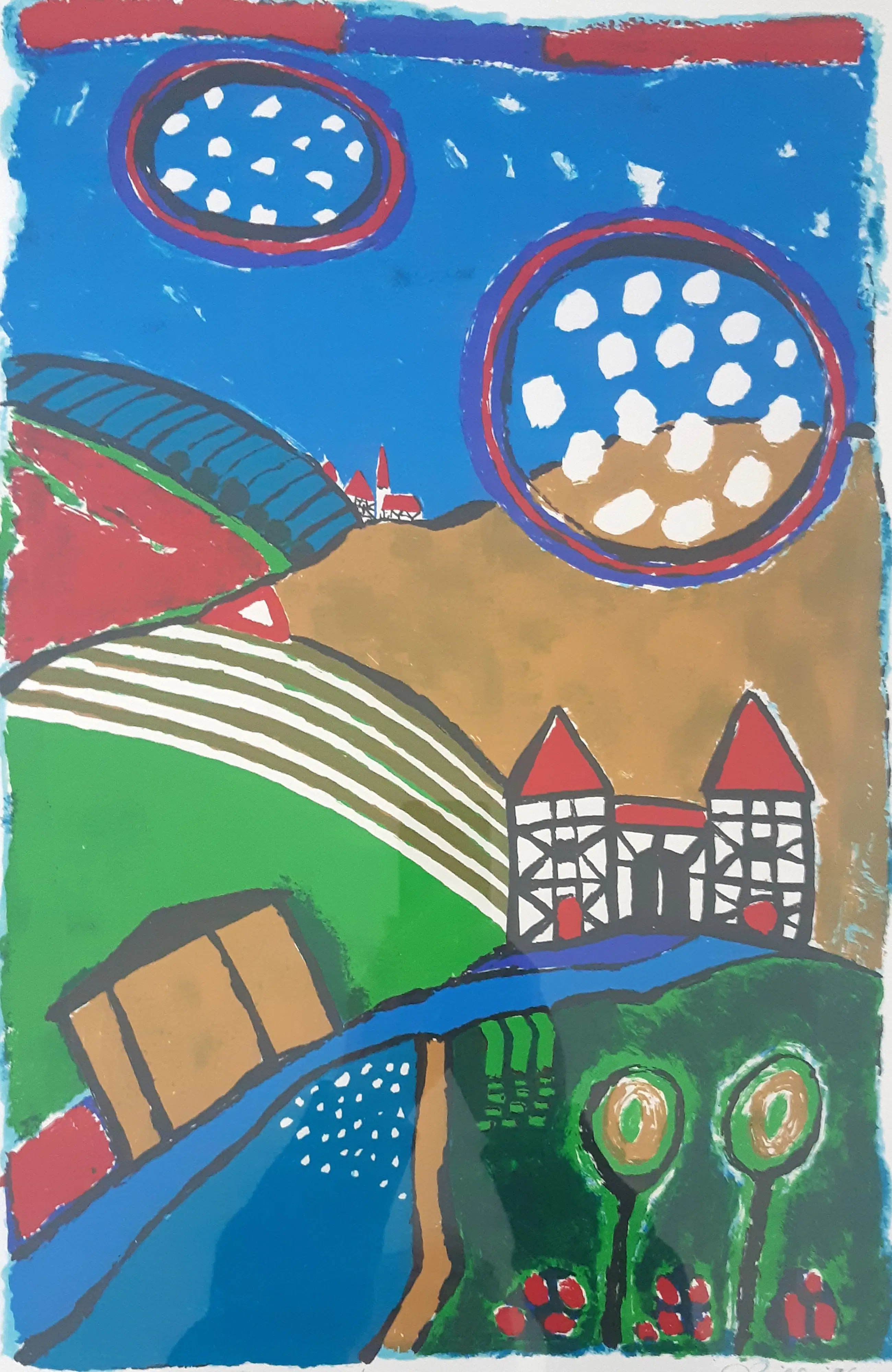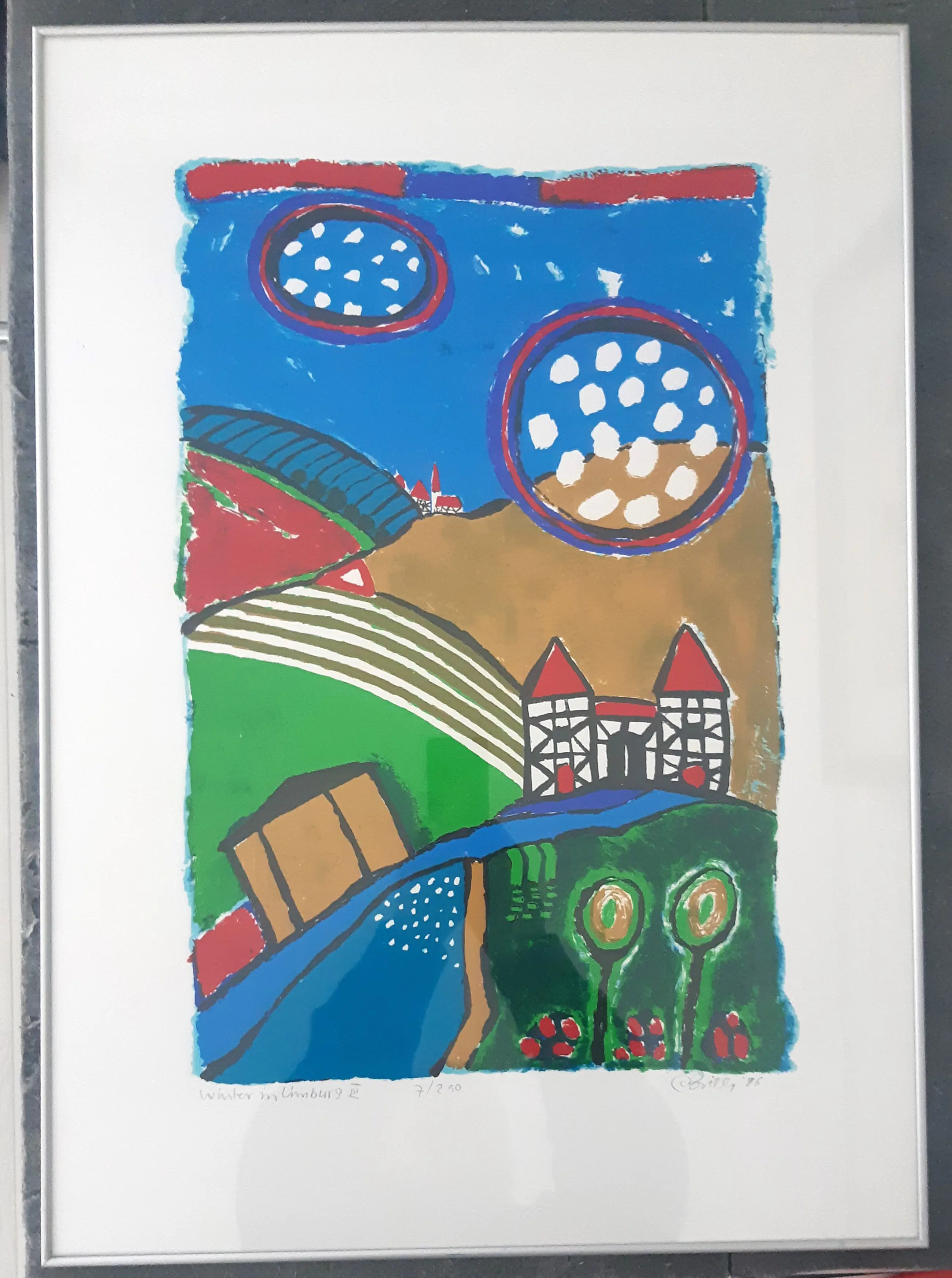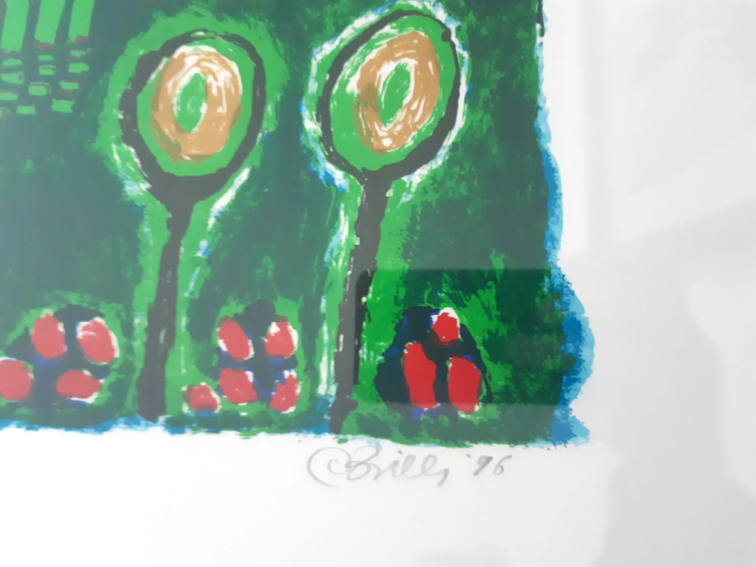 Kleurrijke zeefdruk van Clemens Briels, een van de 4 jaargetijden die hij afbeeldde. De zeefdruk is met potlood voorzien van signatuur, titel, oplagenummer en datering. Ingelijst in aluminium lijst. Het geheel verkeert in nieuwstaat. Op de foto's zijn reflecties zichtbaar.