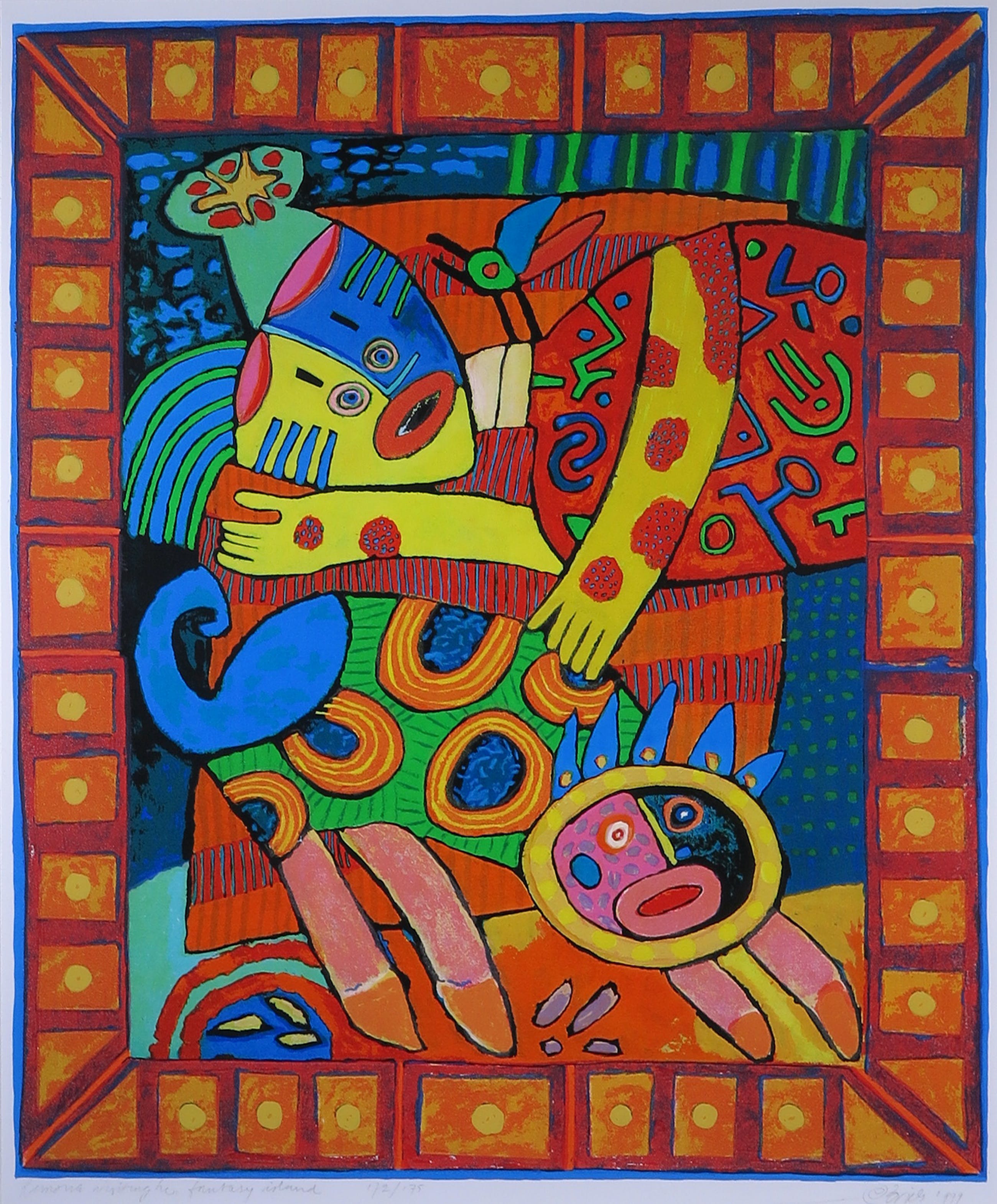 Groot en kleurrijk werk van Clemens Briels. In de linkeronderhoek staat 'Ramona visiting her fantasy island' geschreven. Ook het oplage nummer (172) en signatuur zijn vermeld.