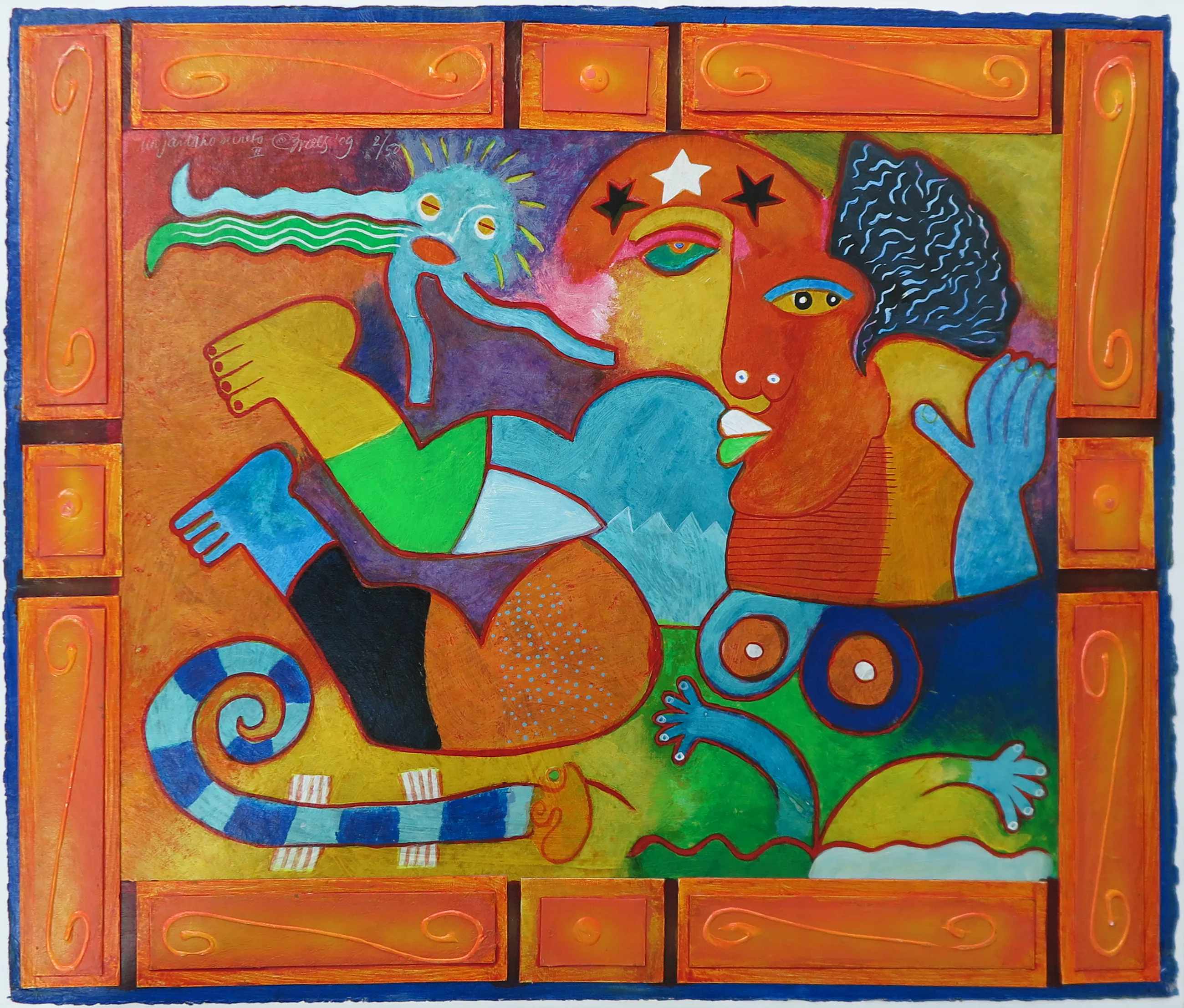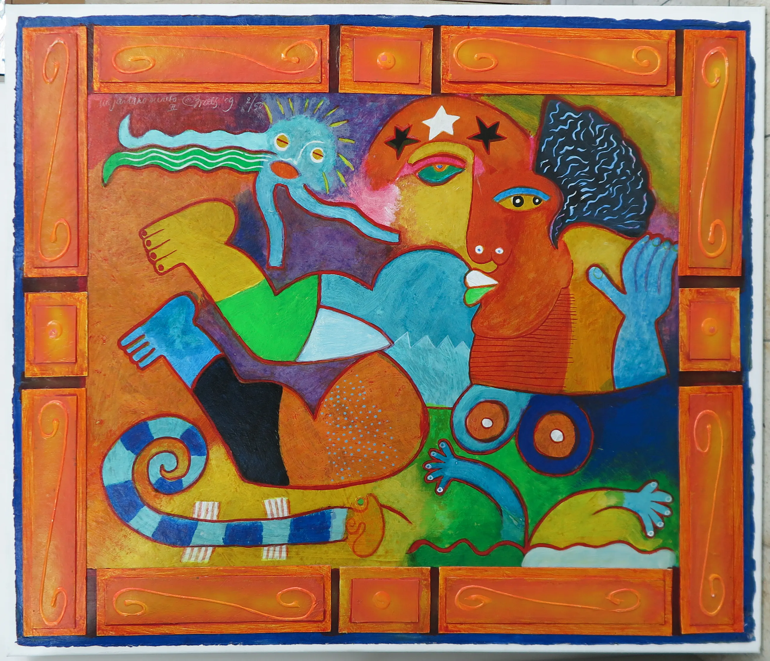 | Goede conditie. Paar plekjes langs de randen van het doek en een paar kleine slijtageplekjes in het beeld.In het gezicht van het figuur een krasje. | |