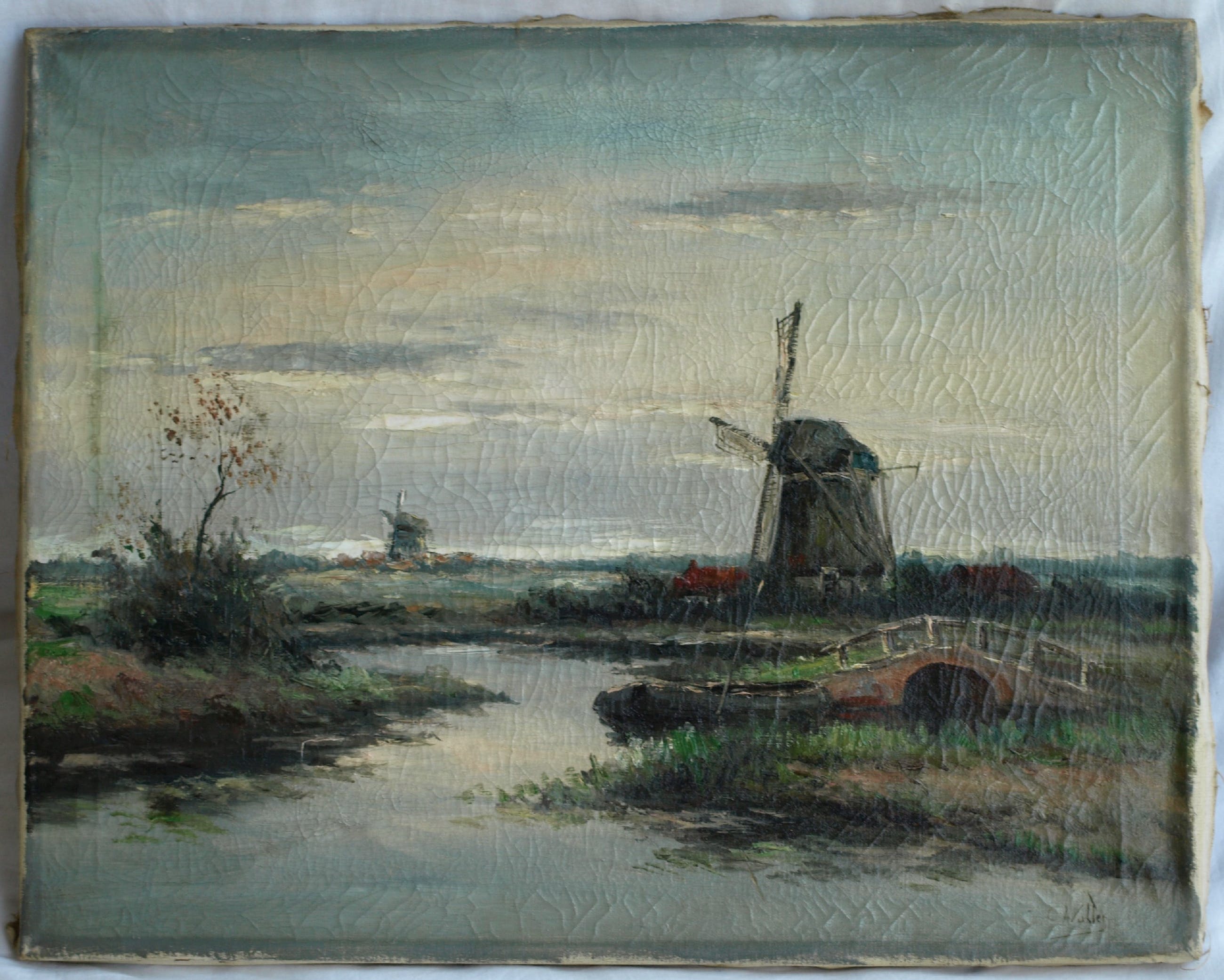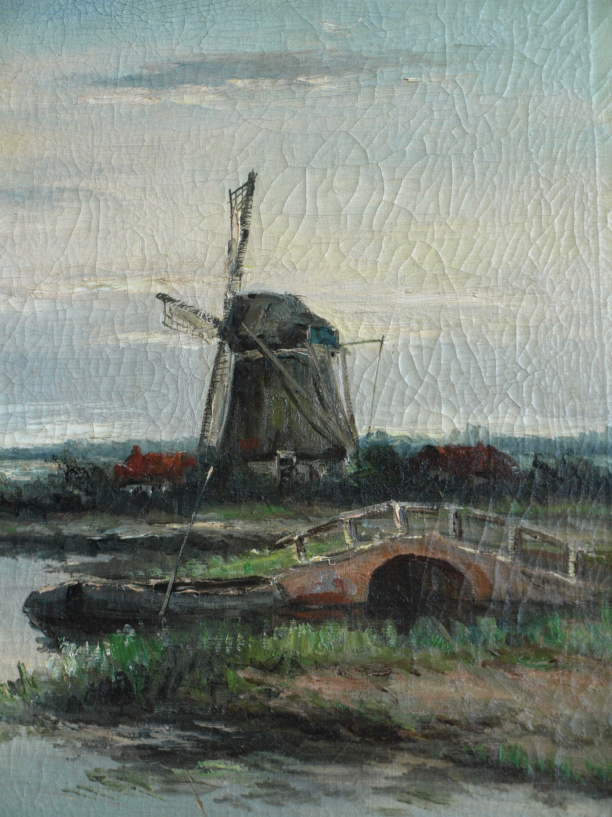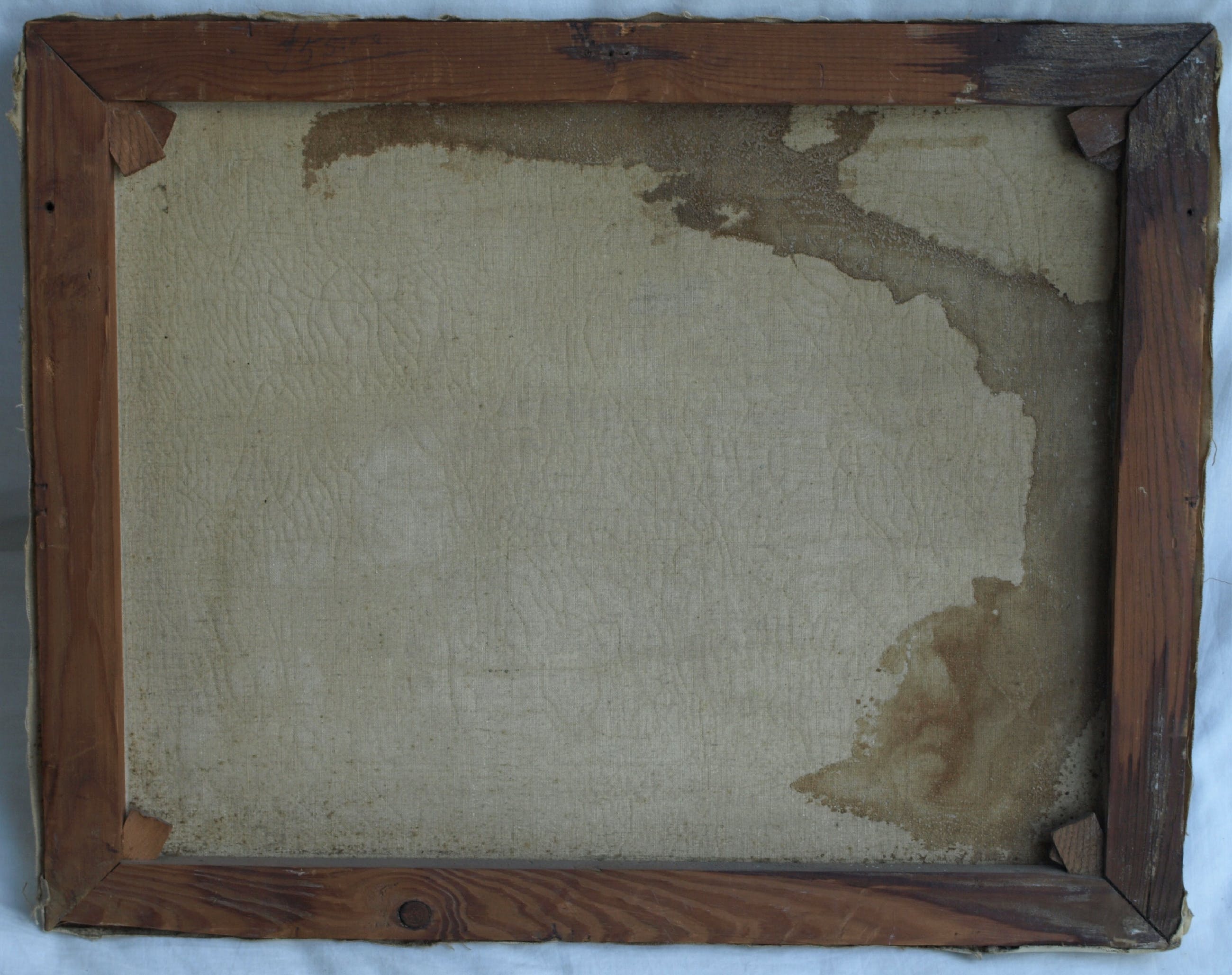 -Conditie: Het doek heeft veel craquelé en te zien zijn de ‘drukranden’ van het houten spieraam. Ook heeft het werk plekjes die zijn gerestaureerd / bijgeschilderd. Het doek heeft (vocht)vlekken aan de achterkant.