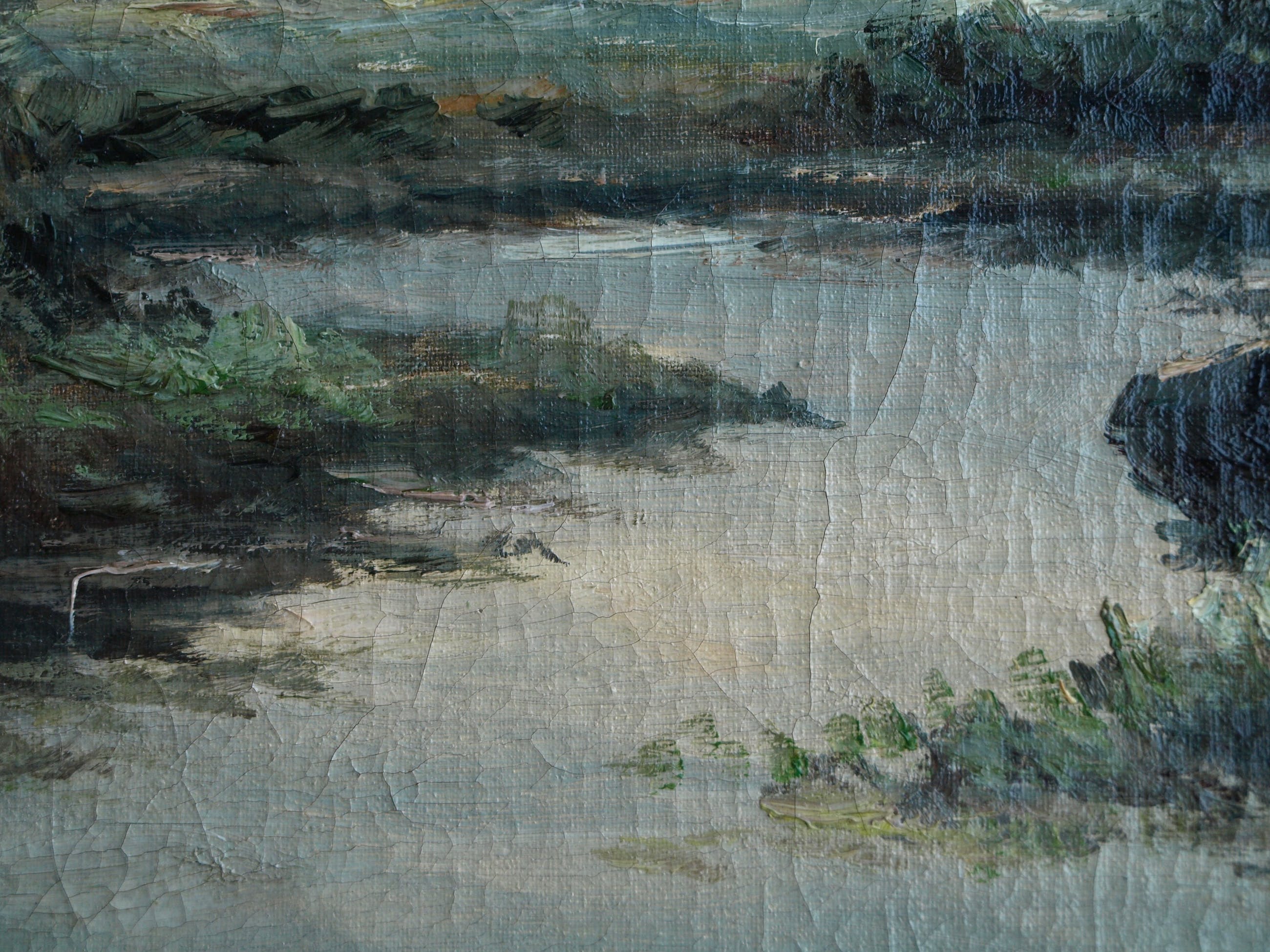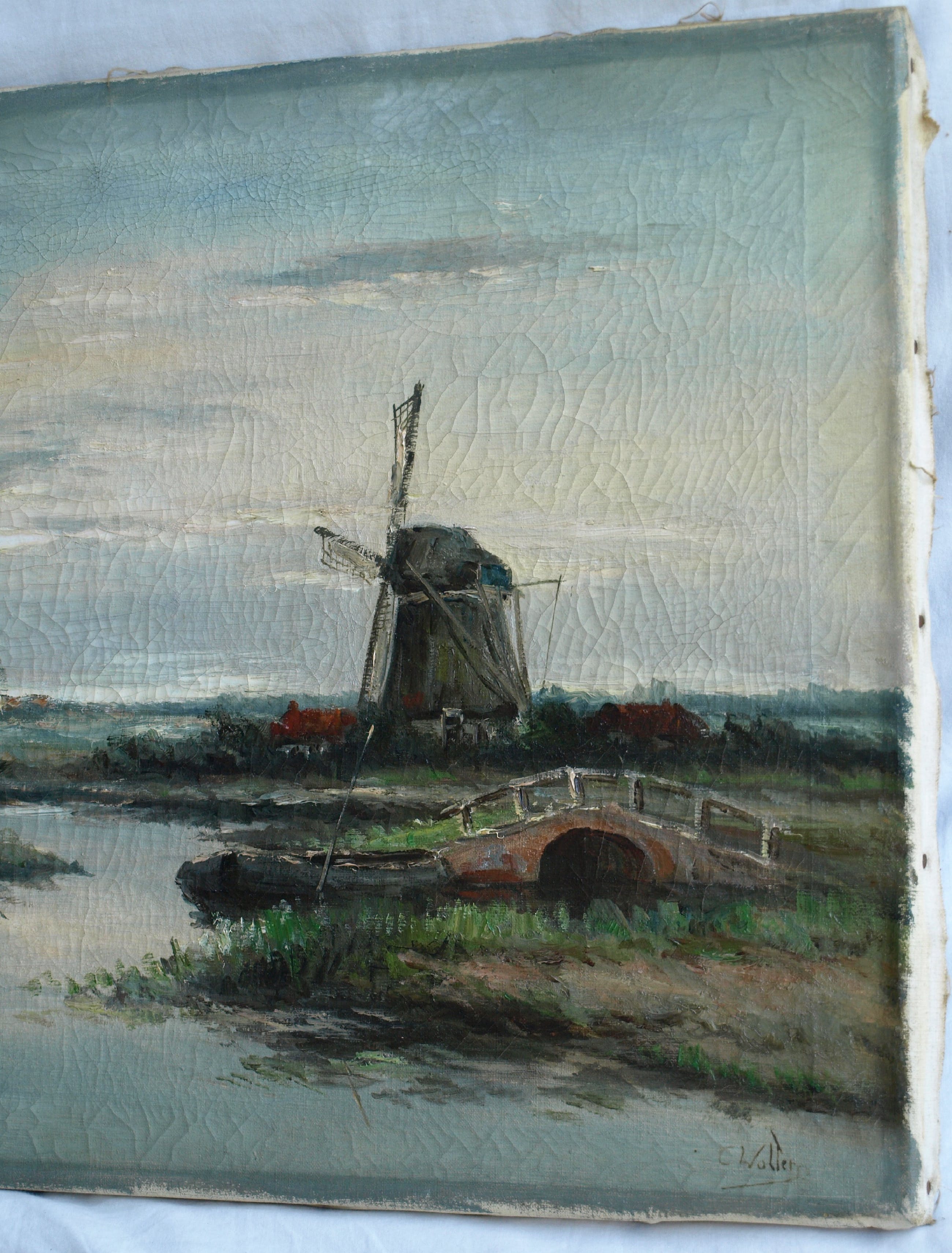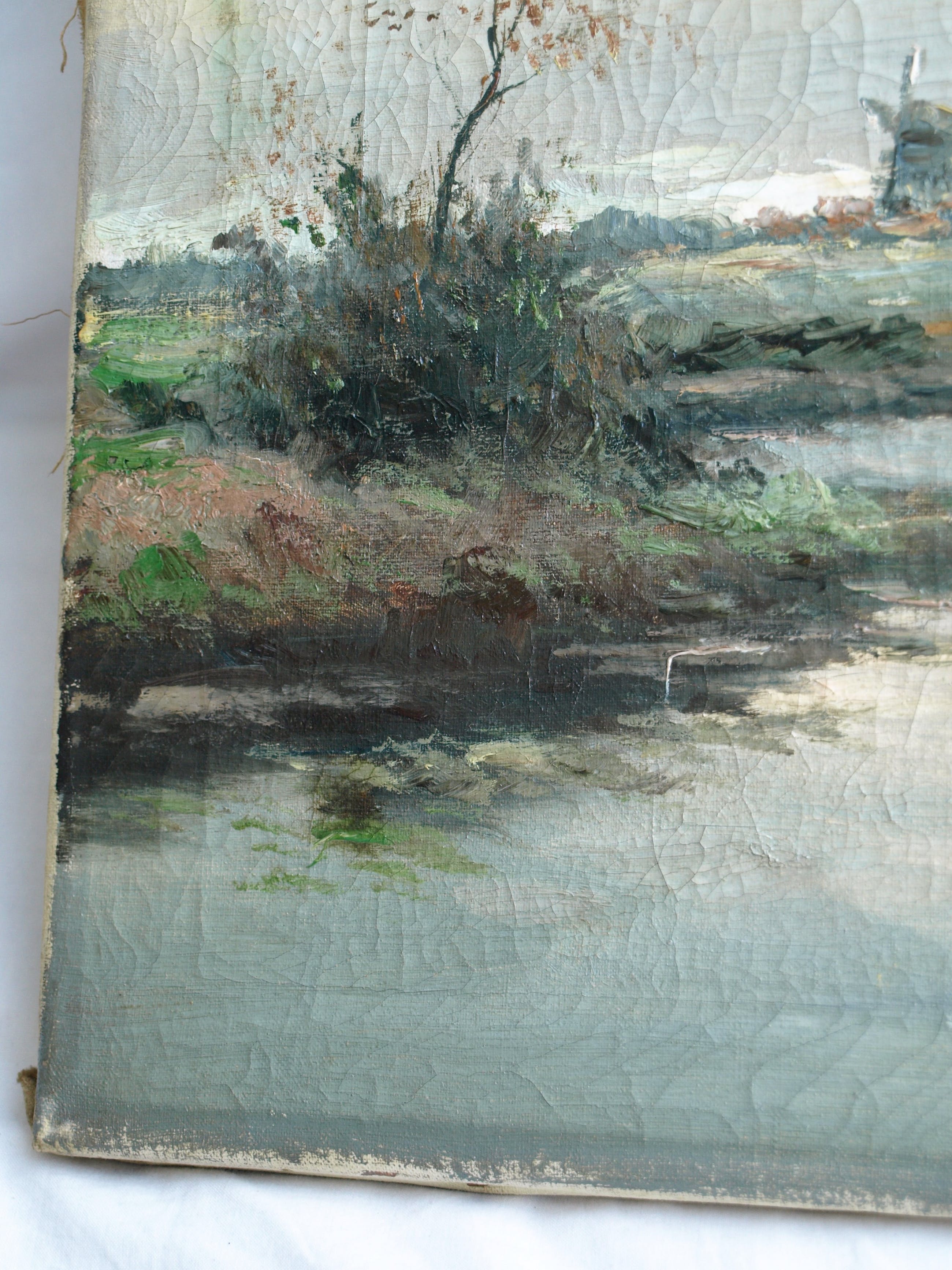 -Conditie: Het doek heeft veel craquelé en te zien zijn de ‘drukranden’ van het houten spieraam. Ook heeft het werk plekjes die zijn gerestaureerd / bijgeschilderd. Het doek heeft (vocht)vlekken aan de achterkant.
