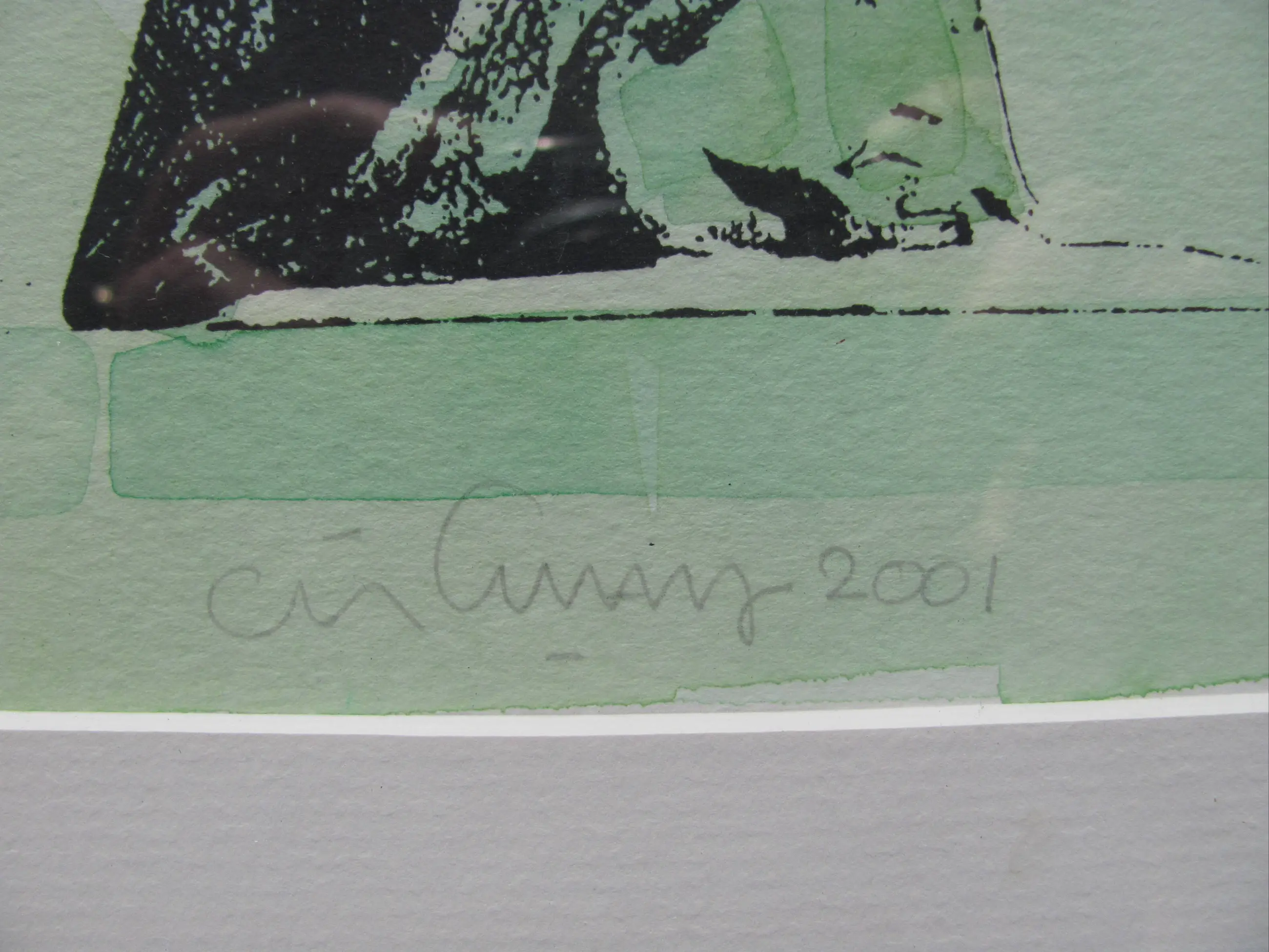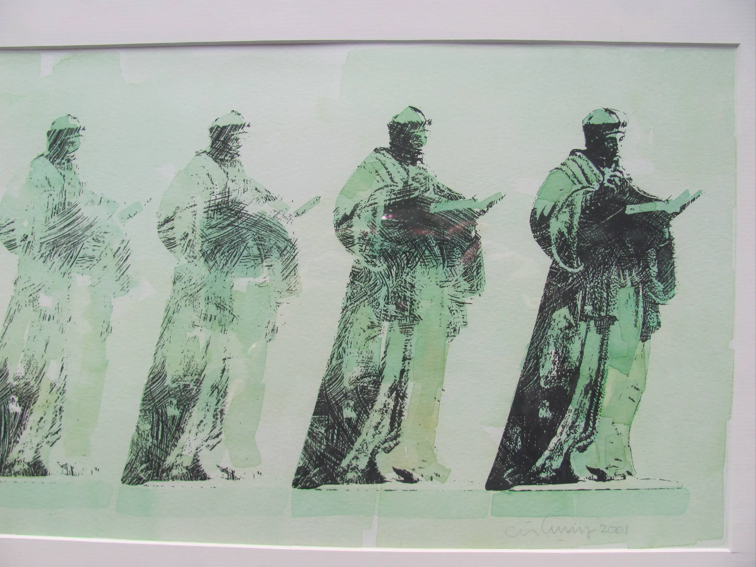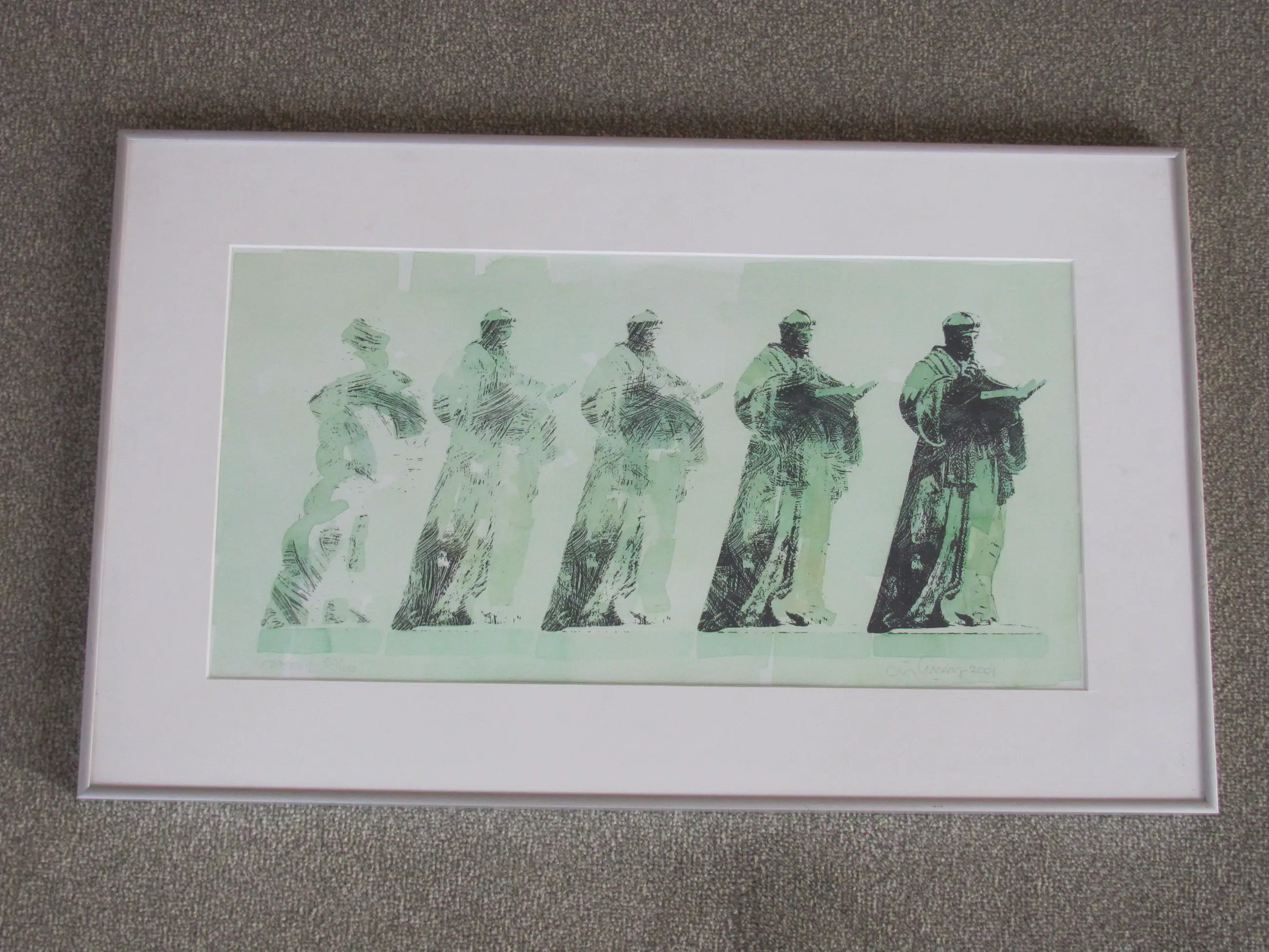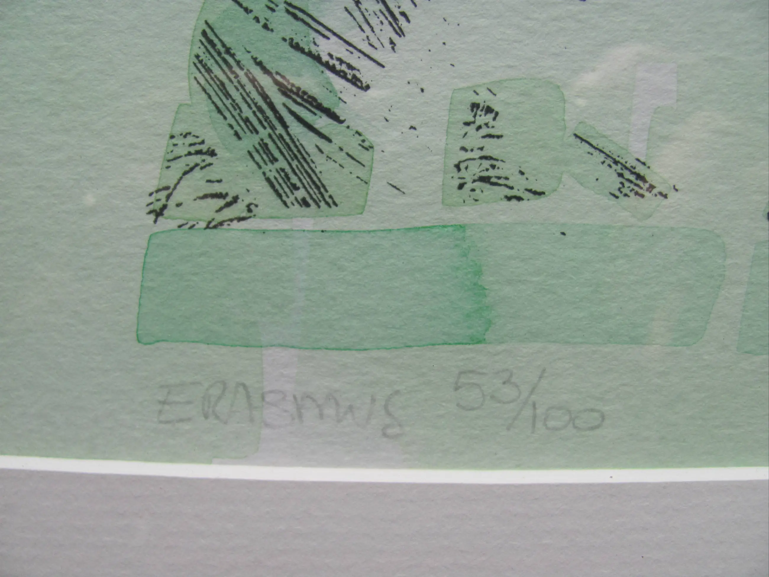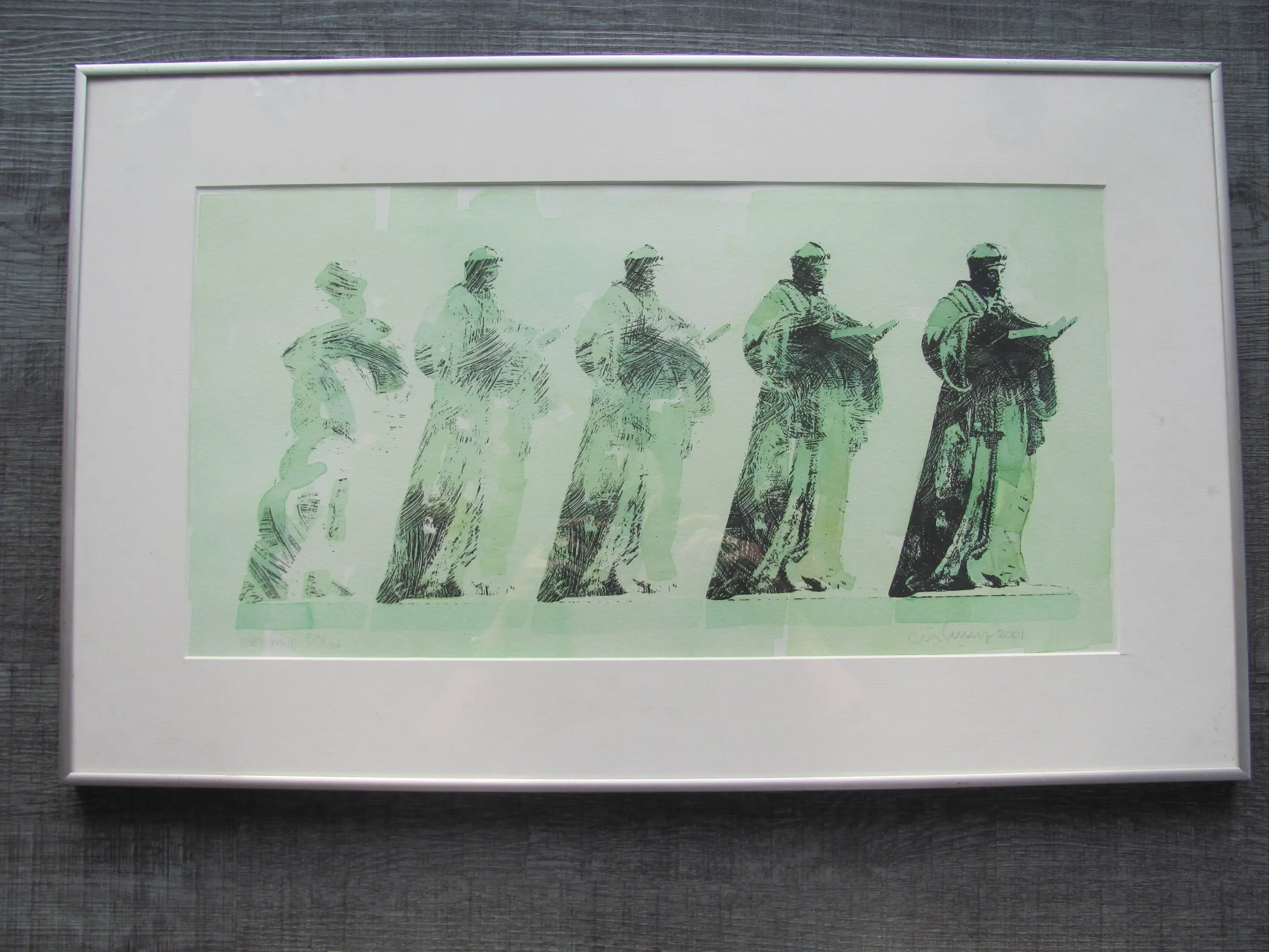 Zeefdruk van Clemens Zijlmans uit 2001van het standbeeld van Erasmus in Rotterdam. In mooie staat, in de originele lijst.
