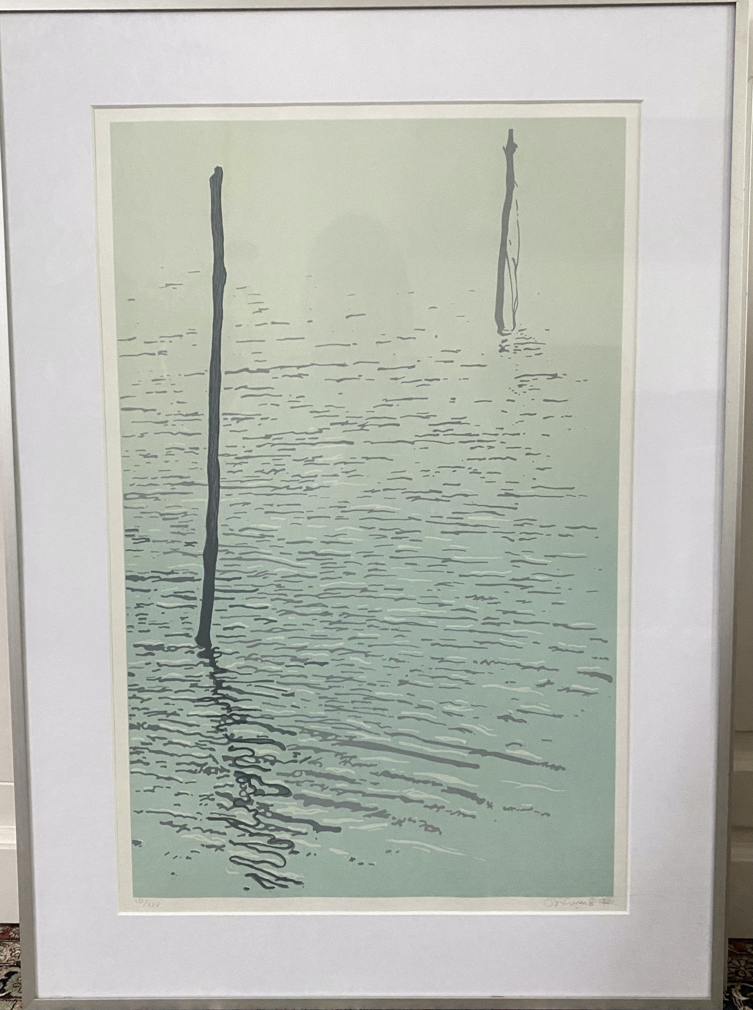 Zeefdruk, 2 palen in het water.