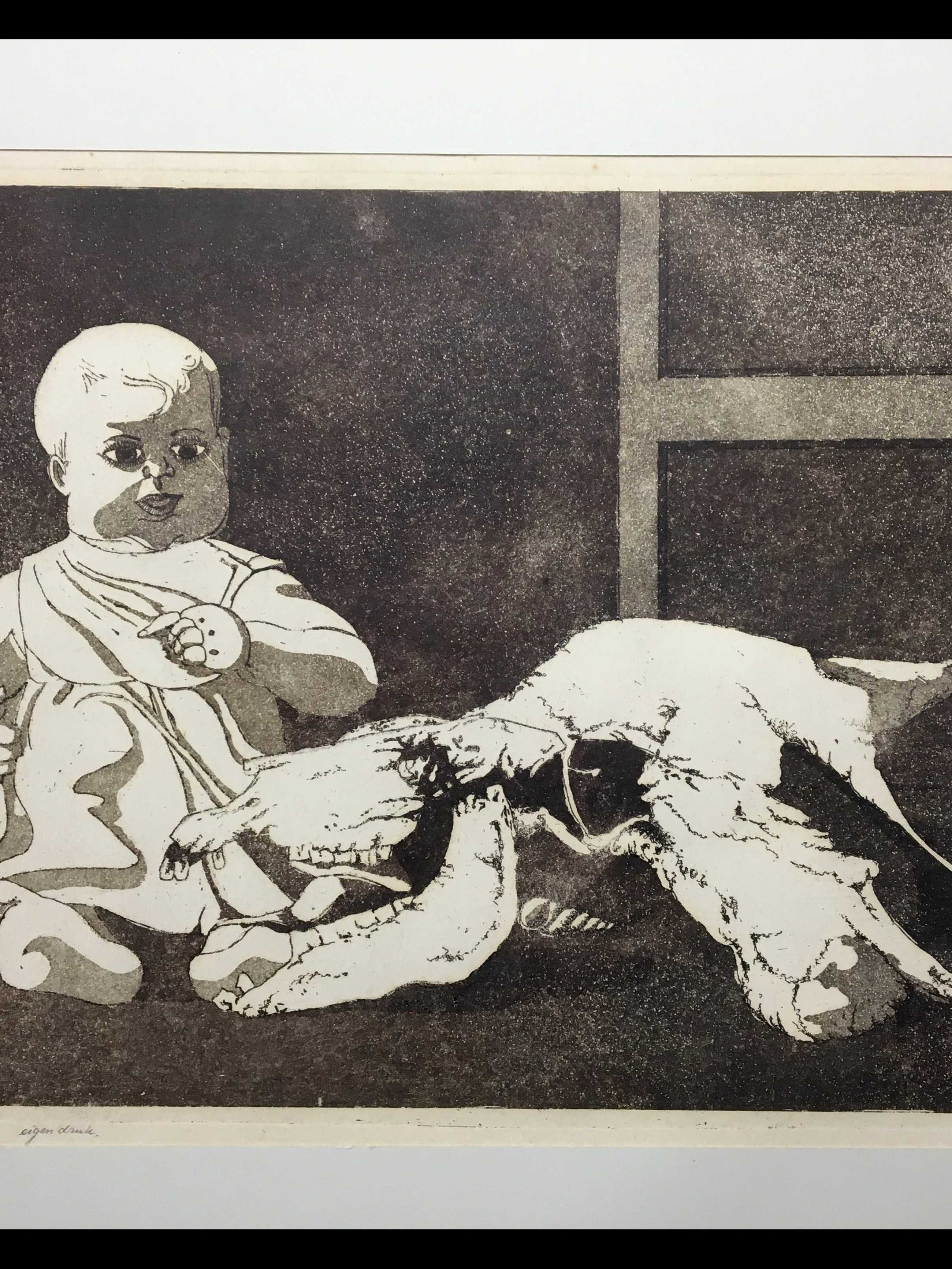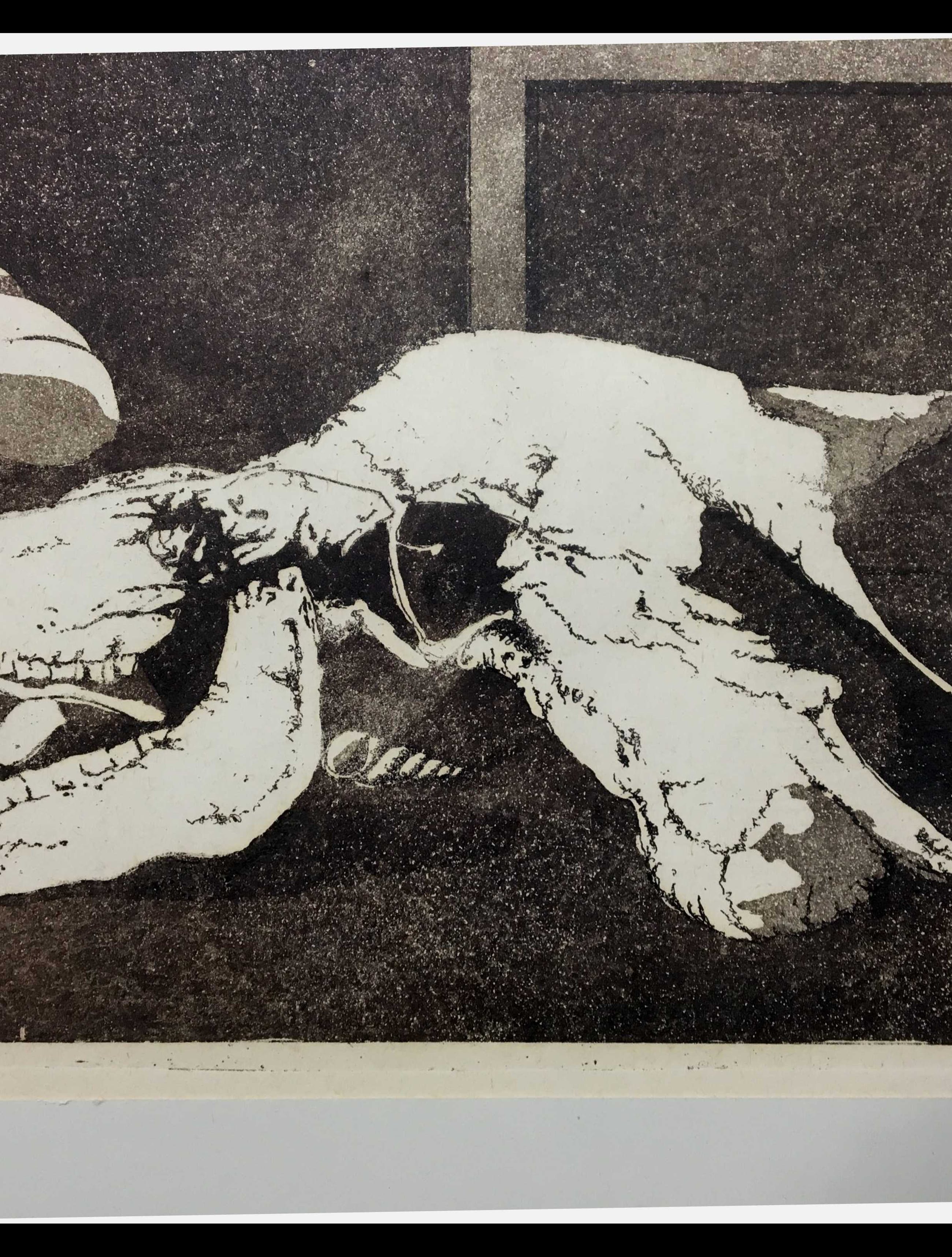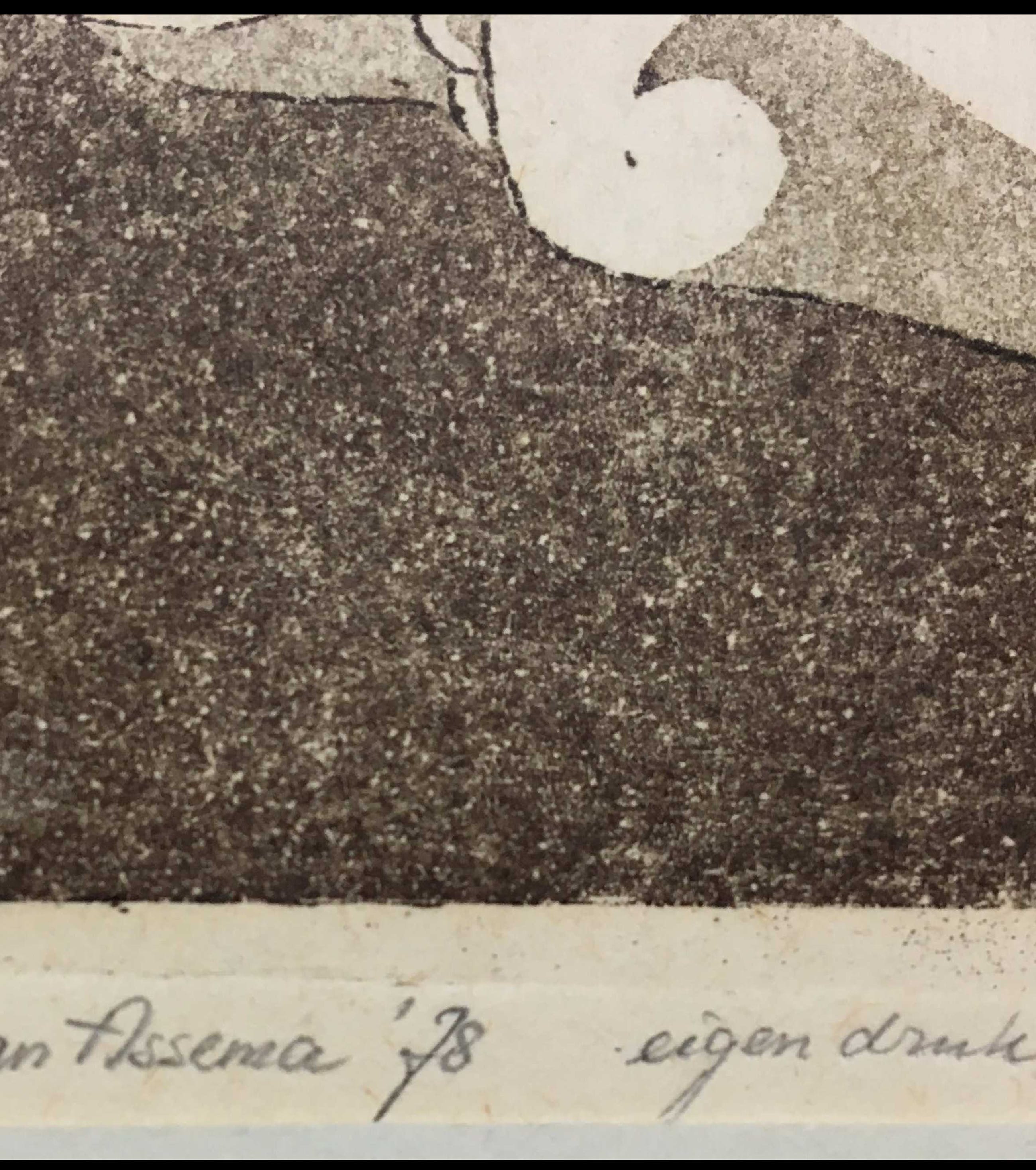 Bijzonder stilleven zonder titel. Droge naad techniek. Ets uit de beginperiode van het oevre van Co van Assema. Hij was op dat moment pas 23. Intrigerend, lieflijk, en tegelijkertijd de vergankelijkheid tonend van de aardse dingen.