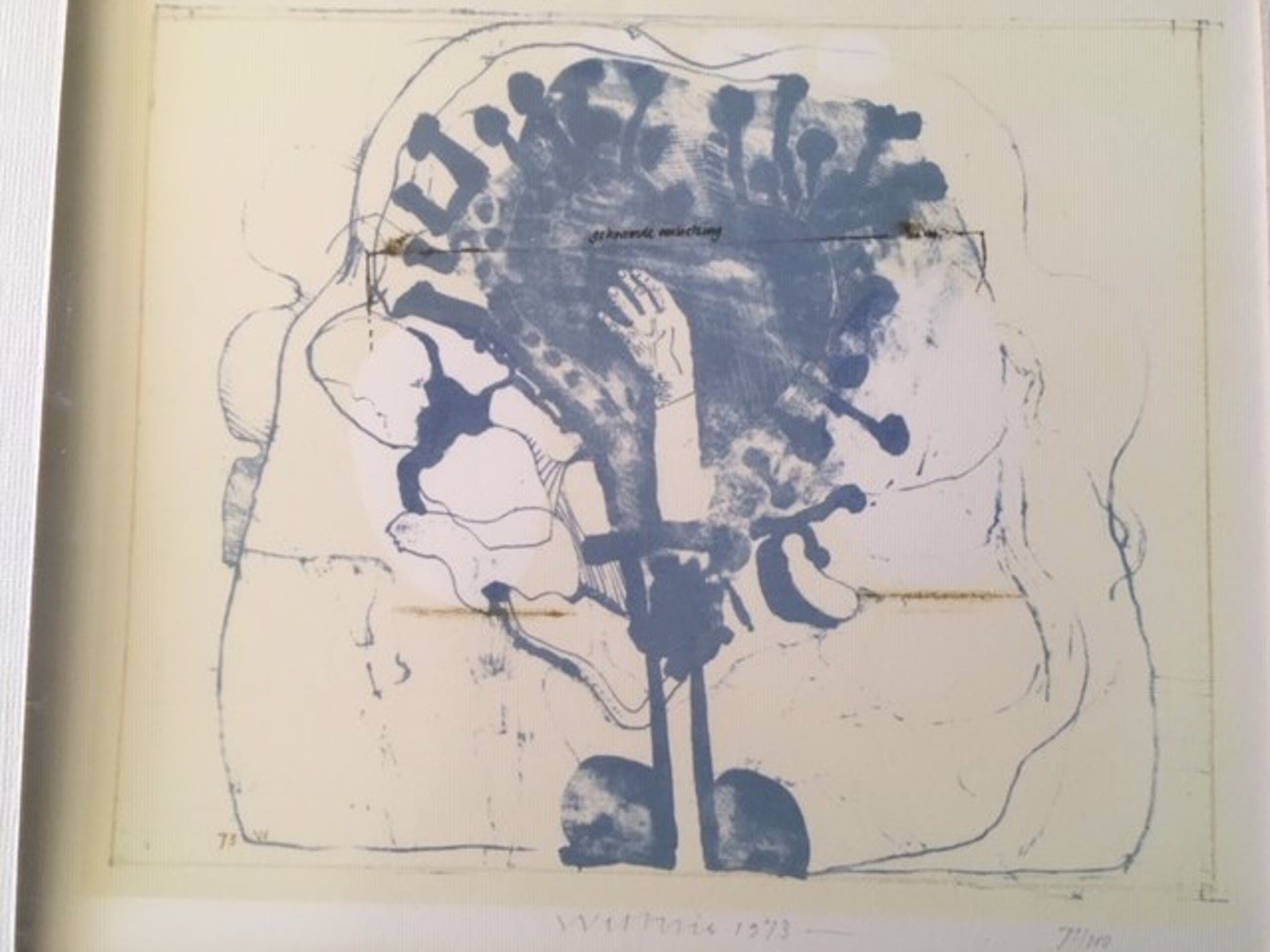Schitterende ets van Co Westerik, gedateerd 1973 en getiteld' Gekramde omhelzing'. de grafiek zelf is in prima conditie. De lijst is eenvoudig en sluit in een hoek niet goed, dus alleen voor het transport ter bescherming. Dit is nummer 71 uit een serie van 110, handgenummerd en handgesigneerd.
