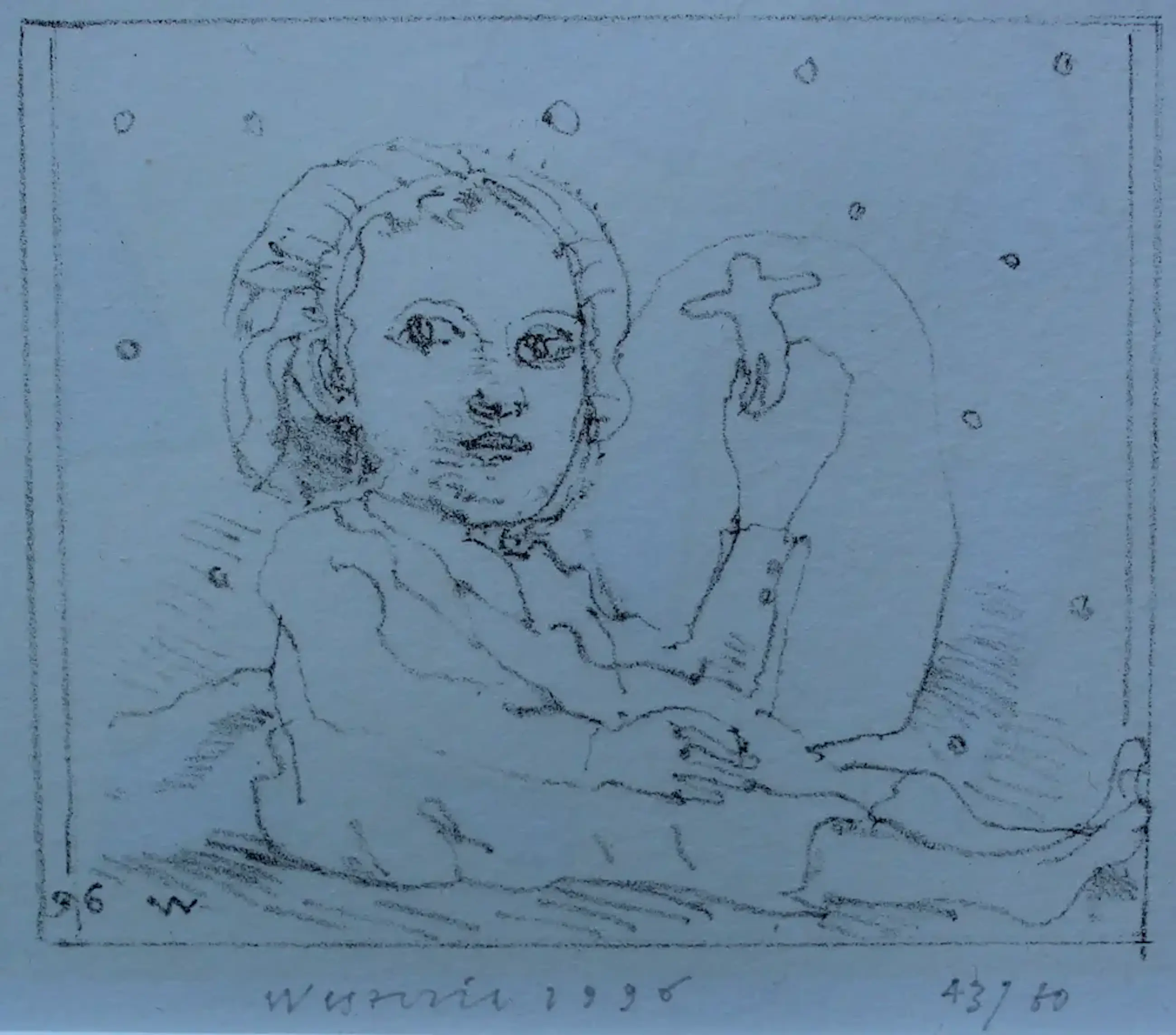 Ingelijste litho van Co Westerik. Titel: Meisje met pop. Jaar: 1996. Oplage: 43/60. Afmetingen incl lijst: H32 x b29cm. Afmetingen voorstelling: H8.5 x b10.5cm. Het werk is midden onderaan, met potlood gesigneerd, door de kunstenaar. Ook is het midden onderaan, in de druk gesigneerd. De authenticiteit van het aangeboden werk wordt volledig gegarandeerd. Een certificaat van echtheid kan, op aanvraag worden gemaild.