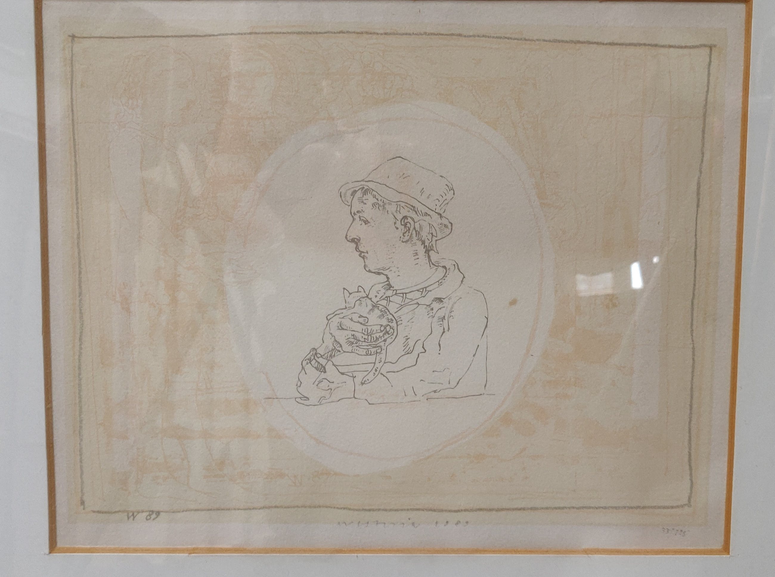 man met hoed en poes mooie litho 25 x 30 gekocht bij SBK Bergen ergens rond 1990