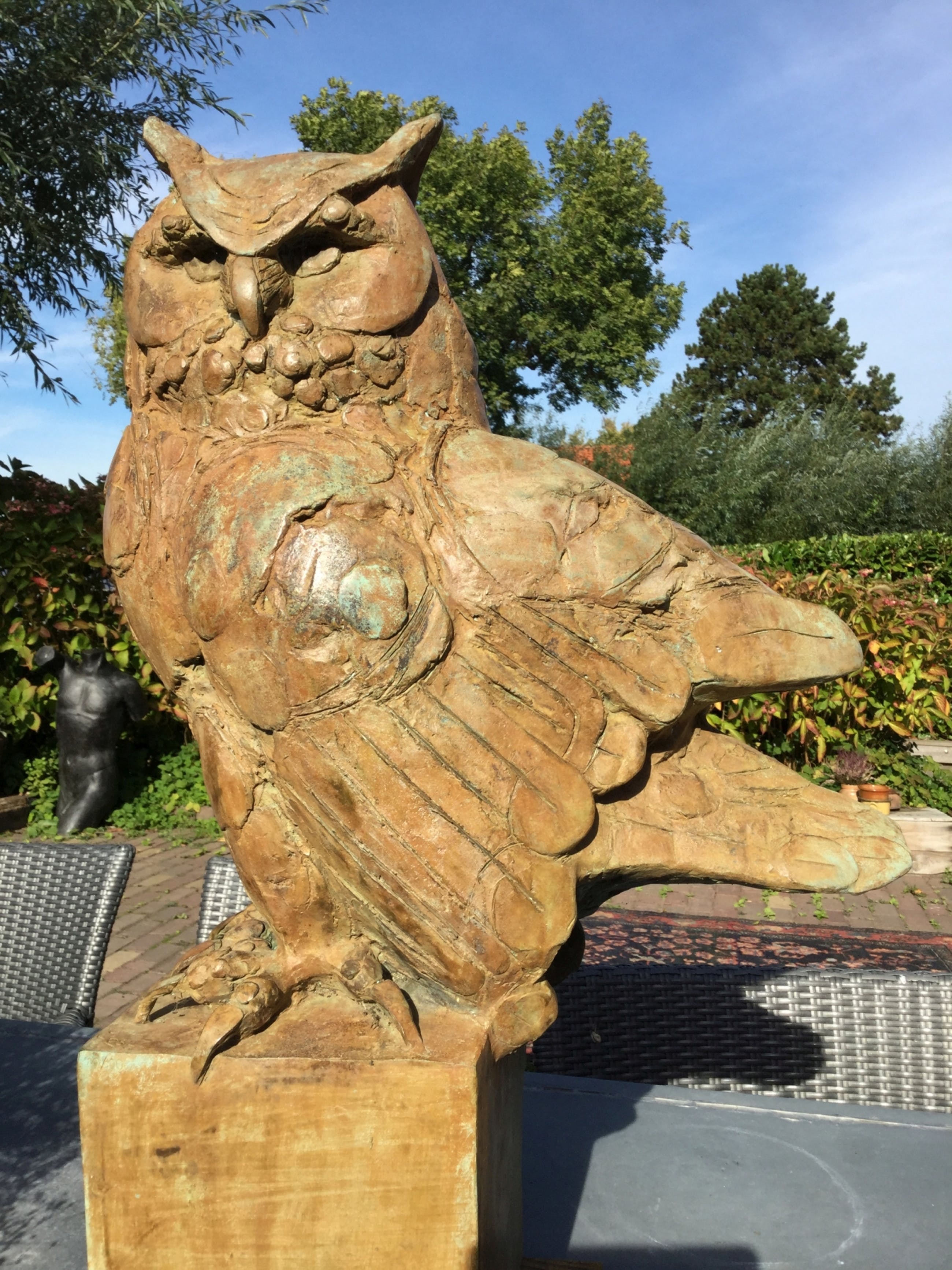 Een werkelijk prachtig beeld aangeboden van Coba Koster, genaamd "De grote Oehoe". Dit beeld zal in uw tuin of interieur niet misstaan. De kleuren van de foto's lijken iets te verschillen, dit komt omdat de ene foto voor een regenbui genomen is, en de ander na een regenbui. De foto's geven ook een sfeerimpressie hoe dit beeld in een tuin zou kunnen staan. Het beeld kan opgehaald worden op onze locatie in Nieuwersluis. Voor meer vragen over de conditie van dit beeld kunst u gerust contact met ons opnemen