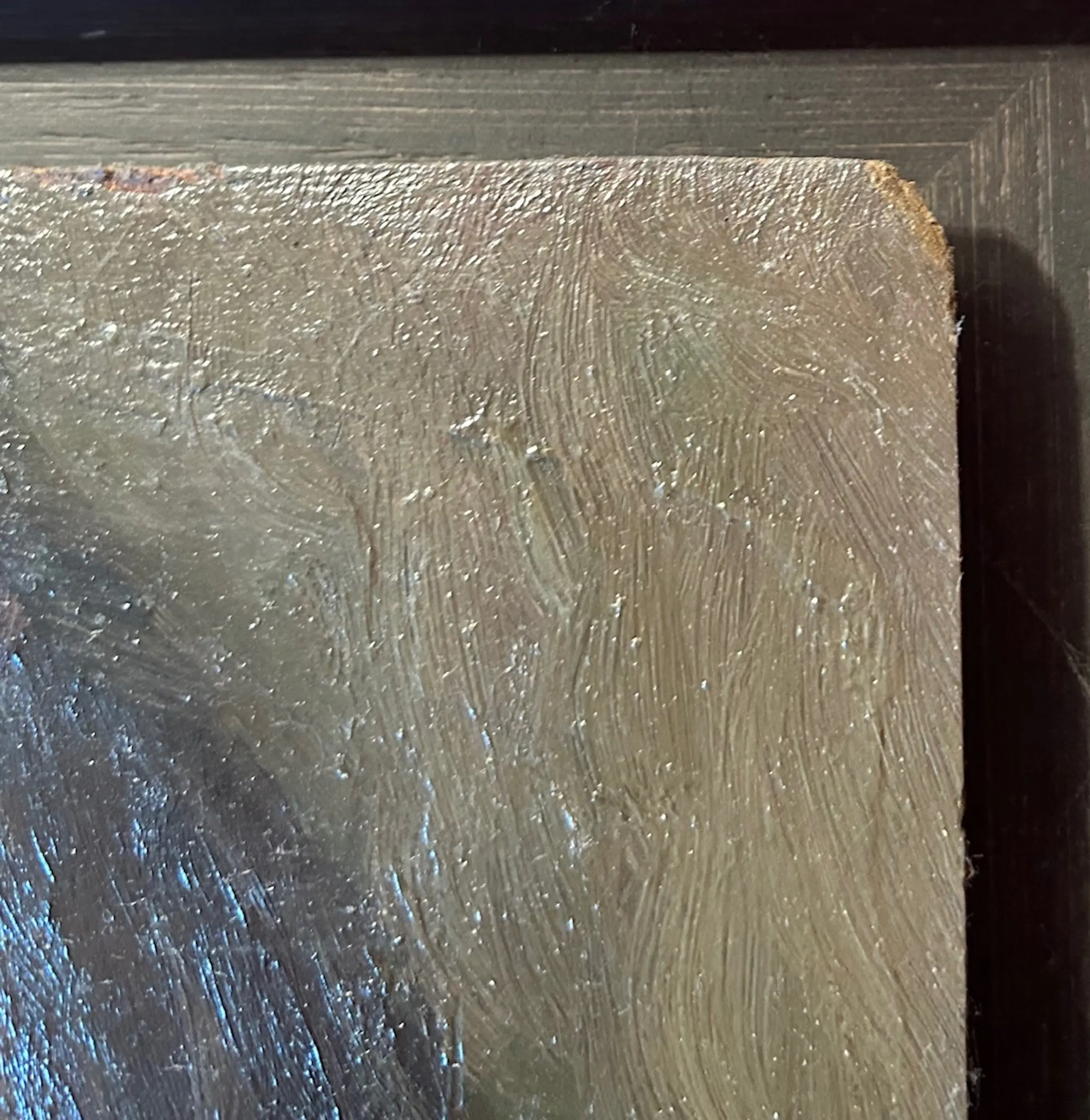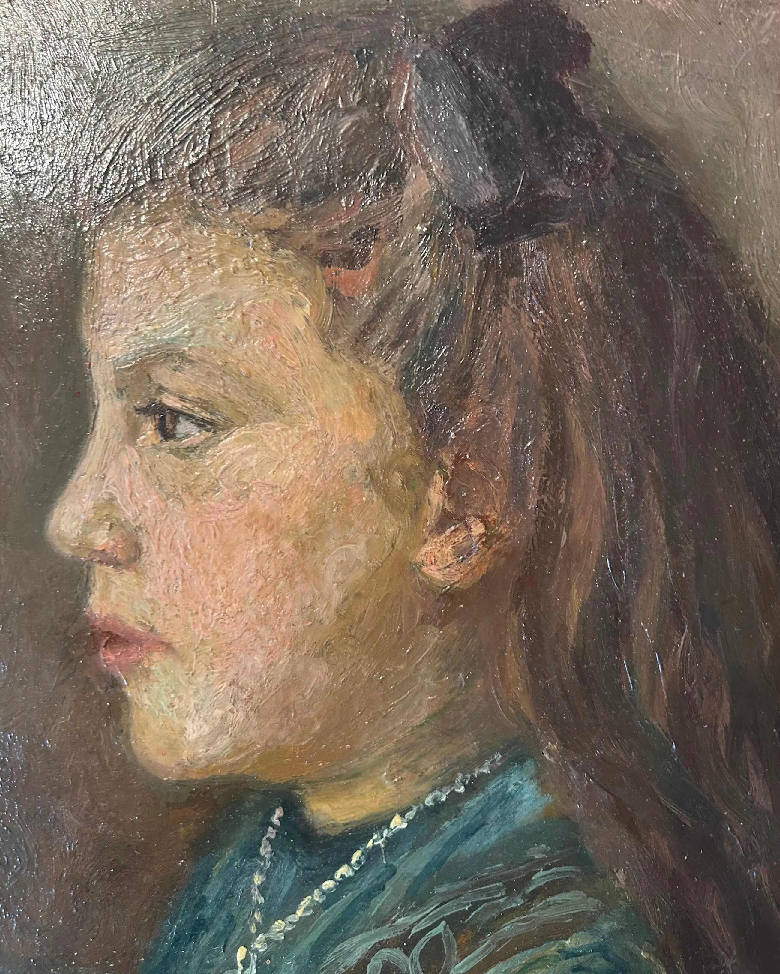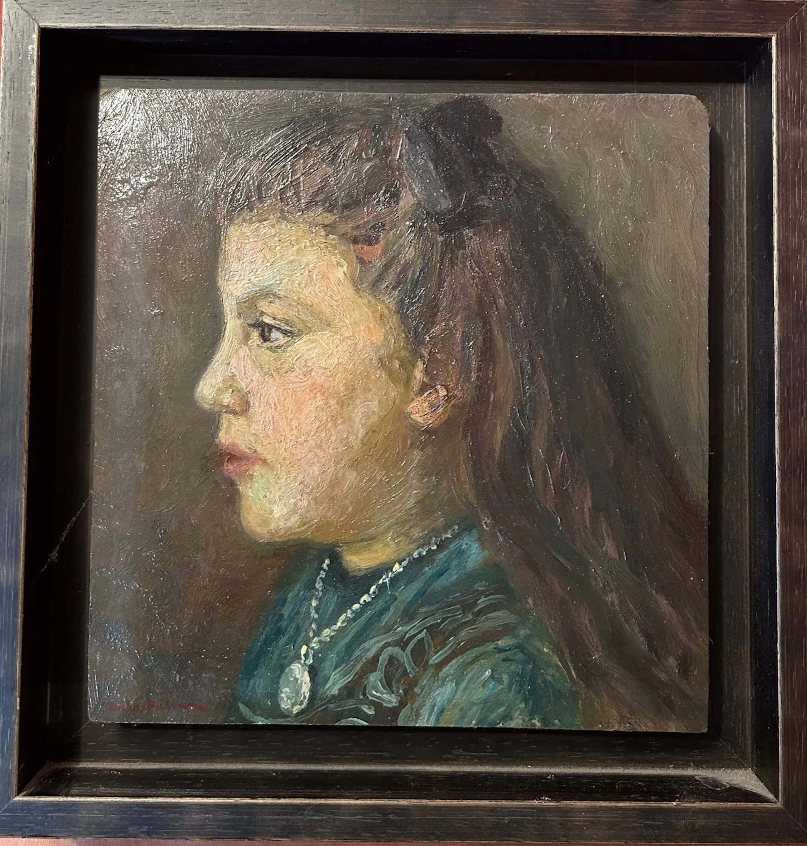 Olie op karton. Penseelgesigneerd linksonder. In fraaie recente baklijst. Minieme beschadiging rechterbovenhoek (zie foto). Op basis van de kleding van het meisje te dateren tussen 1900 en 1910
