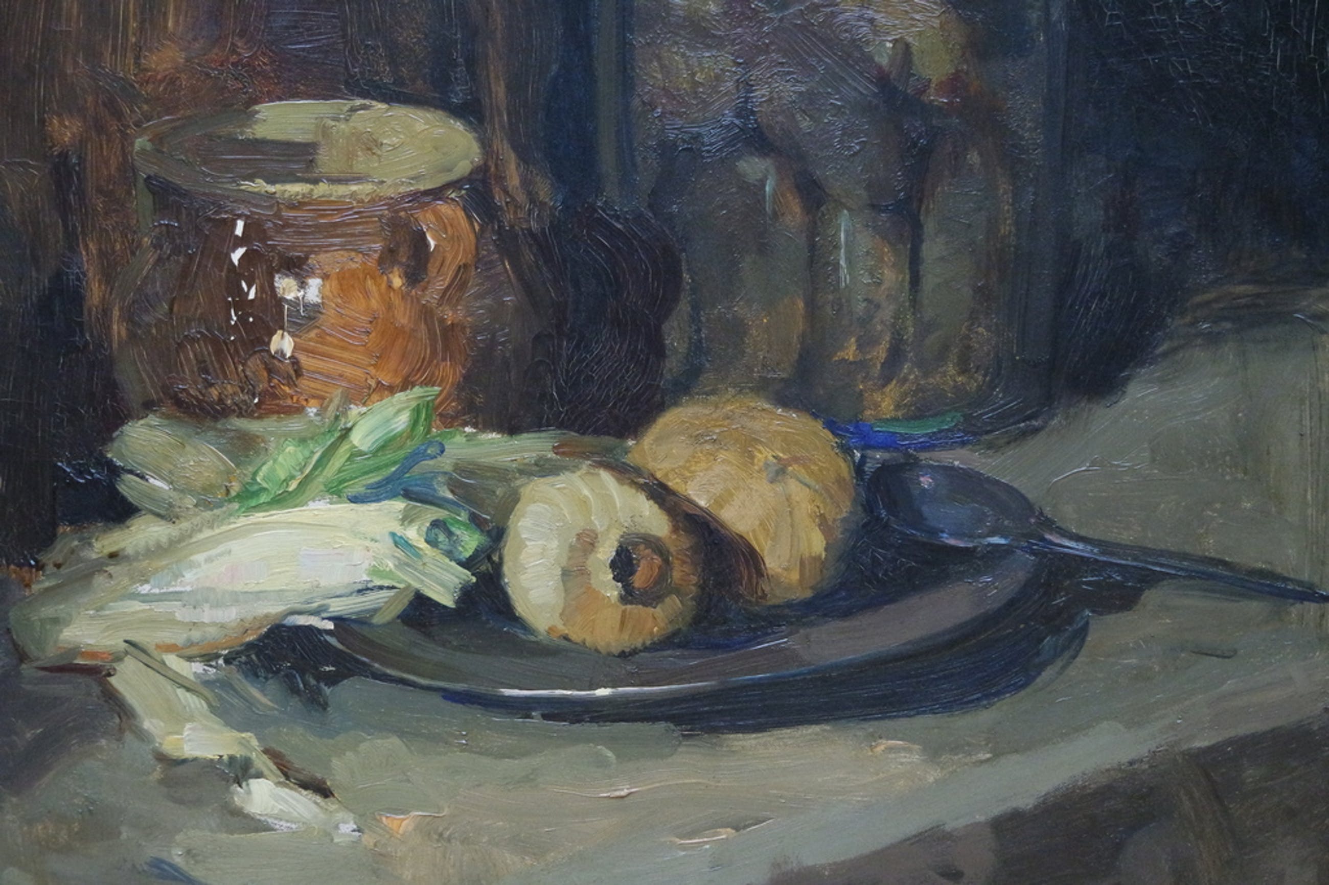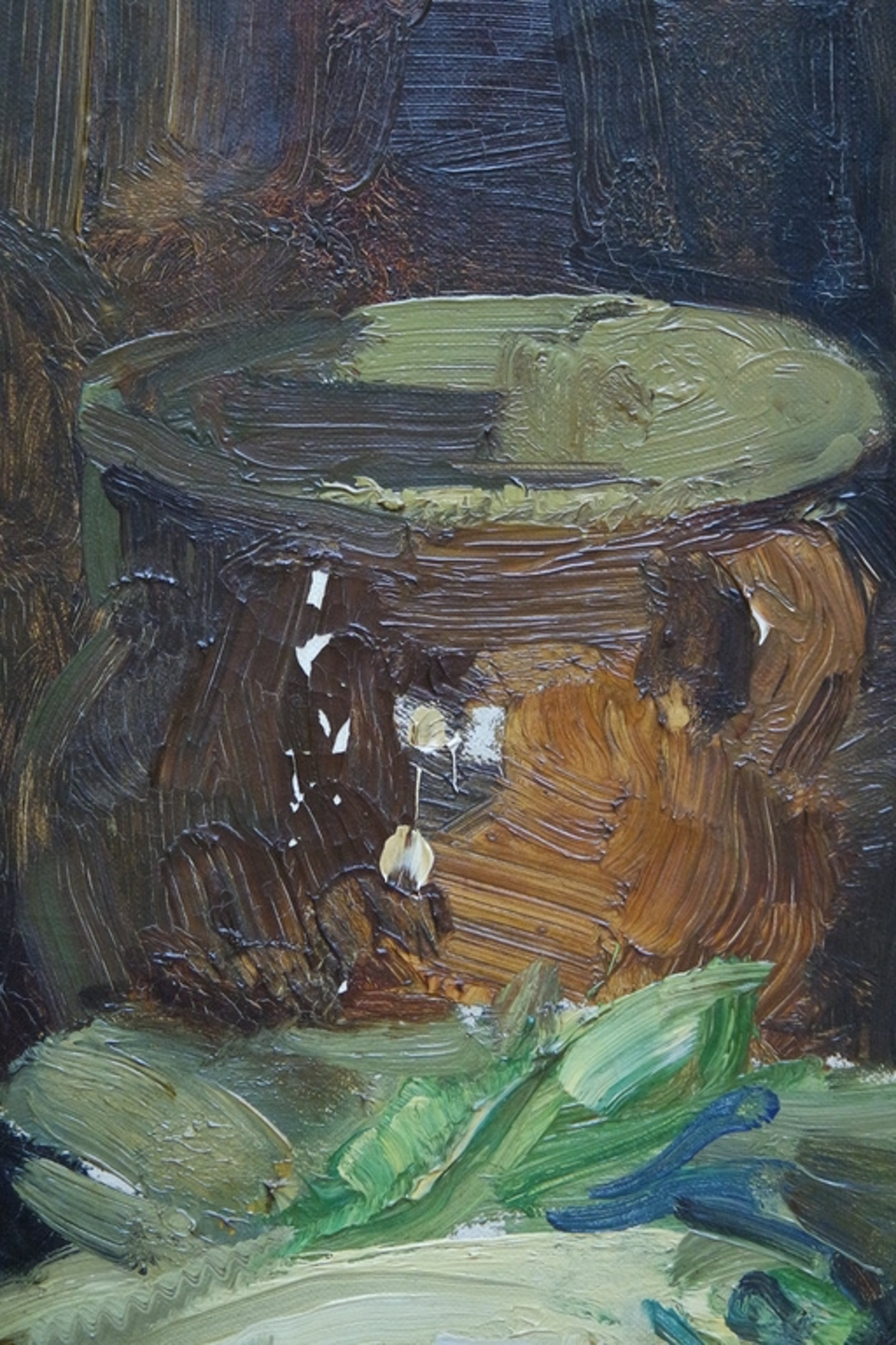 Een schitterend stilleven (met groente op tinnen schotel) van de kunstenares Jacoba "Coba" Surie (1879-1970). Met authentieke lijst. Gesigneerd rechts onder. Afmetingen met lijst: 62 cm. x 69 cm. Doekmaat: 51 cm. x 58 cm. Conditie:redelijk tot goed (lichte craquele). Het kunstwerk wordt goed gepakt en verzekerd verzonden. Afhalen is op afspraak mogelijk.