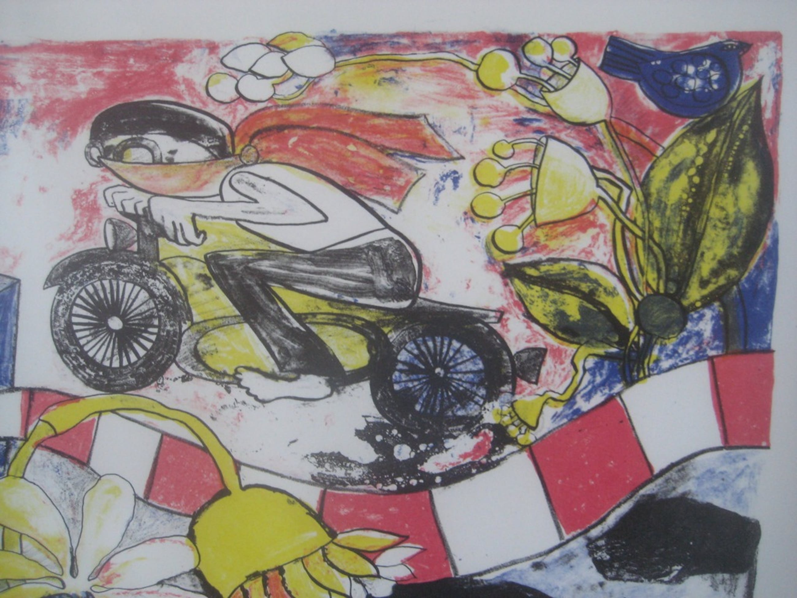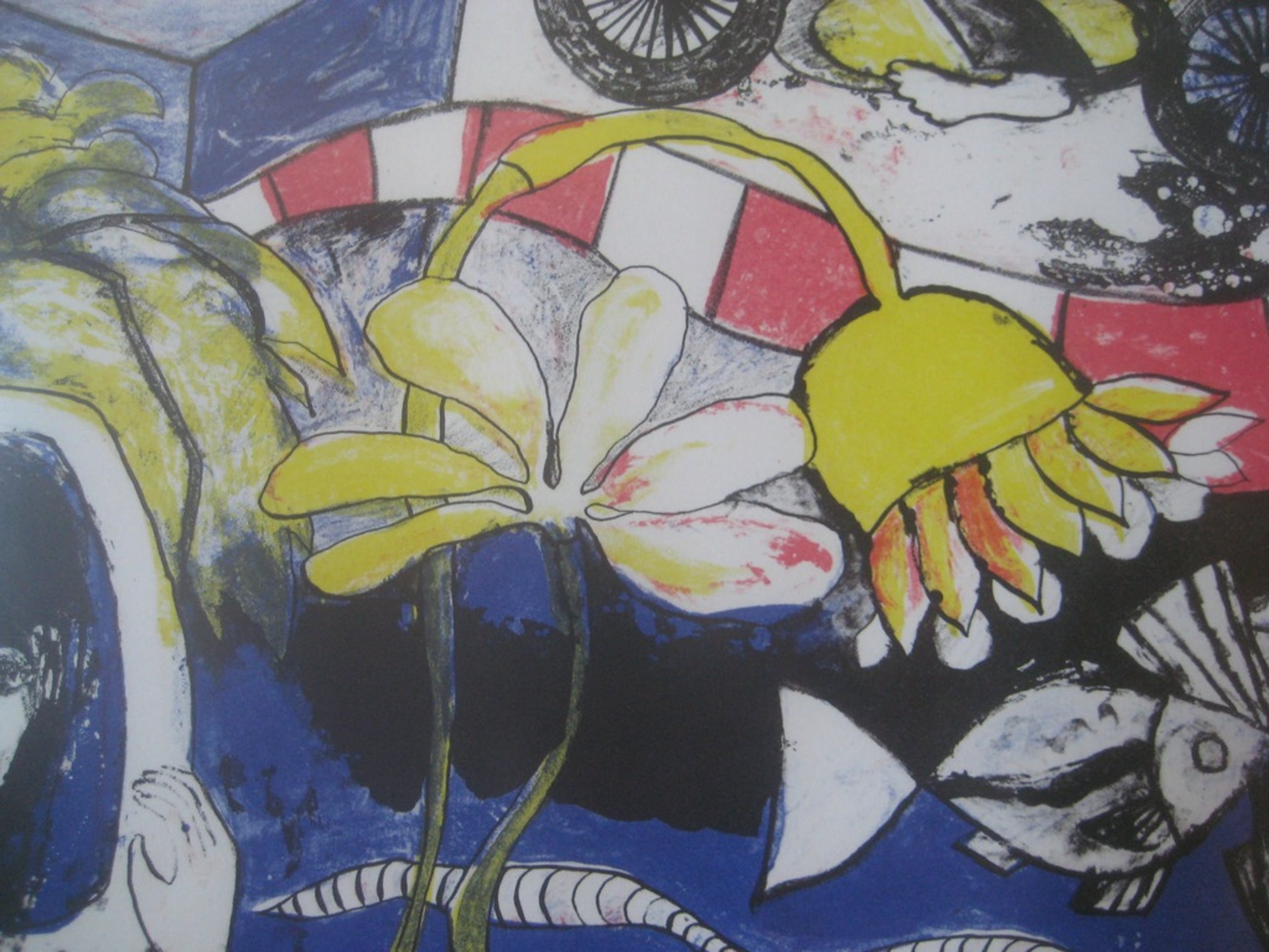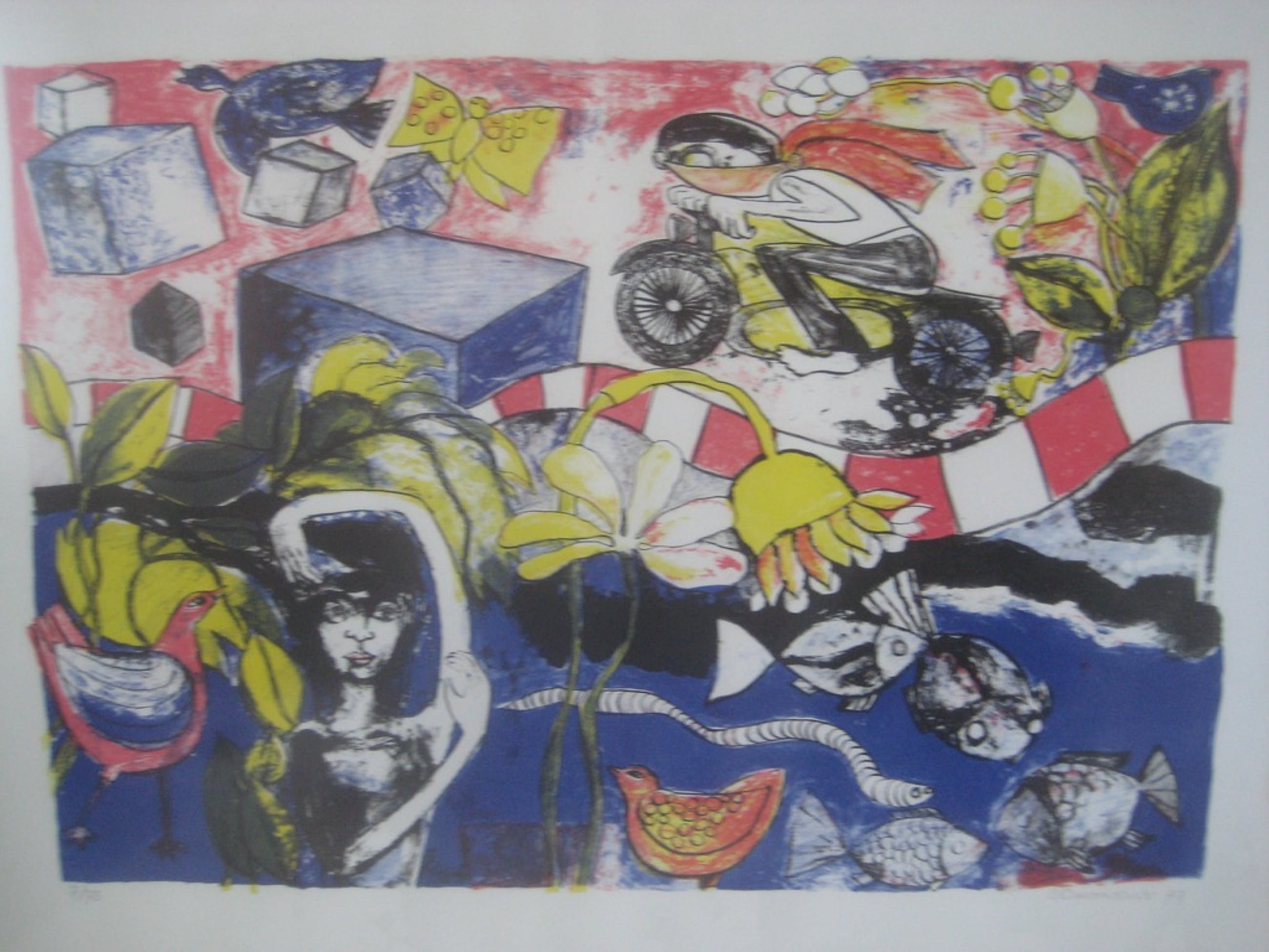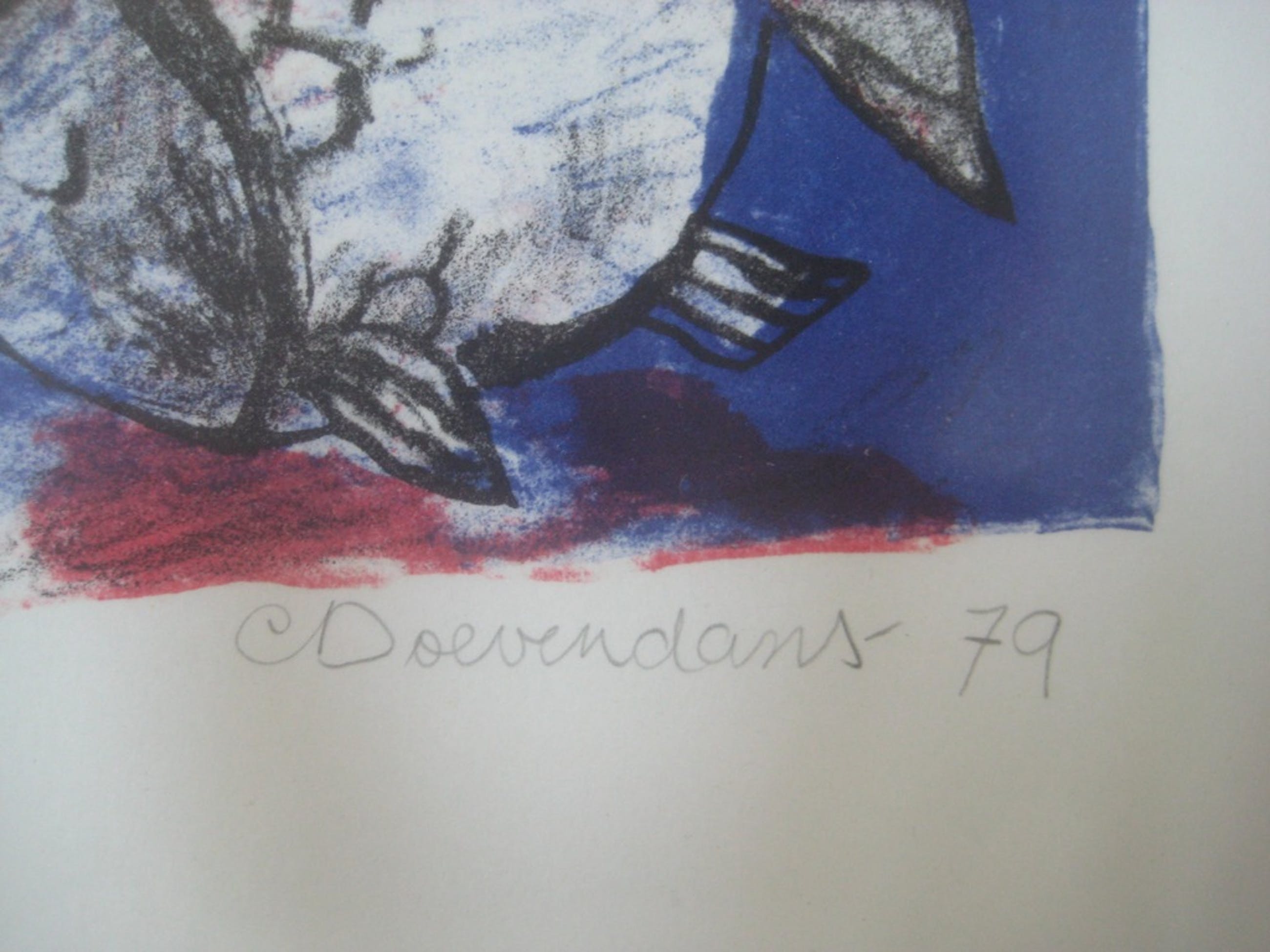 Vrolijke, kleurrijke, moderne voorstelling van Cobi Doevendans uit 1979. Rechtsonderin gesigneerd. Linksonderin nummering 7/75.