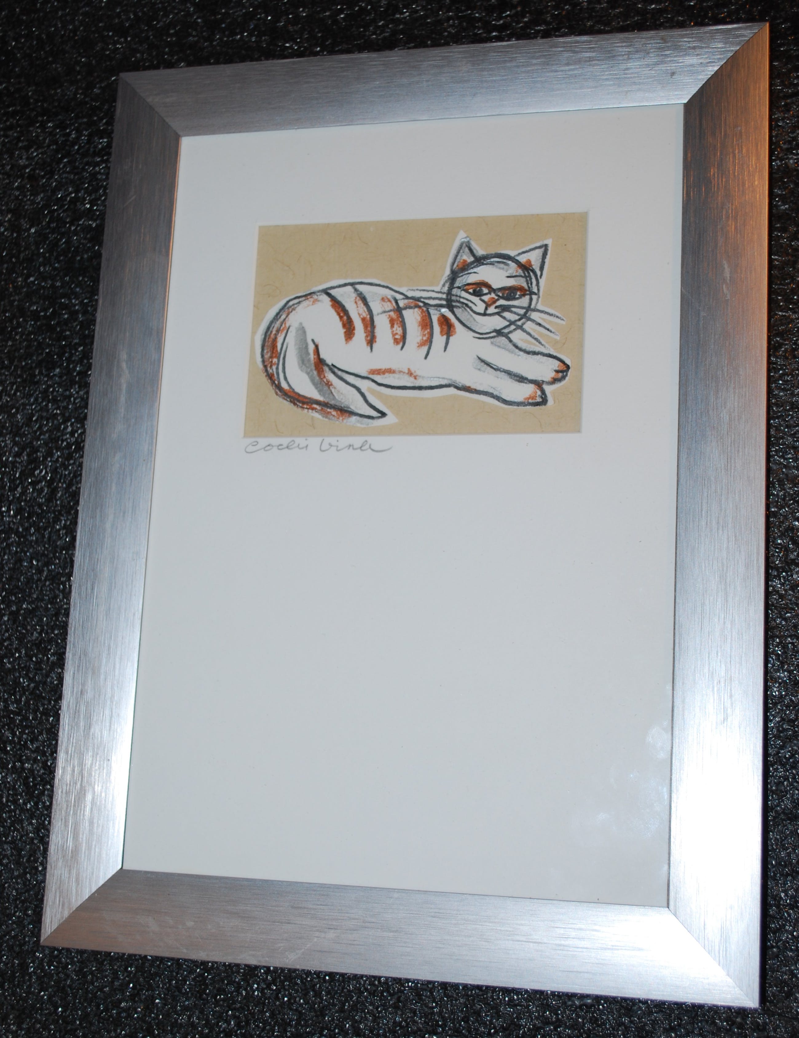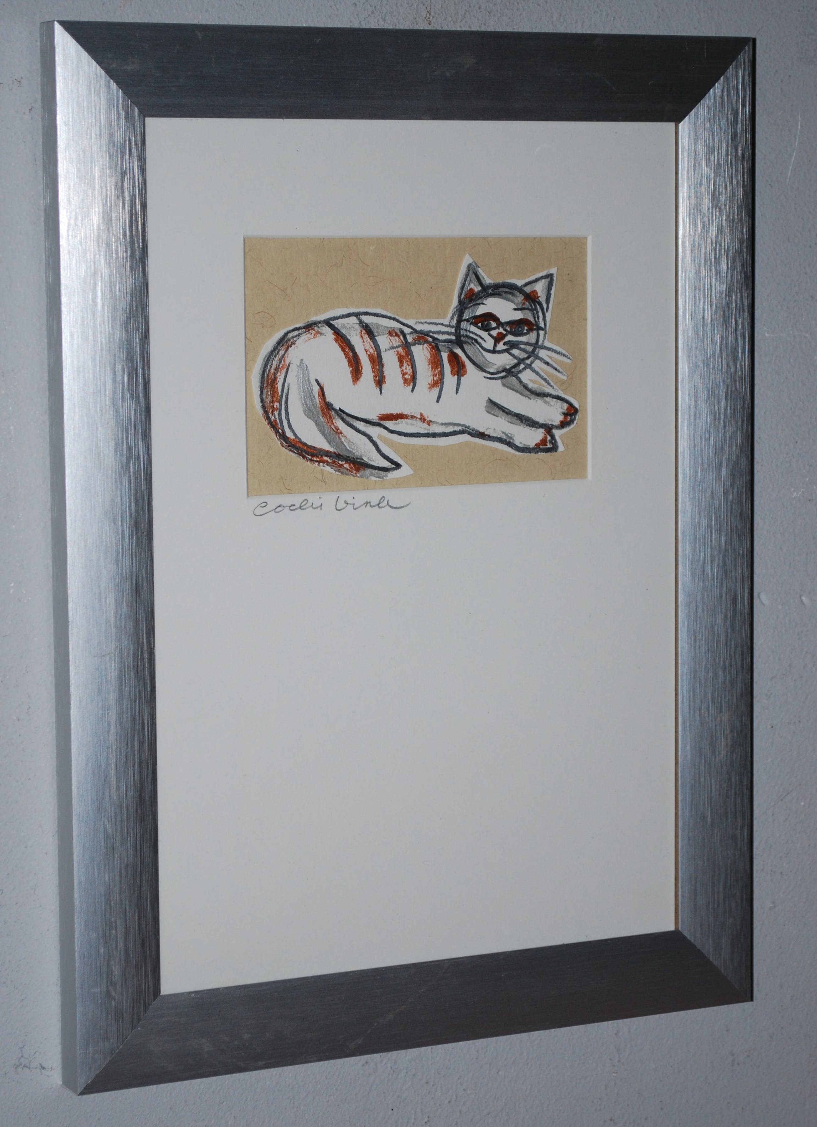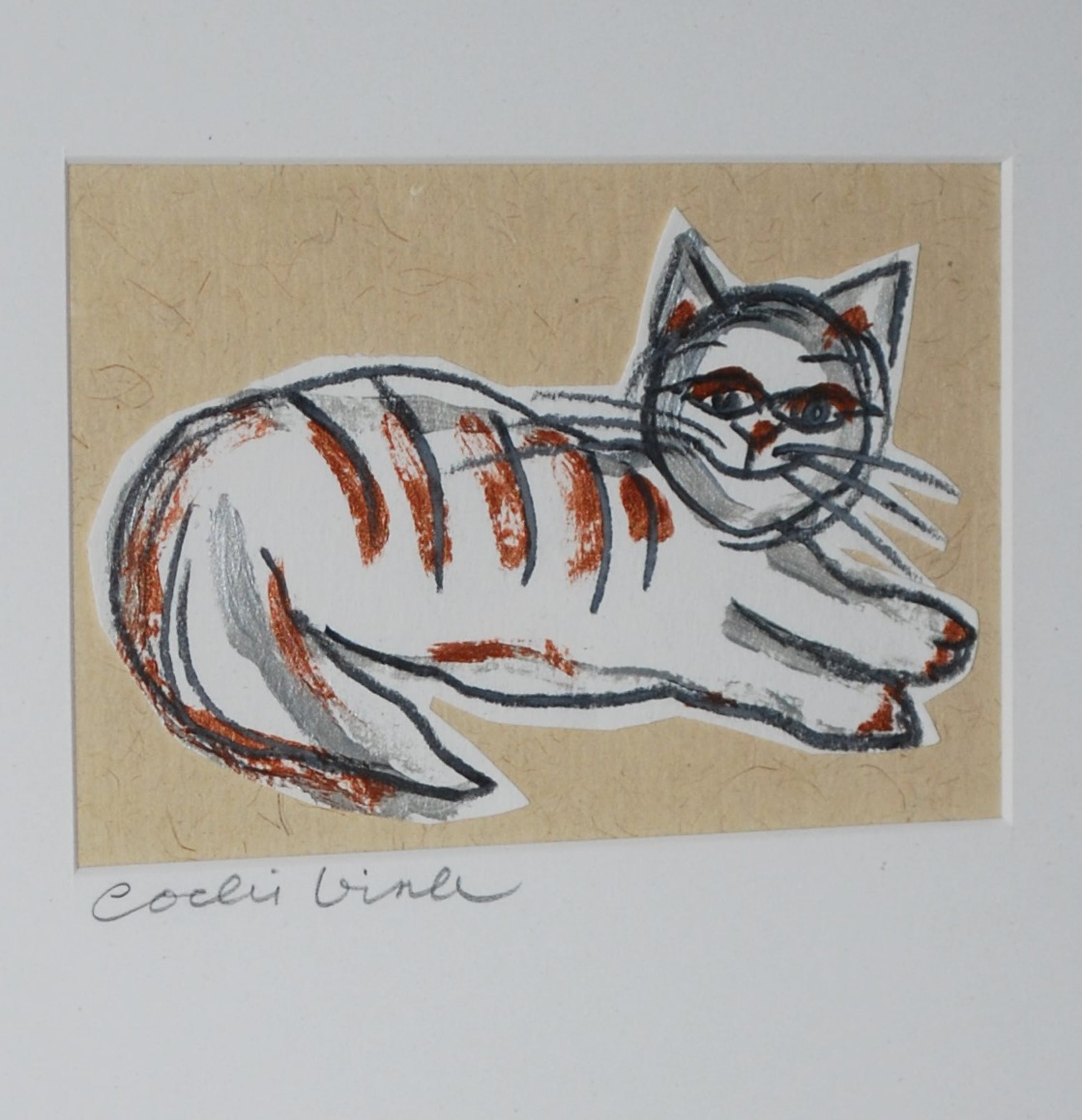 kat van papier en gemengde techniek, bevestigd op papier, uitsnede p.partout 8x13 cm