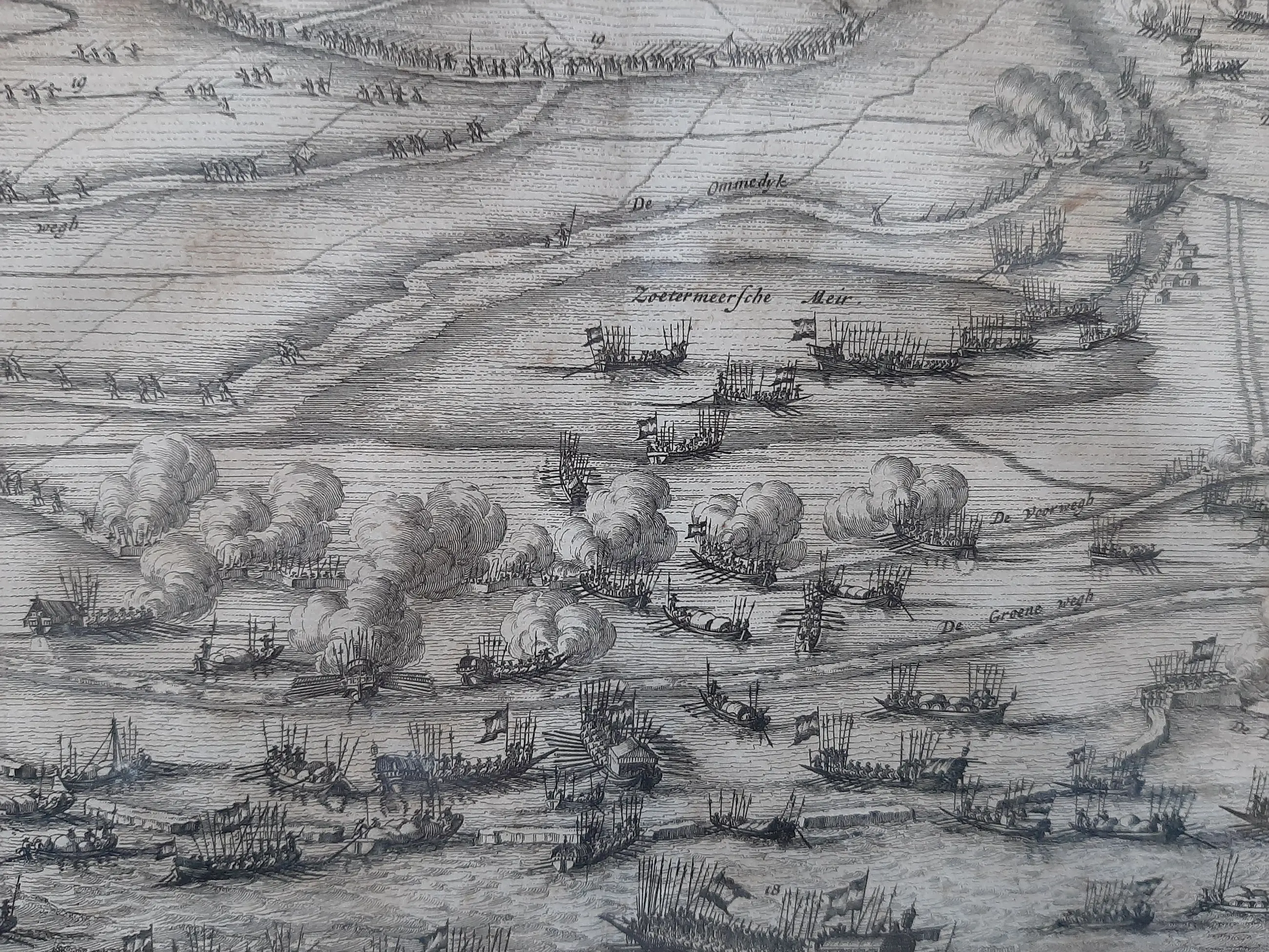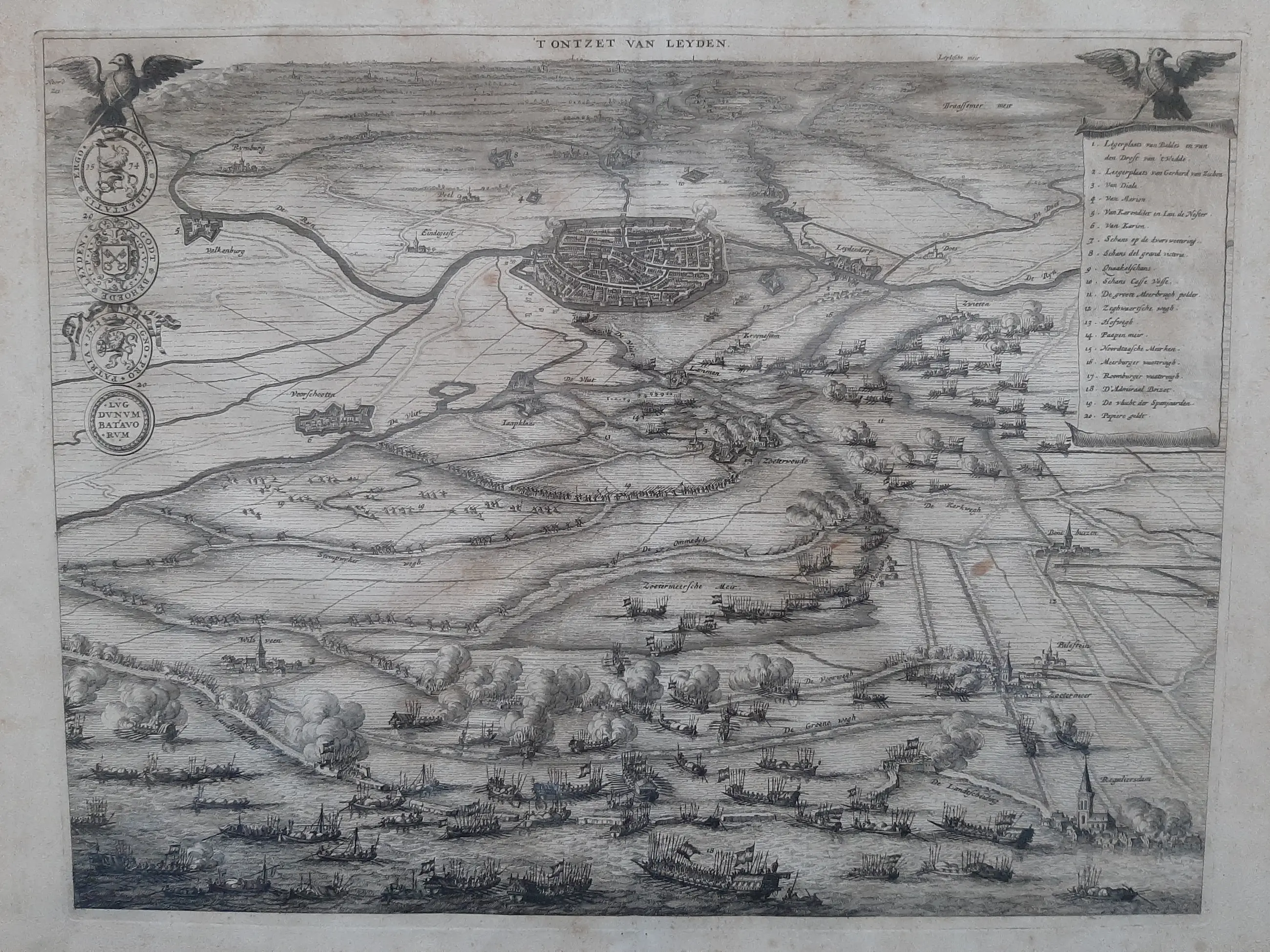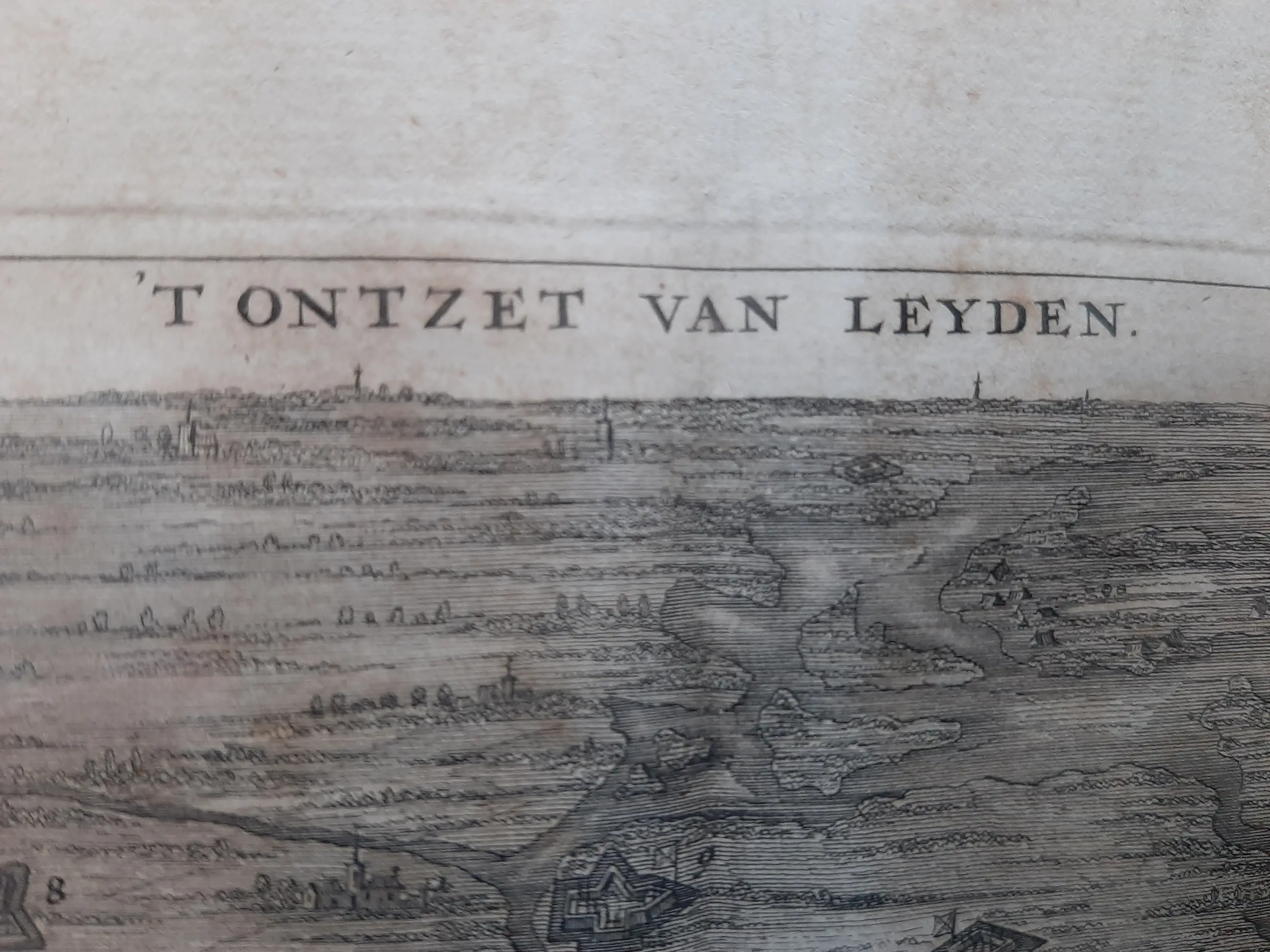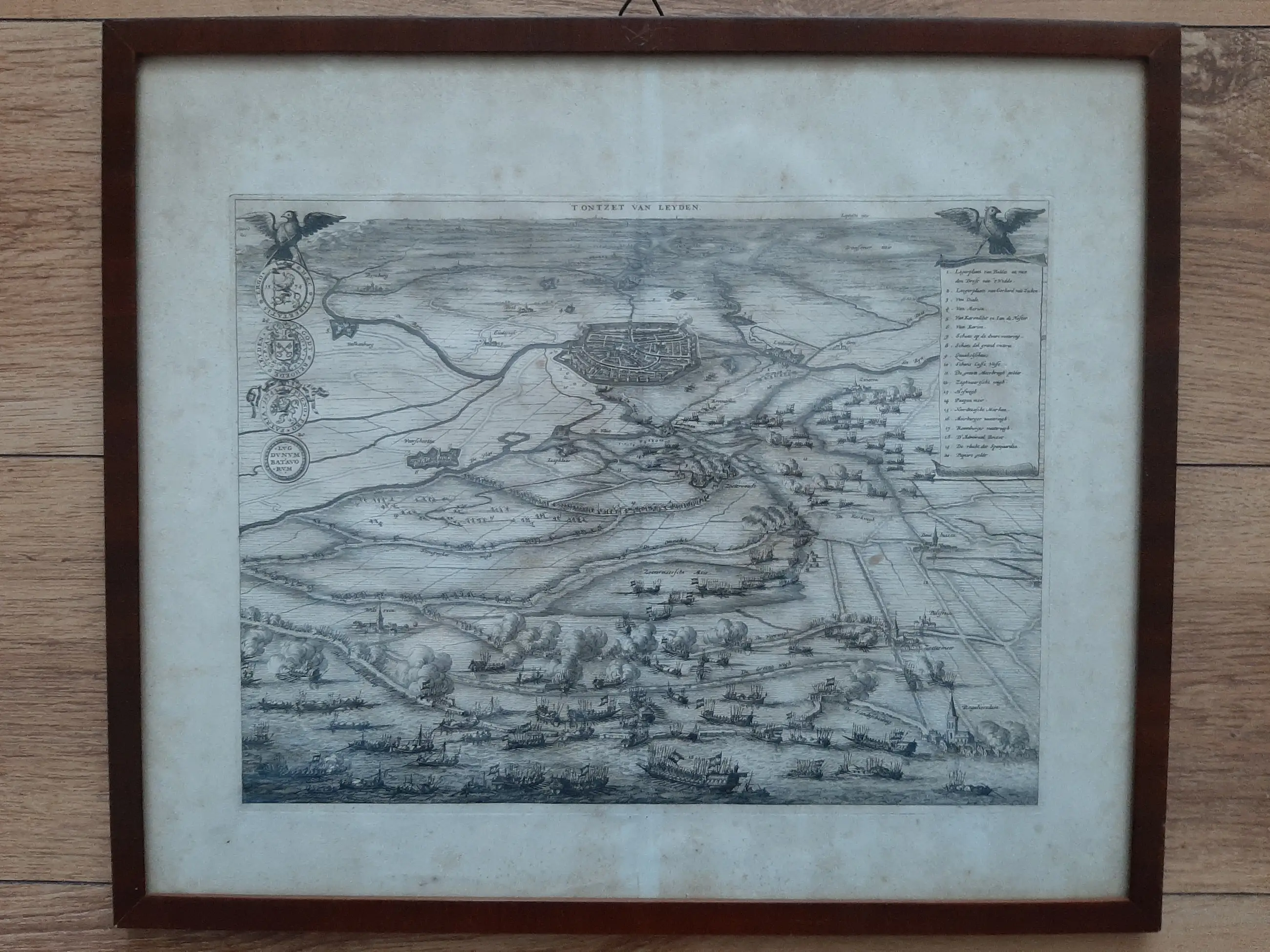 Gravure uit 1703 in houten lijst met glas. t' Ontzet van Leiden in 1574. Zeer fraai. Bevat een aantal vlekjes in prentgedeelte, en het kader rondom is vlekkerig. Desalnietemin een fraaie gravure.