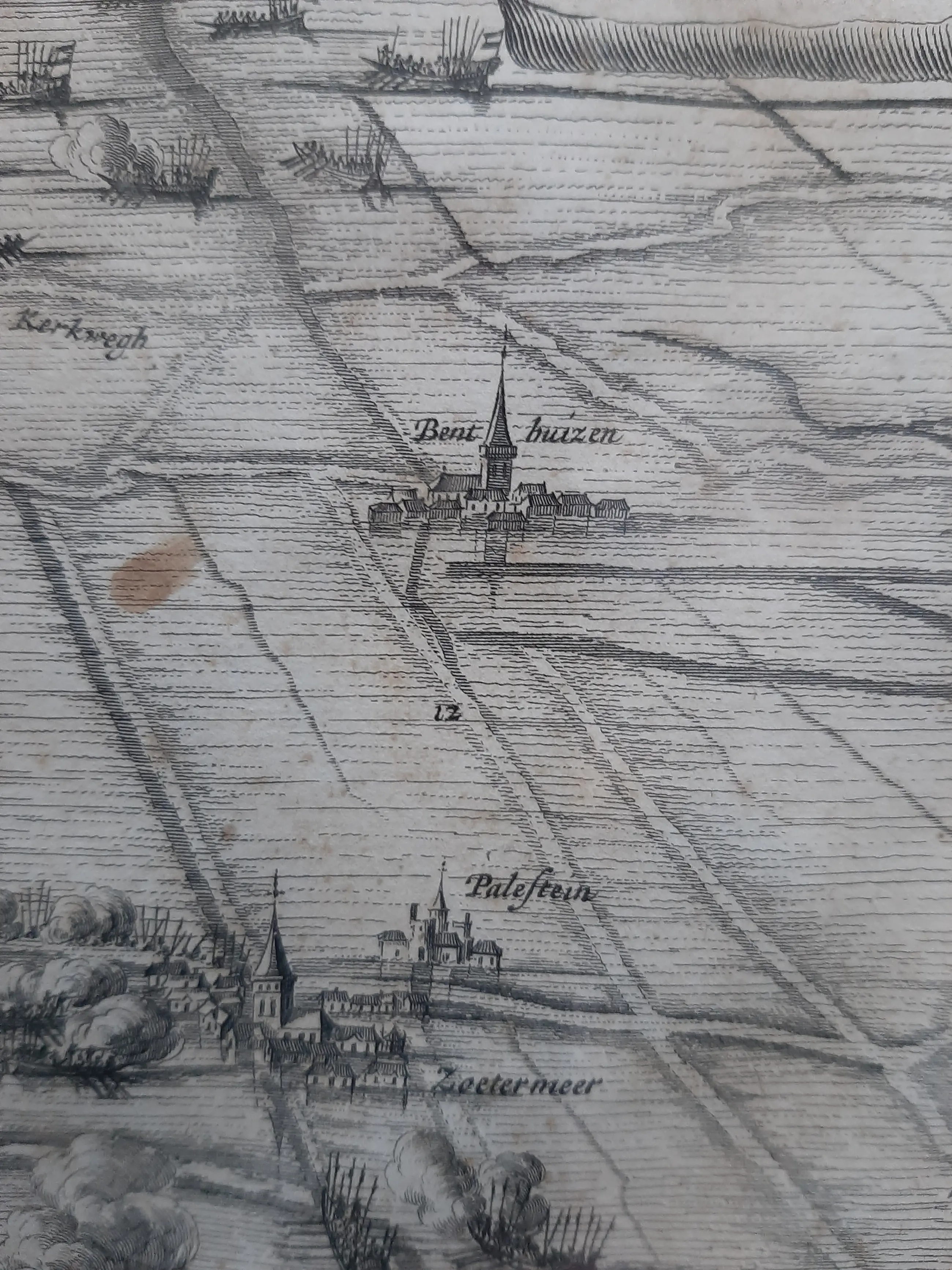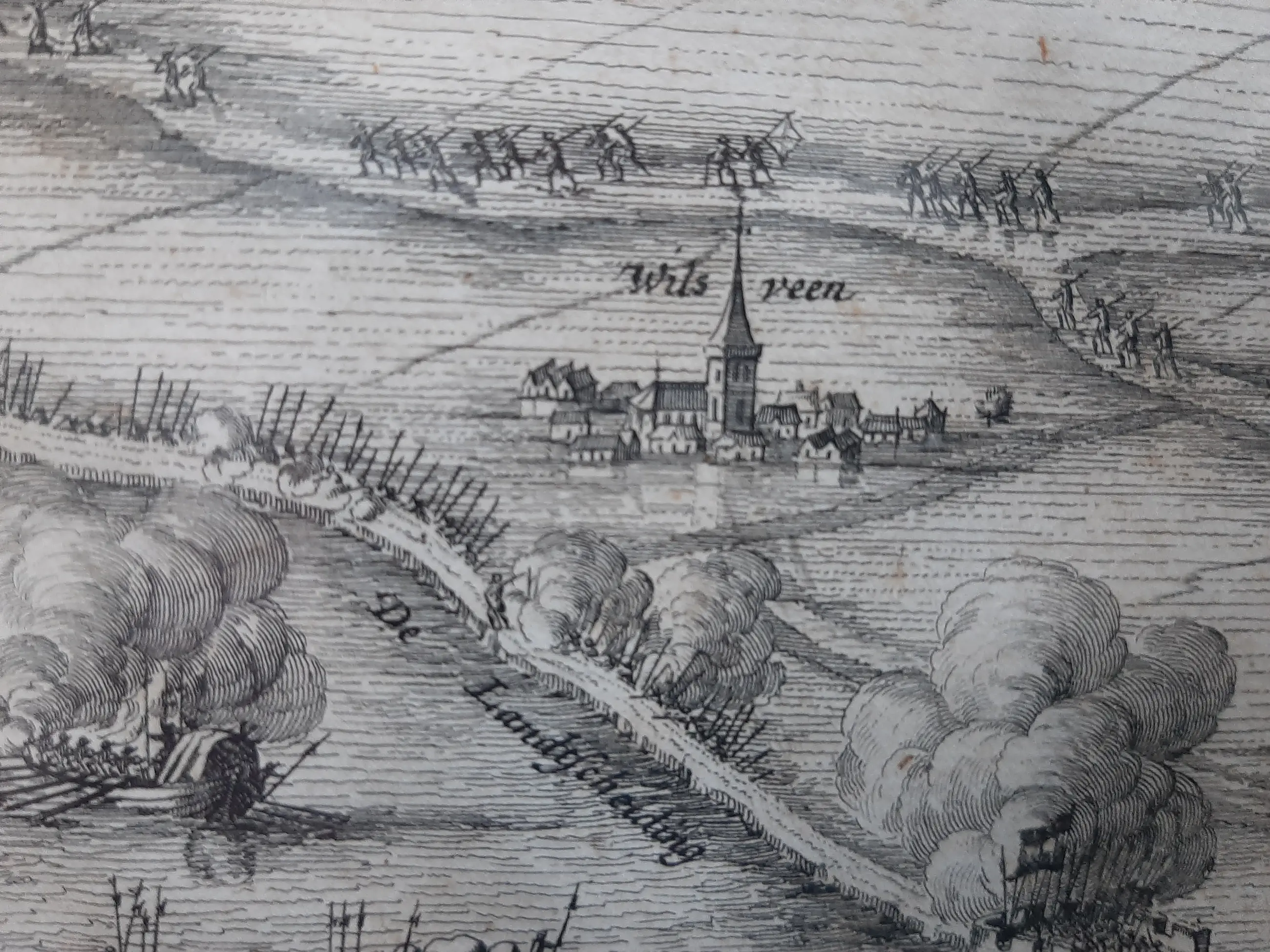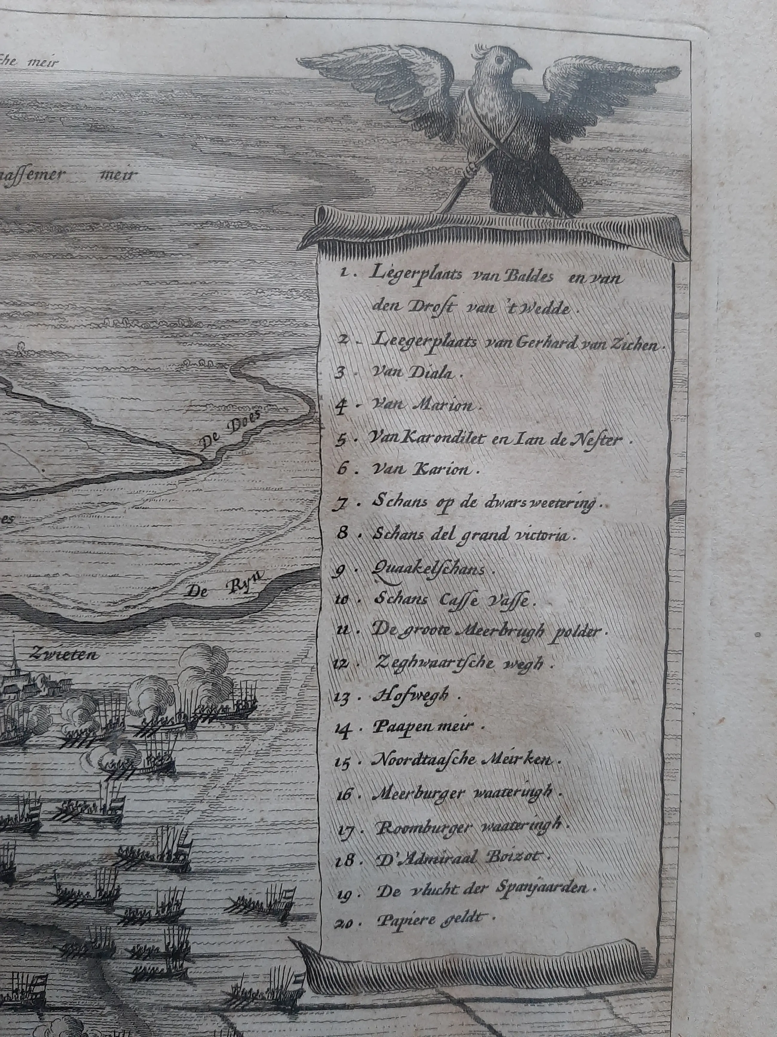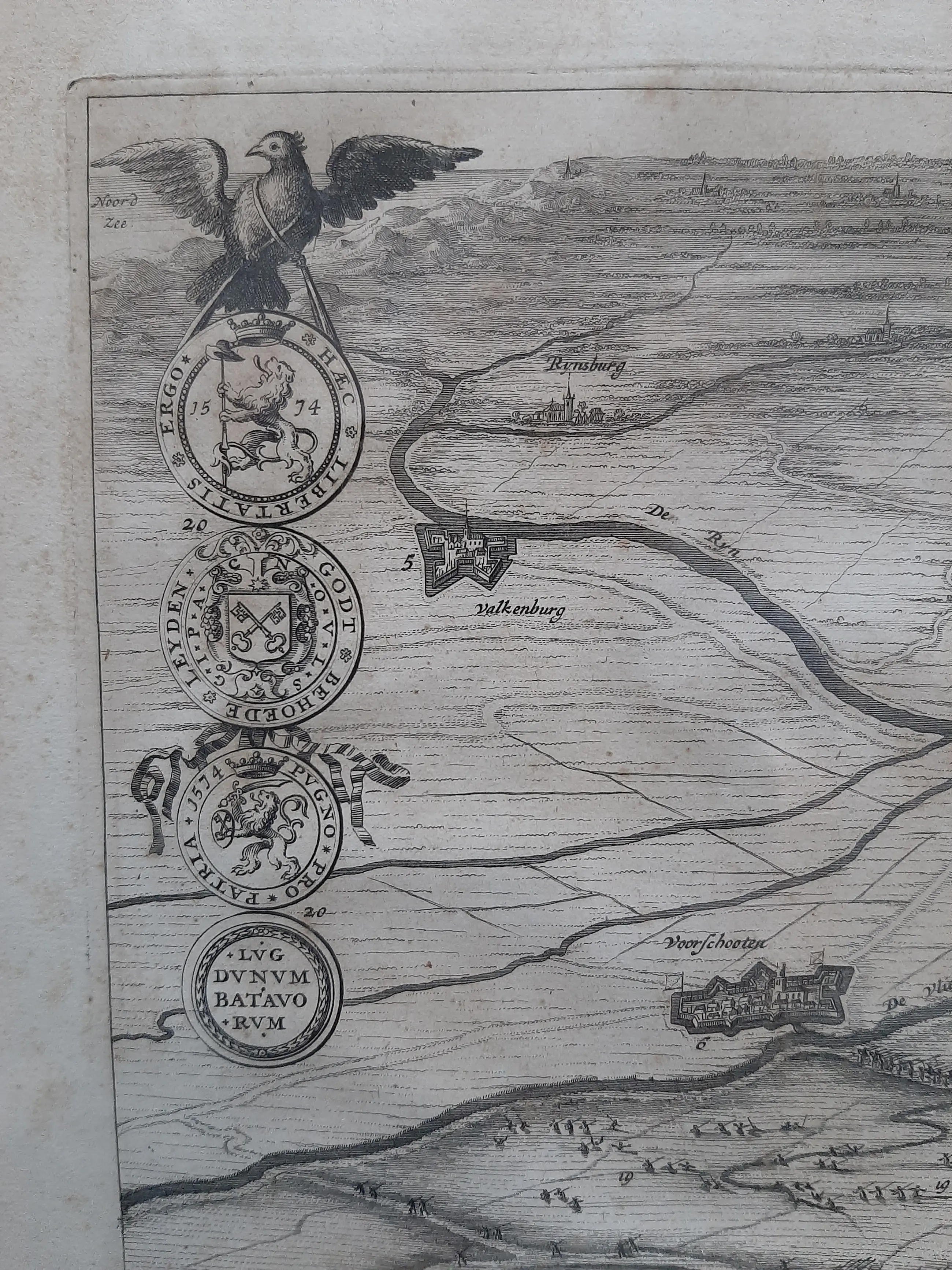 Gravure uit 1703 in houten lijst met glas. t' Ontzet van Leiden in 1574. Zeer fraai. Bevat een aantal vlekjes in prentgedeelte, en het kader rondom is vlekkerig. Desalnietemin een fraaie gravure.