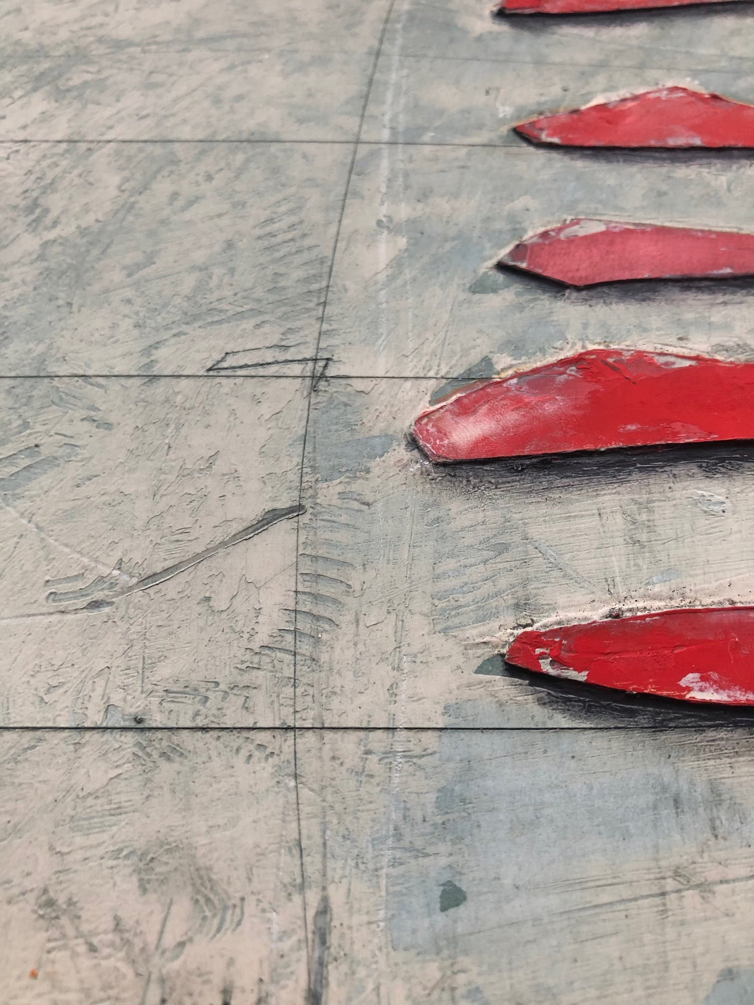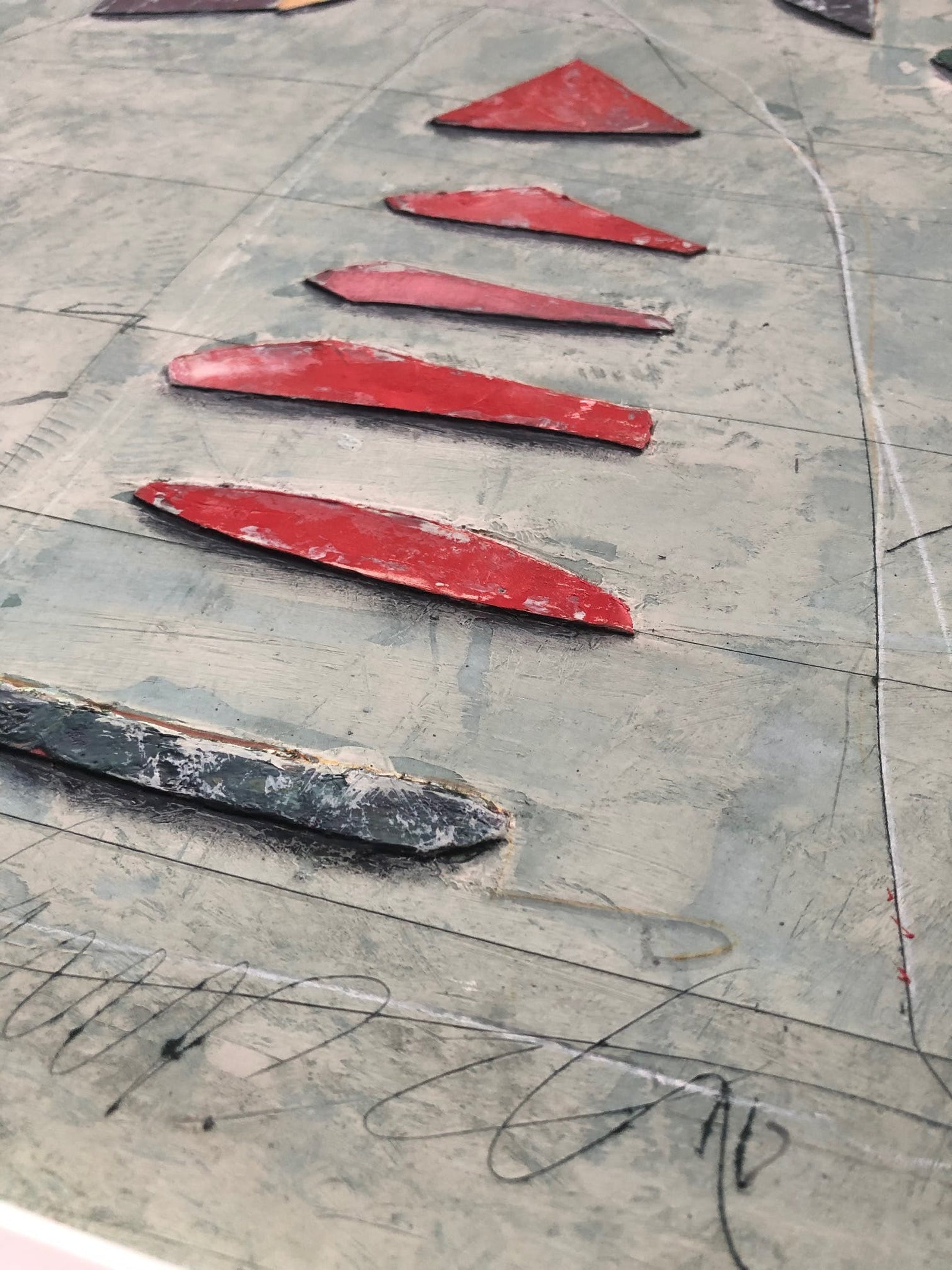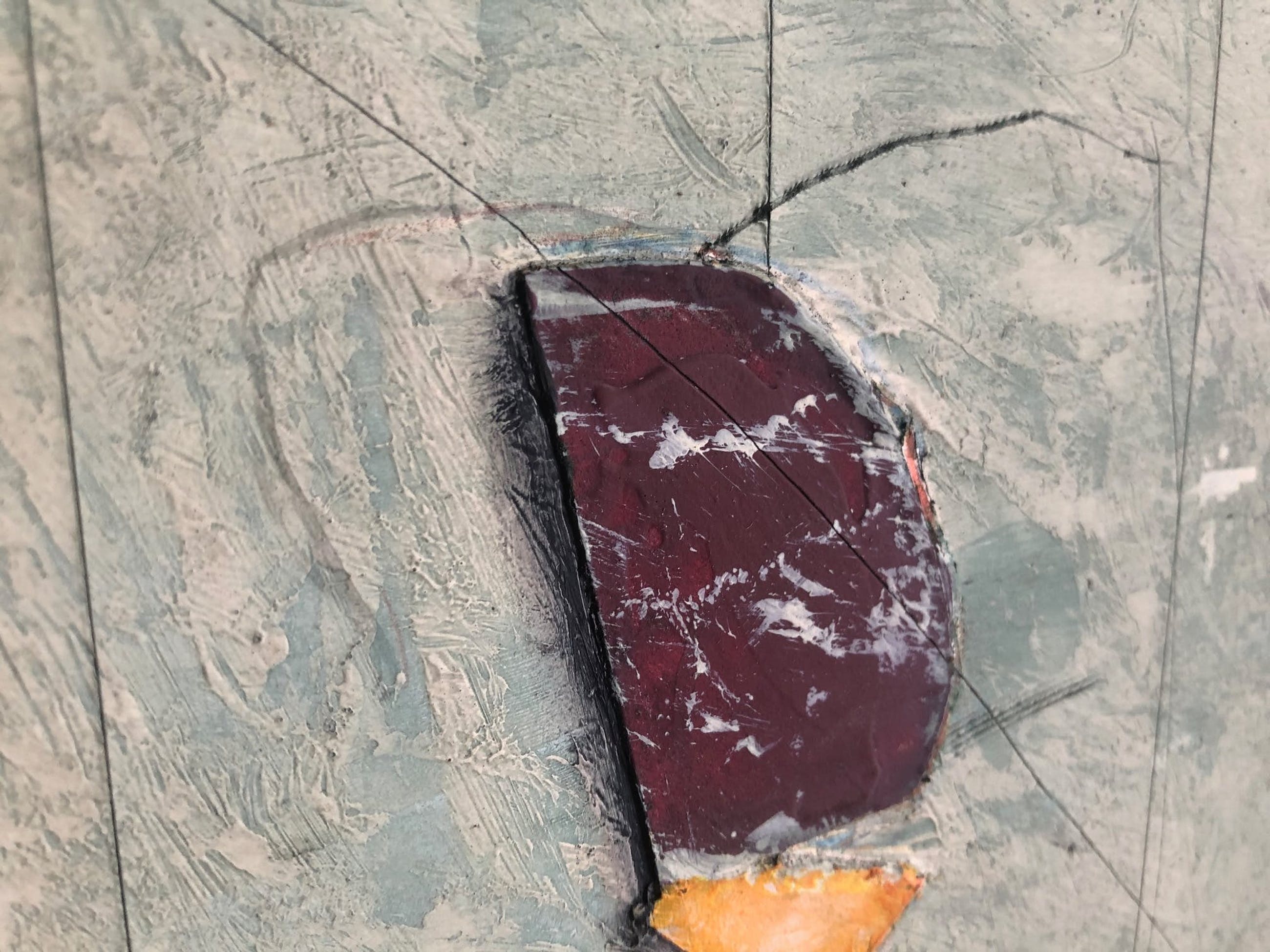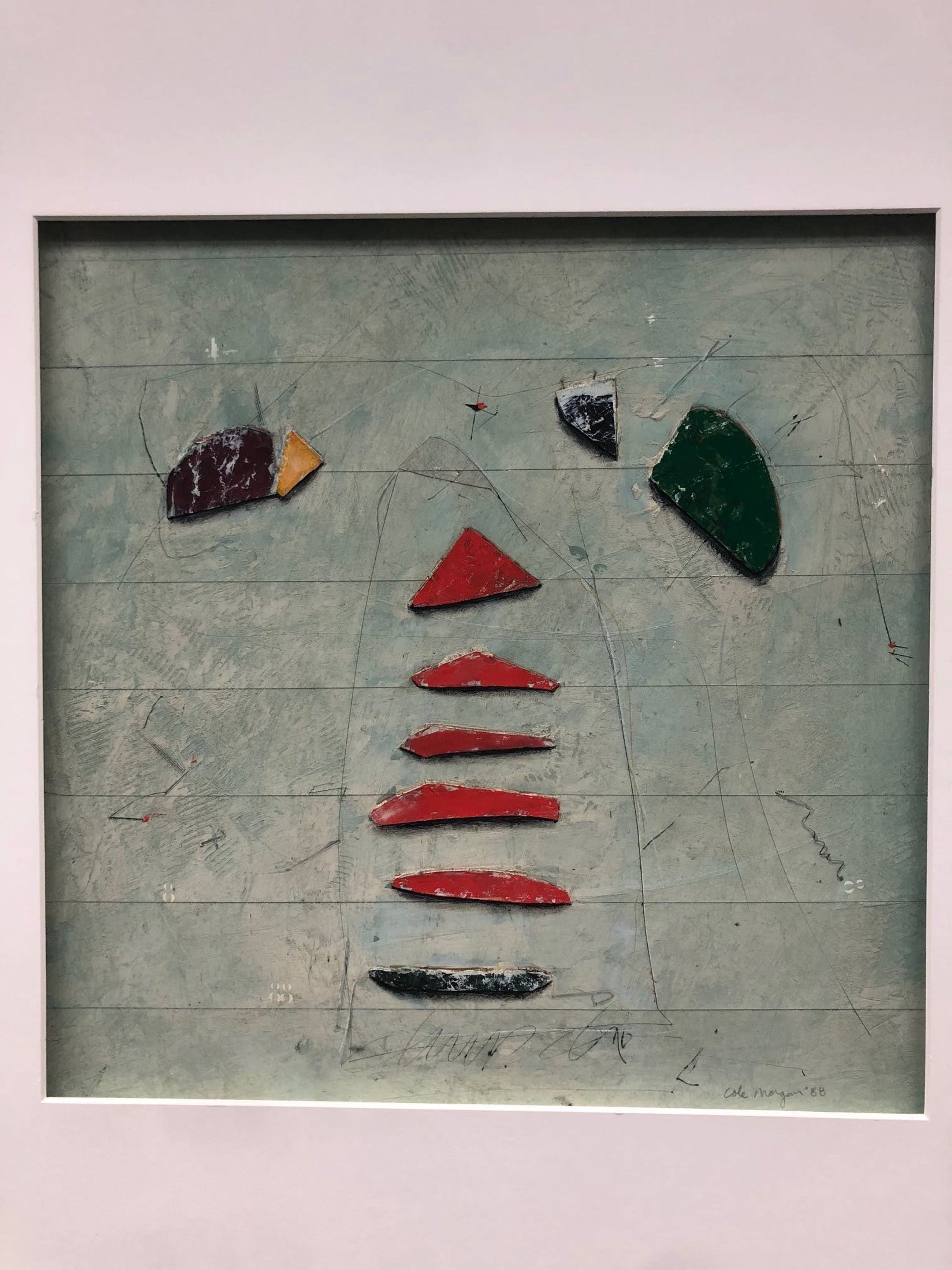 Gemengde techniek op papier. Gemaakt met papier, stempels, krassen in verf, te veel om op te noemen. Een zeer dynamisch werk met prachtige kleuren.