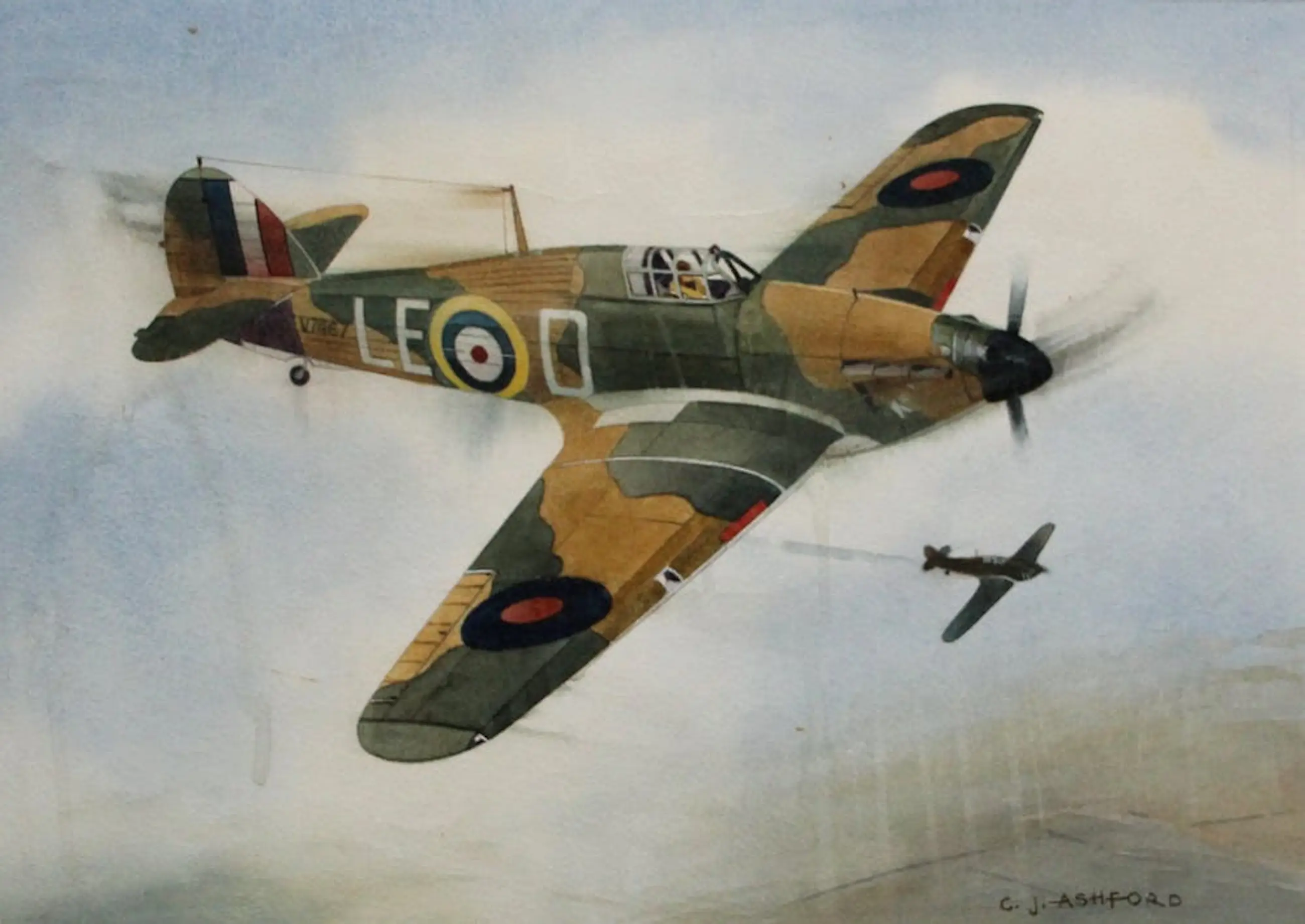 Aquarel van David Shepherd. Titel: Hawker Hurricane tijdens de vlucht. Afmetingen incl passepartout: H40 x b50cm. Afmetingen voorstelling: H25.5 x b36cm. Het werk is rechts onderin, handgesigneerd,door de kunstenaar. De authenticiteit van het aangeboden werk wordt volledig gegarandeerd. Een certificaat van echtheid kan, op aanvraag worden gemaild.