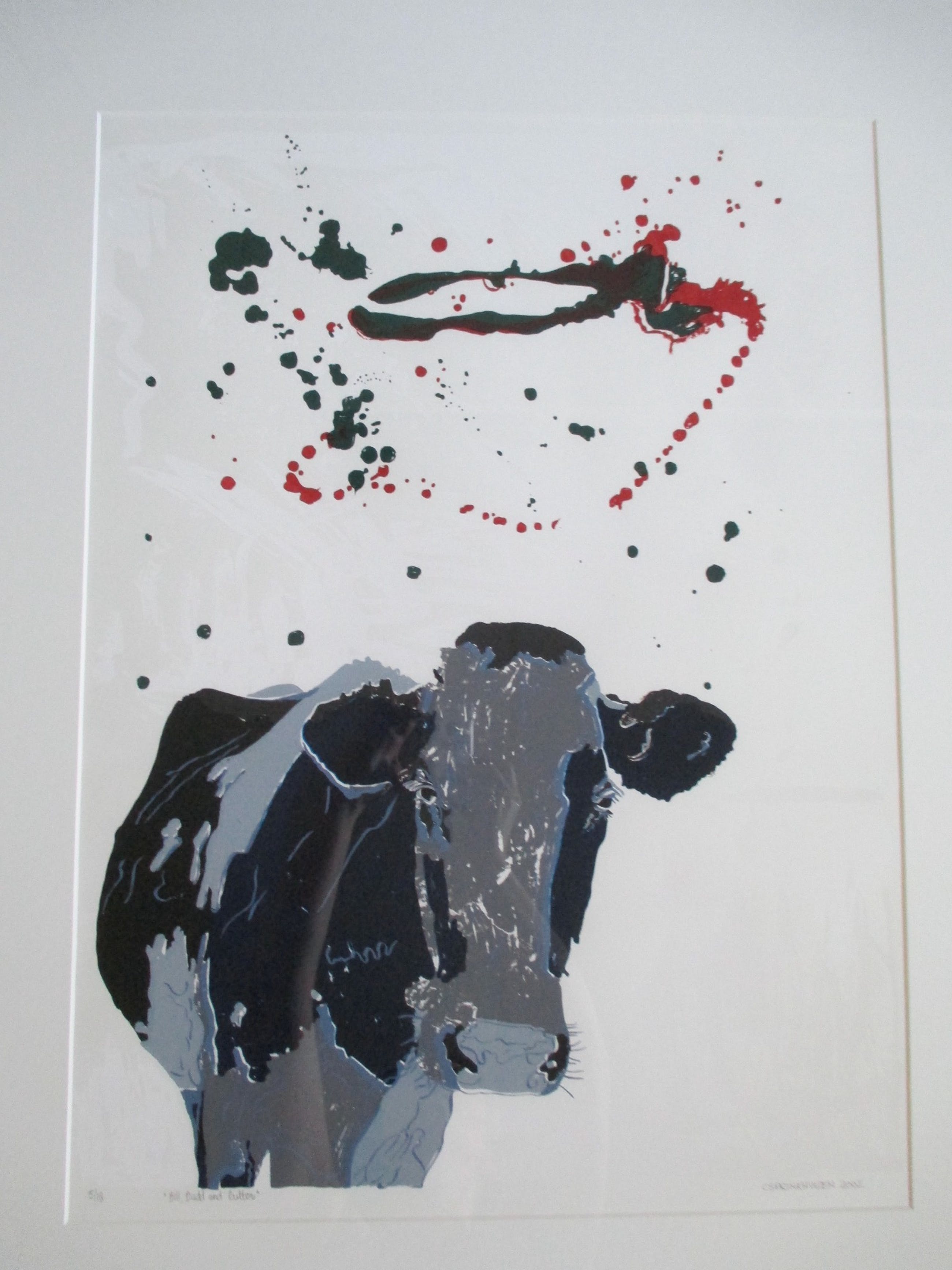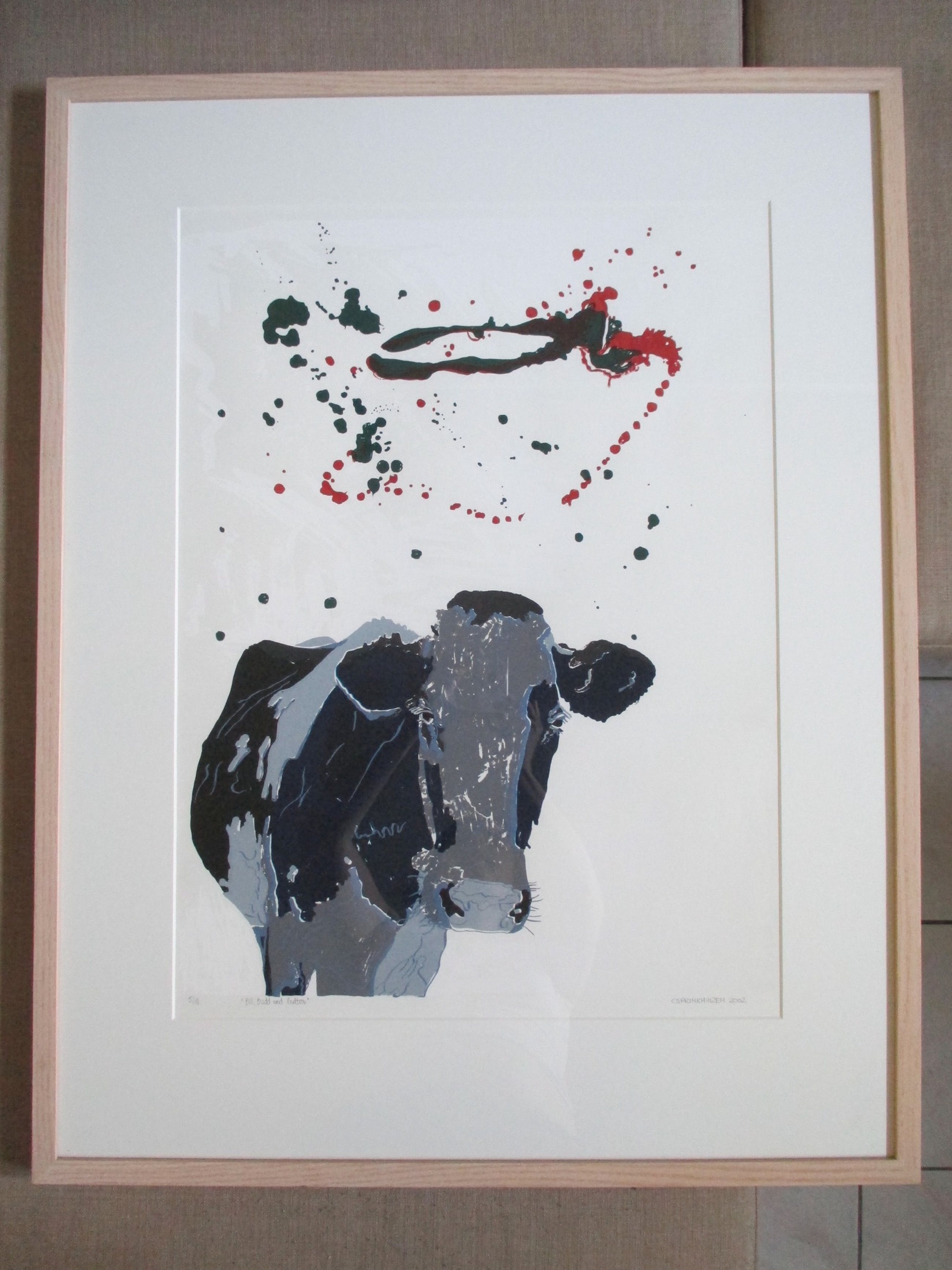 Zeefdruk van Conny Sprinkhuizen uit 2002 getiteld “Bill, budd and butter”, genummerd 5/18 en gesigneerd in potlood. Mooi professioneel zuurvrij ingelijst achter glas in een Barth