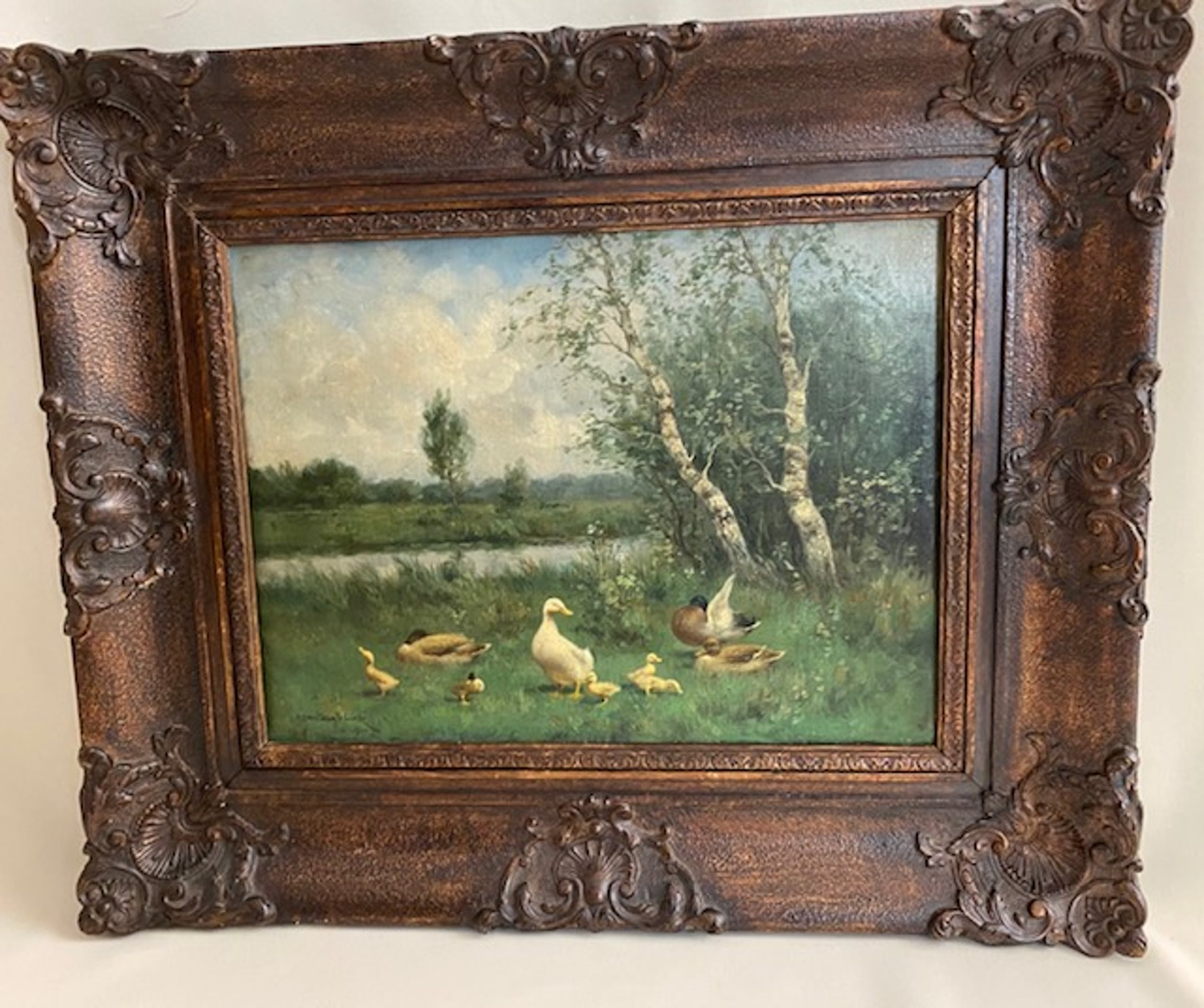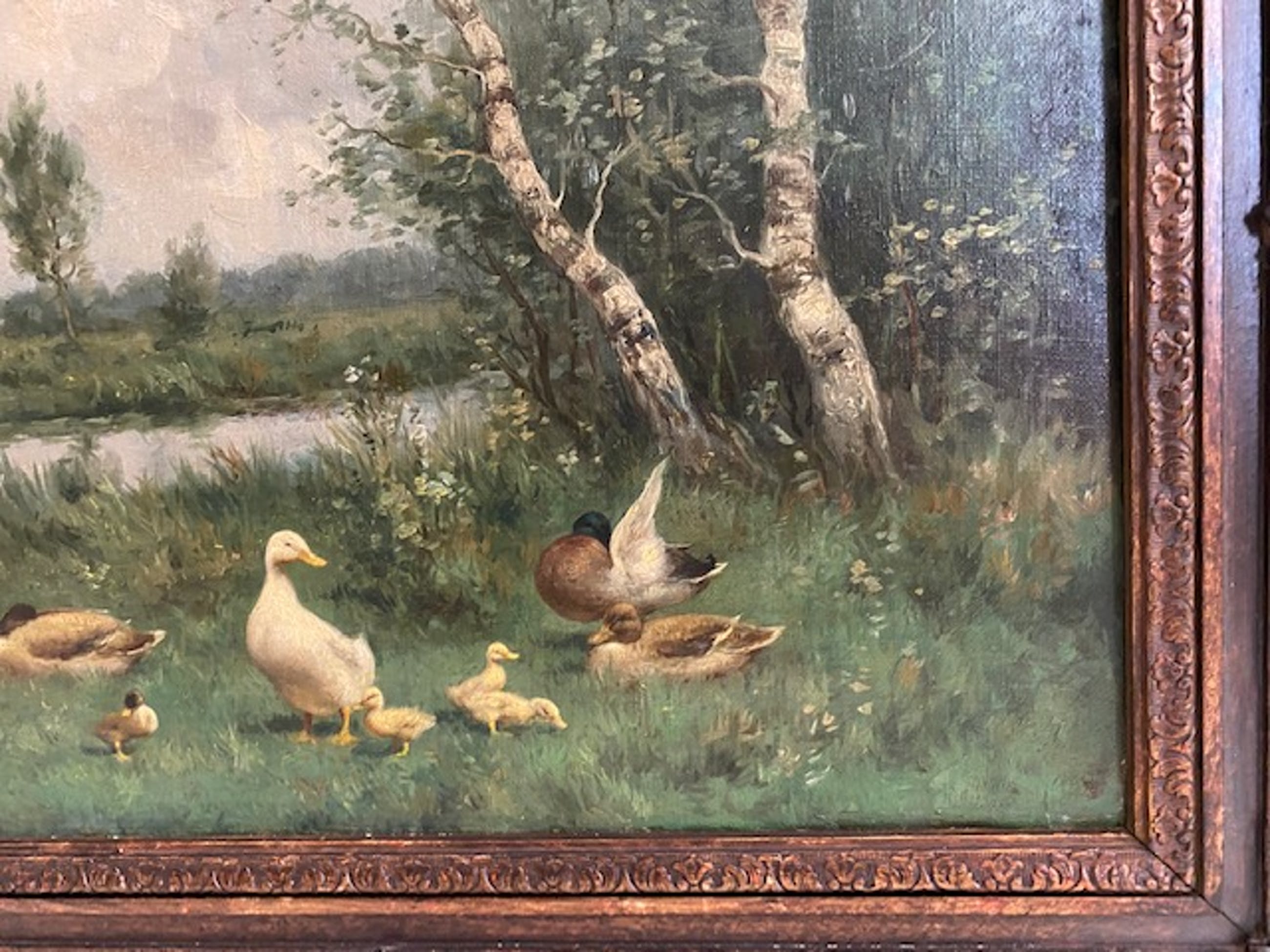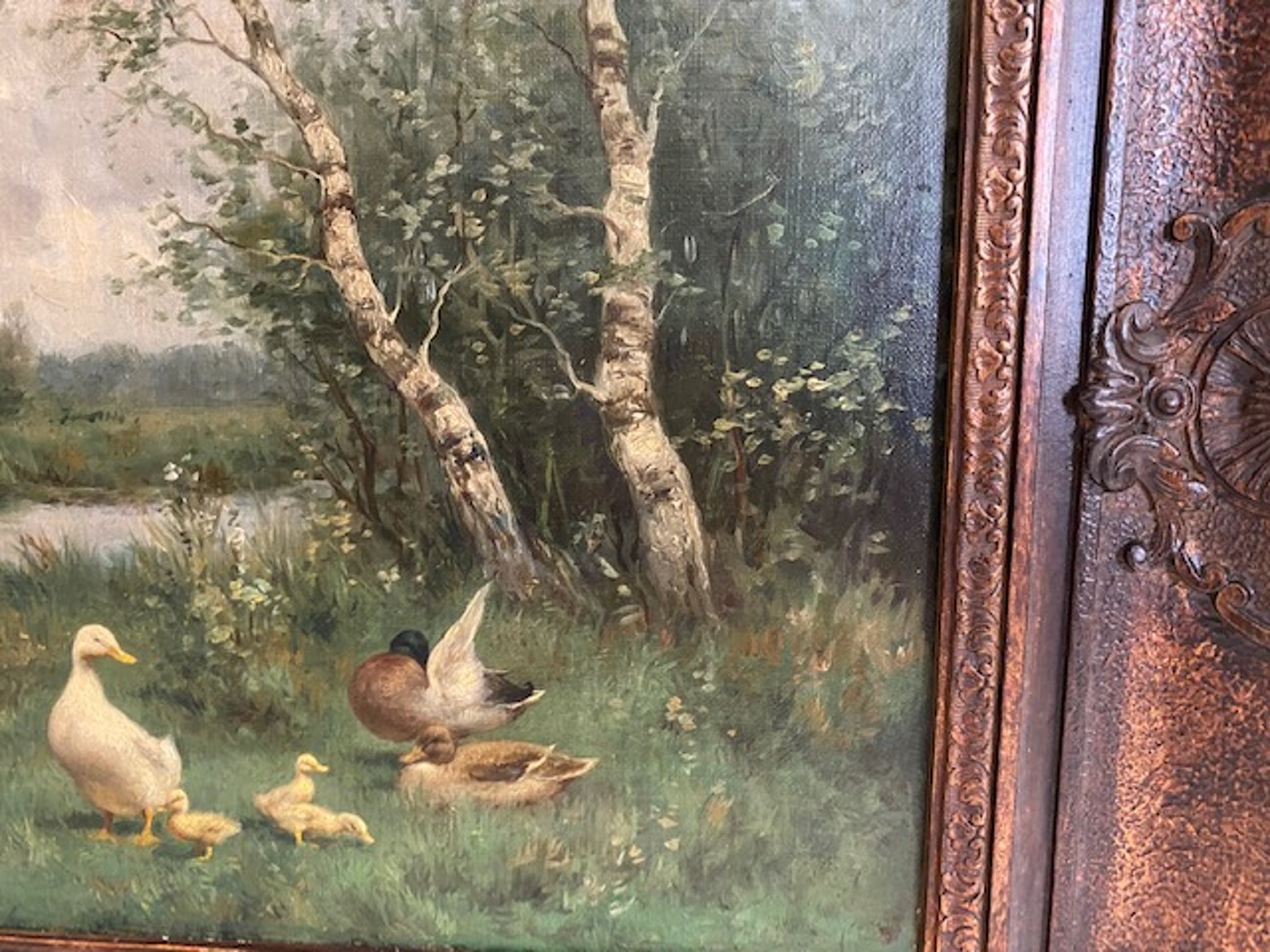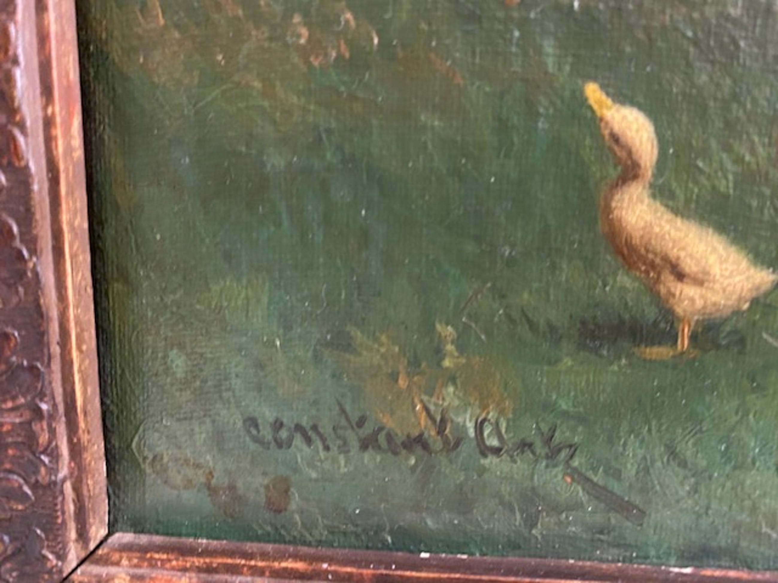 Aangeboden prachtwerk van Constant Artz (1870-1951) “Eenden aan de waterkant”. Rechts onder met hand gesigneerd. Doek en list bevindt zich in goede staat. Constant Artz werd in 1870 in Parijs geboren. Hij is vooral bekend geworden om zijn vele watergezichten met eenden. Leerling van Willem Maris Tevens was Constant Artz een goed aquarellist. Hij wist op meesterlijke wijze eenden met hun kuikens weer te geven. Behalve eenden heeft hij ook Hollandse landschappen geschilderd Constant Artz was de zoon van de Haagse School-schilder D.A.C. Artz. Constant Artz overleed in 1951 in Soest. Diverse musea bezitten werk van hem.