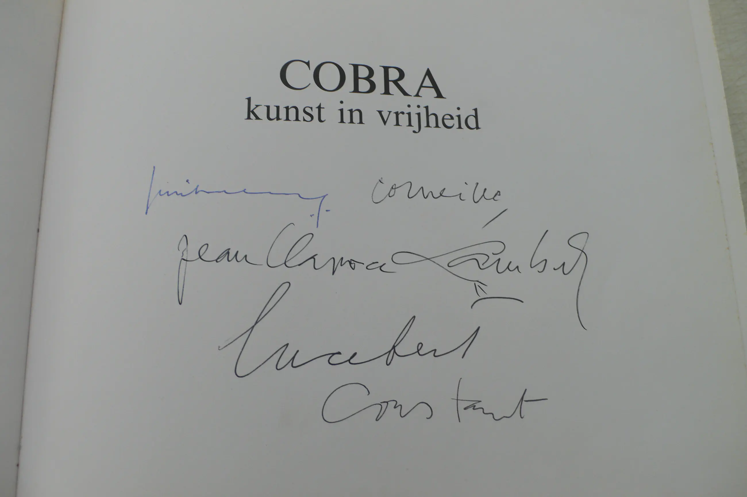 Dit bijzondere exemplaar is niet alleen gesigneerd door de auteur Lambert, maar ook door Cobraleden als Corneille, Lucebert (die niet vaak signeerde), Constant en Gerrit Kouwenaar!