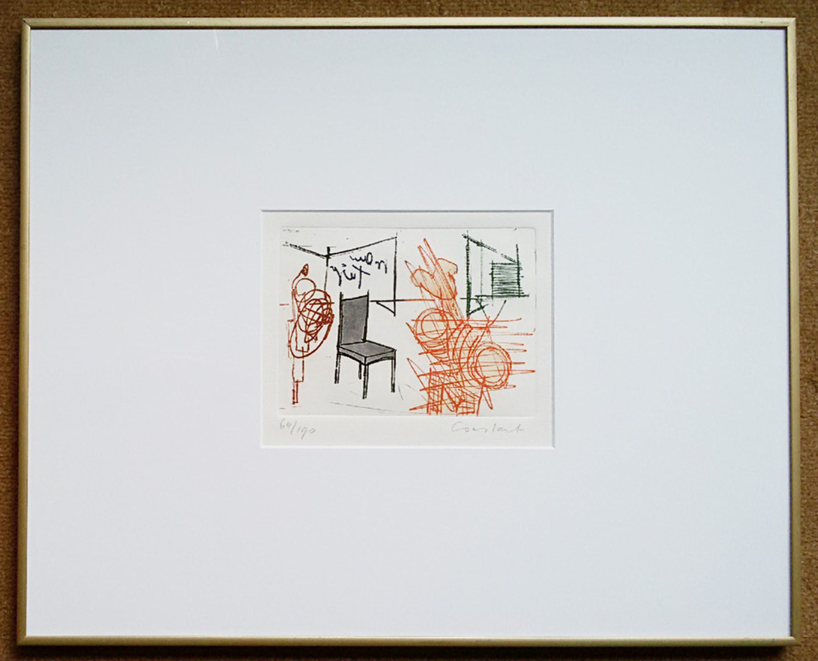 Bekende ets van Constant uit 1971. Met potlood gesigneerd en genummerd (64/190). In strakke, goudkleurige aluminium lijst, achter glas en met smetteloos passe-partout. In uitstekende staat.