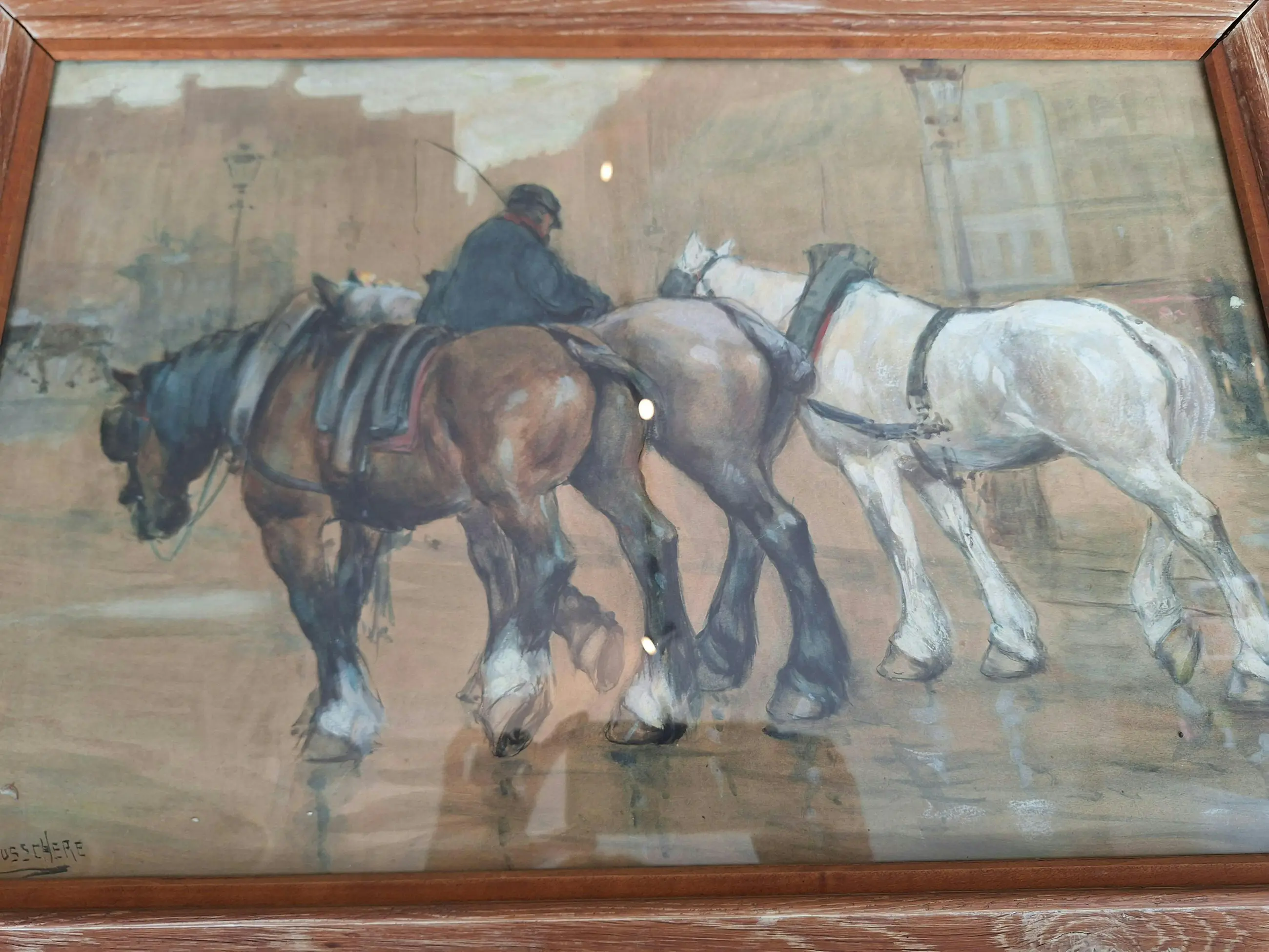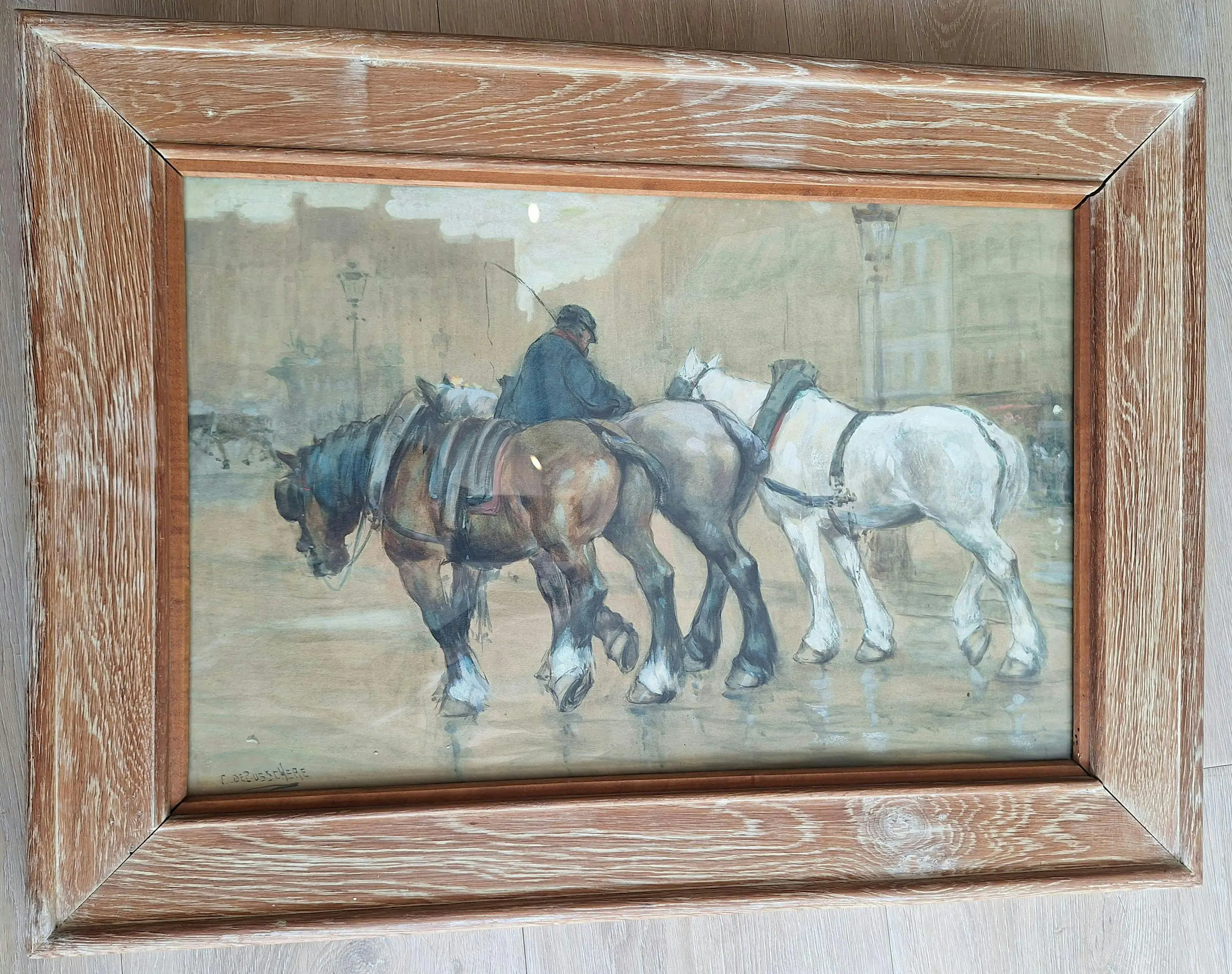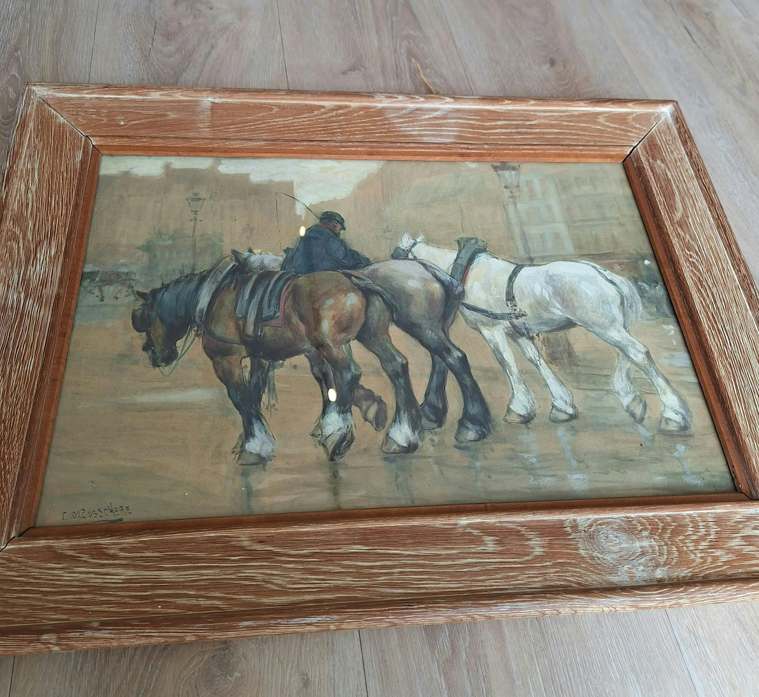 Mooie Aquarel van Constant de BusschereWerk paarden met begeleider in straatbeeld vorige eeuw Ingelijst in stevige bruin houten lijst achter glas. In zeer goede staat. Doek getekend.