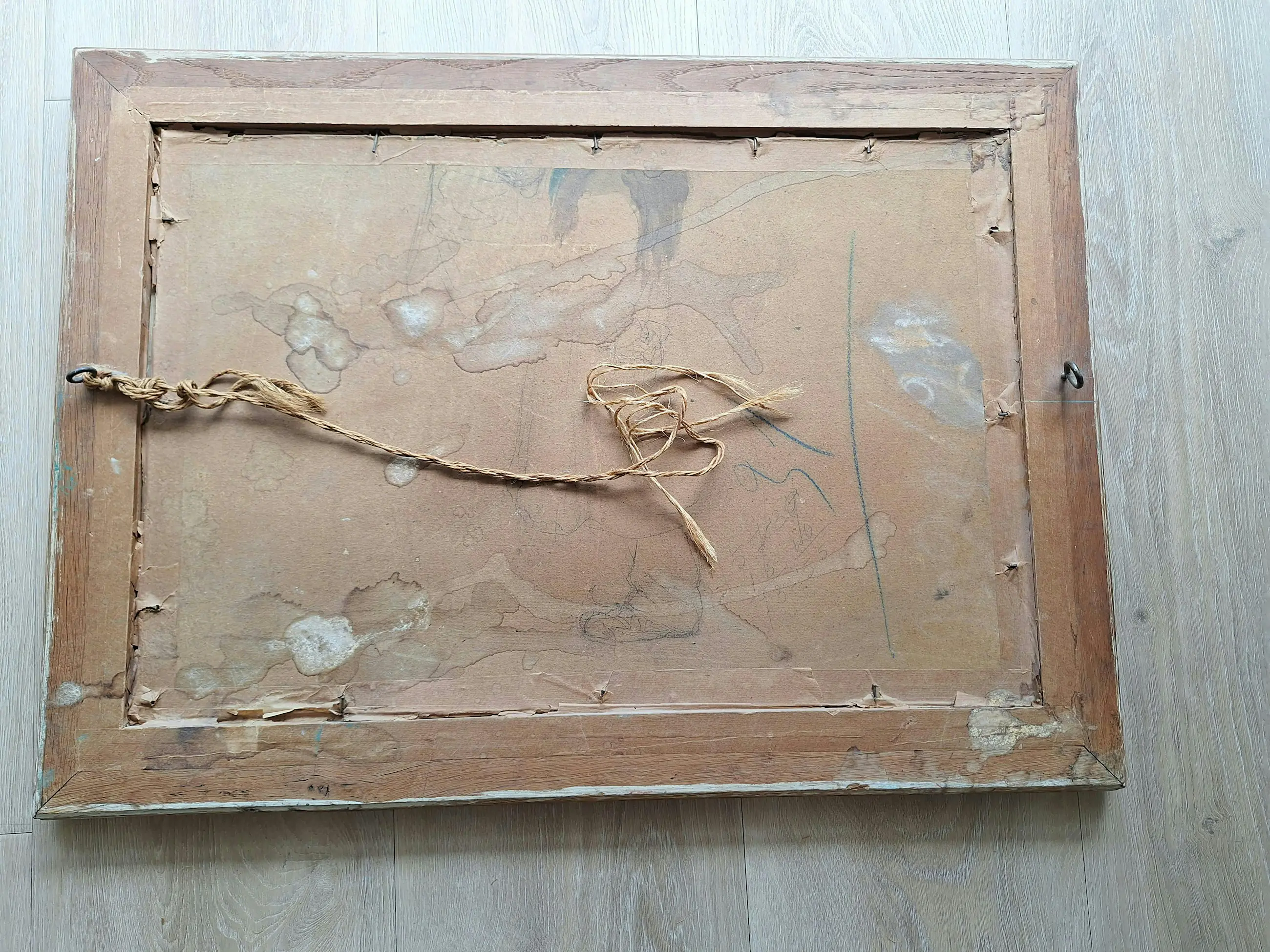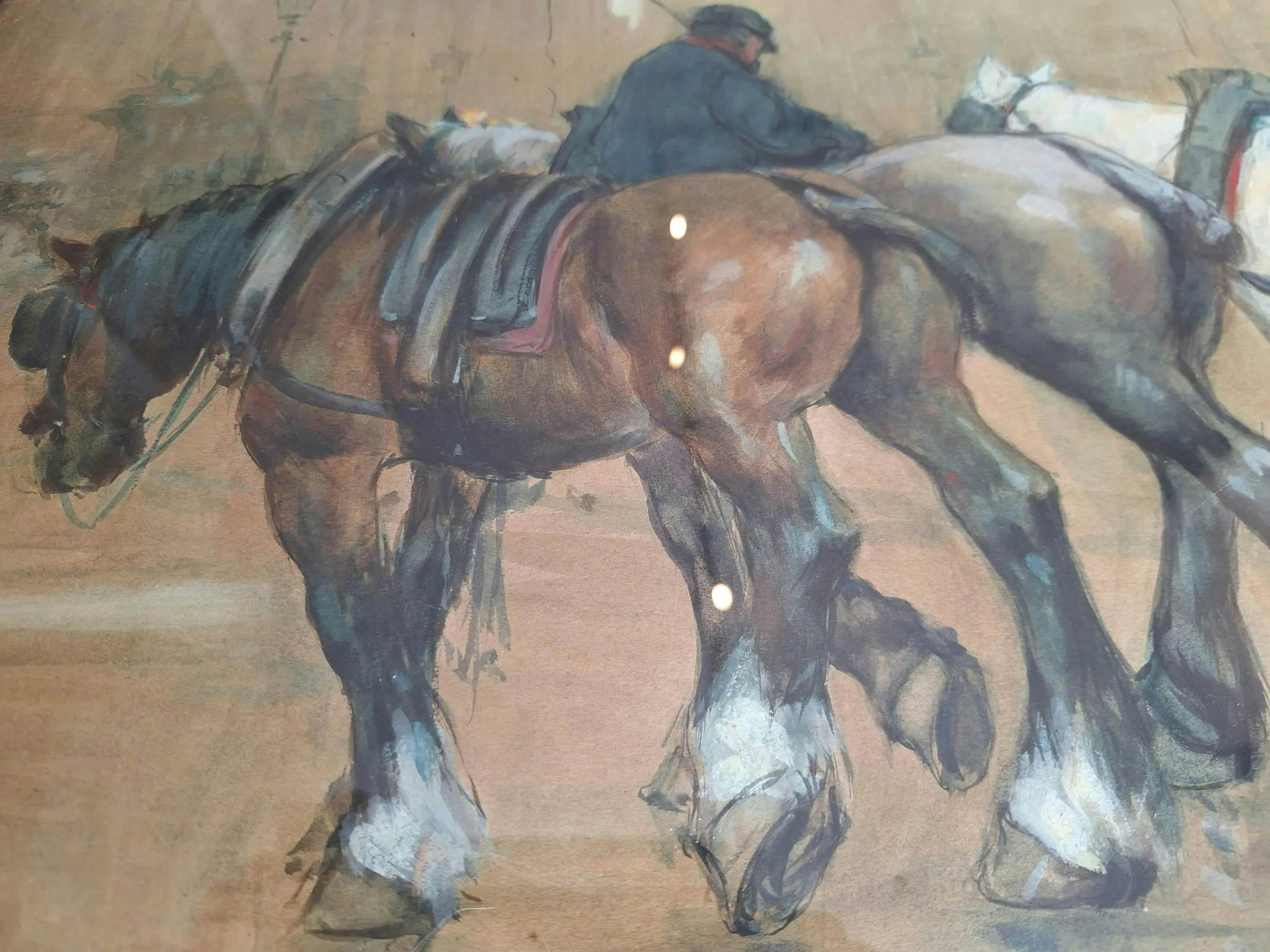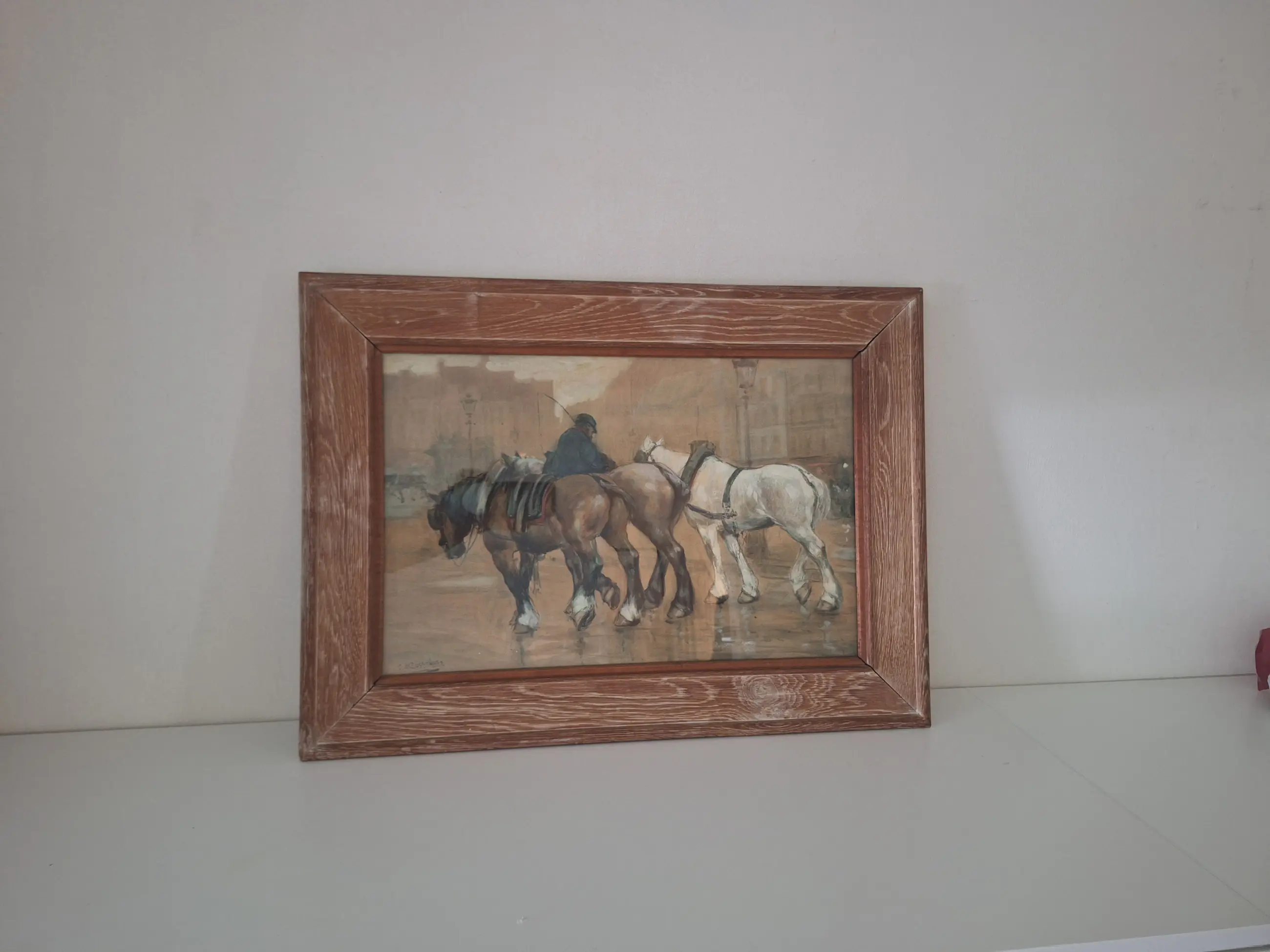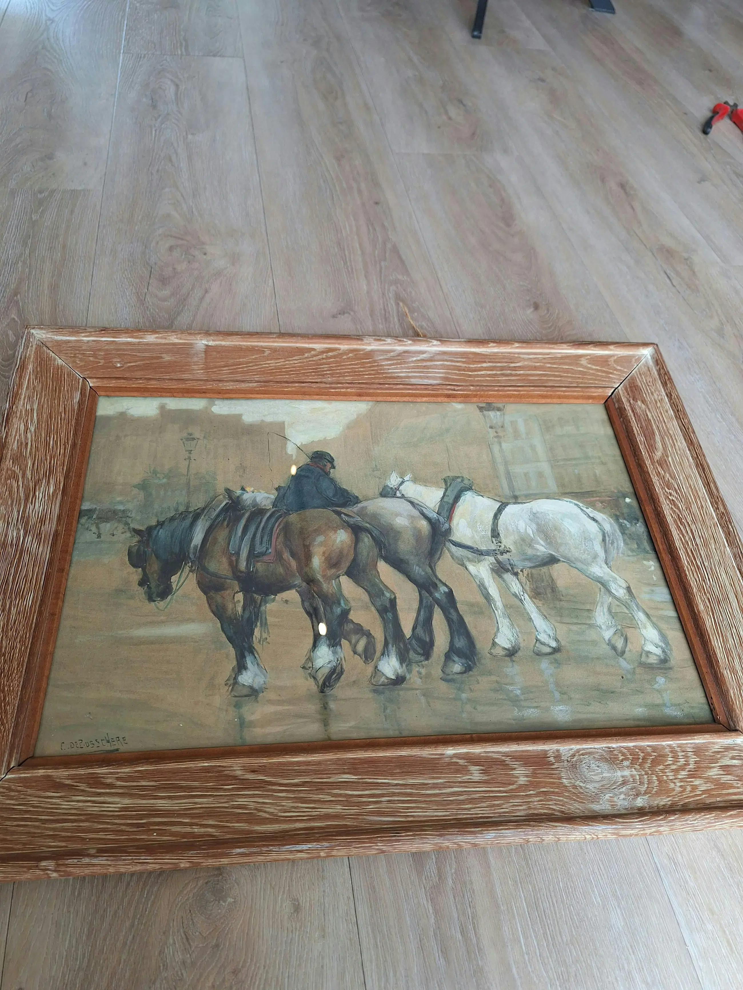 Mooie Aquarel van Constant de BusschereWerk paarden met begeleider in straatbeeld vorige eeuw Ingelijst in stevige bruin houten lijst achter glas. In zeer goede staat. Doek getekend.