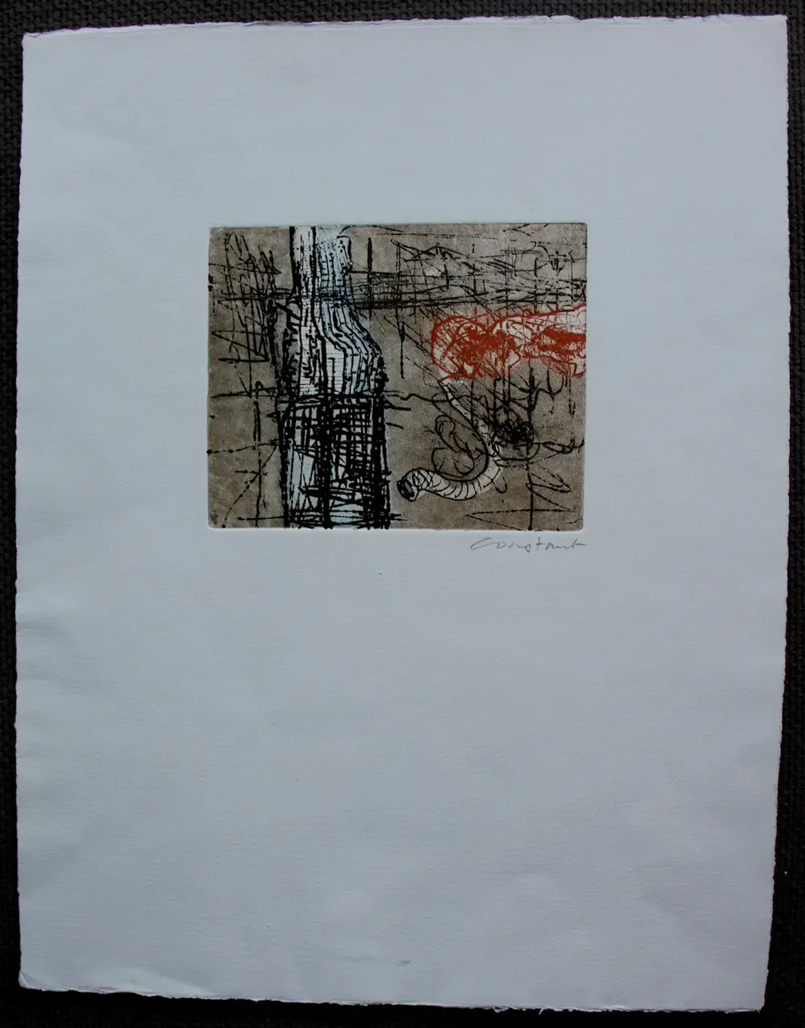 Ets van Constant. Voorstelling van een fles. Jaar: 1971. Afmetingen blad: H50 x b39cm. Afmetingen voorstelling: H15.5 x b18.5cm. Het werk is rechts onderaan, met potlood, gesigneerd door de kunstenaar. De authenticiteit van het aangeboden werk wordt volledig gegarandeerd. Een certificaat van echtheid kan, op aanvraag, worden gemaild.
