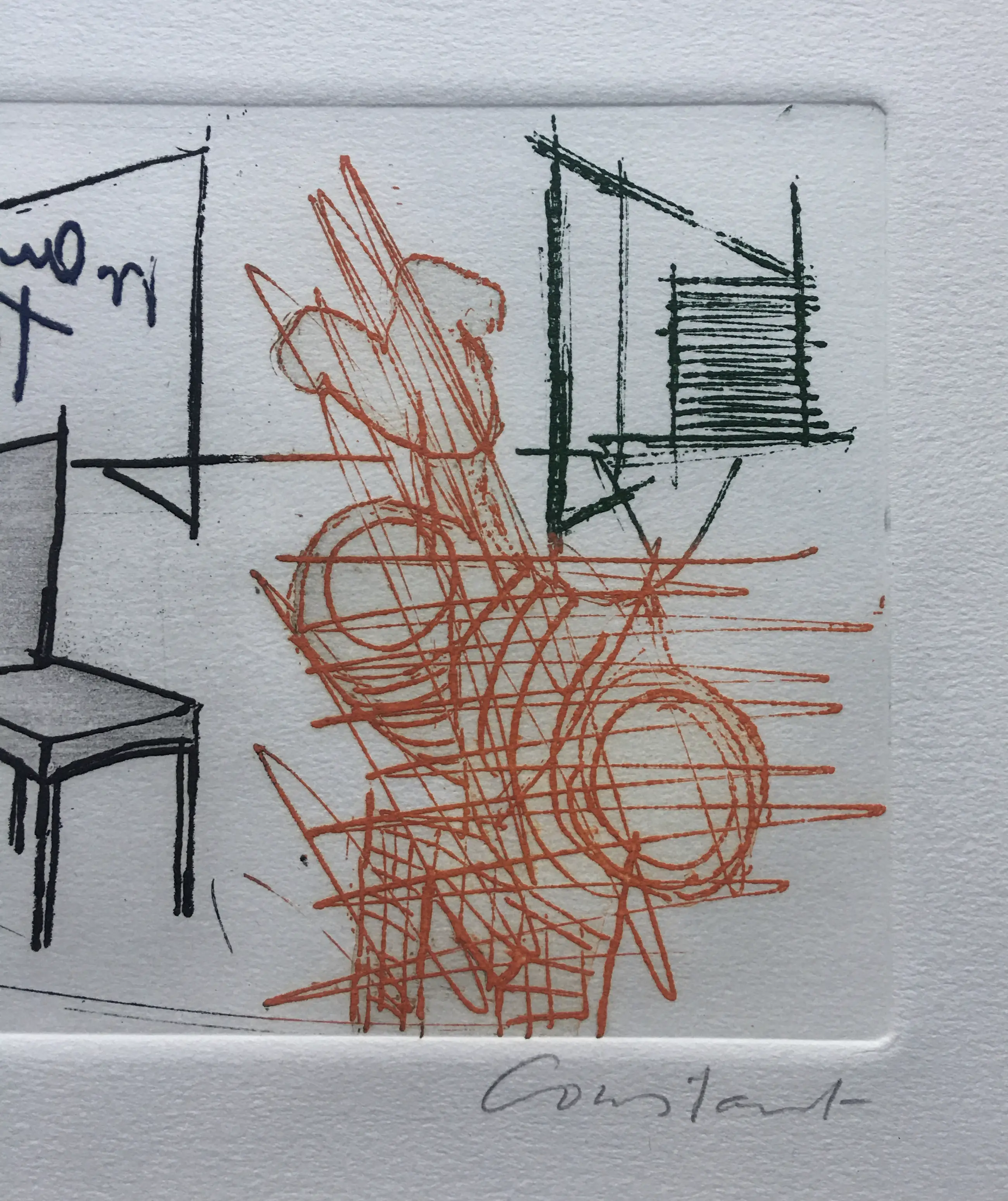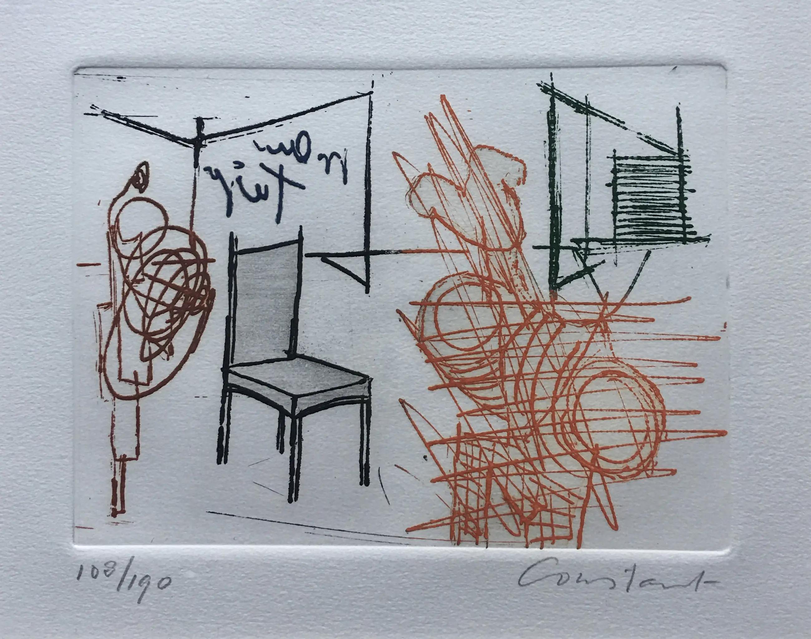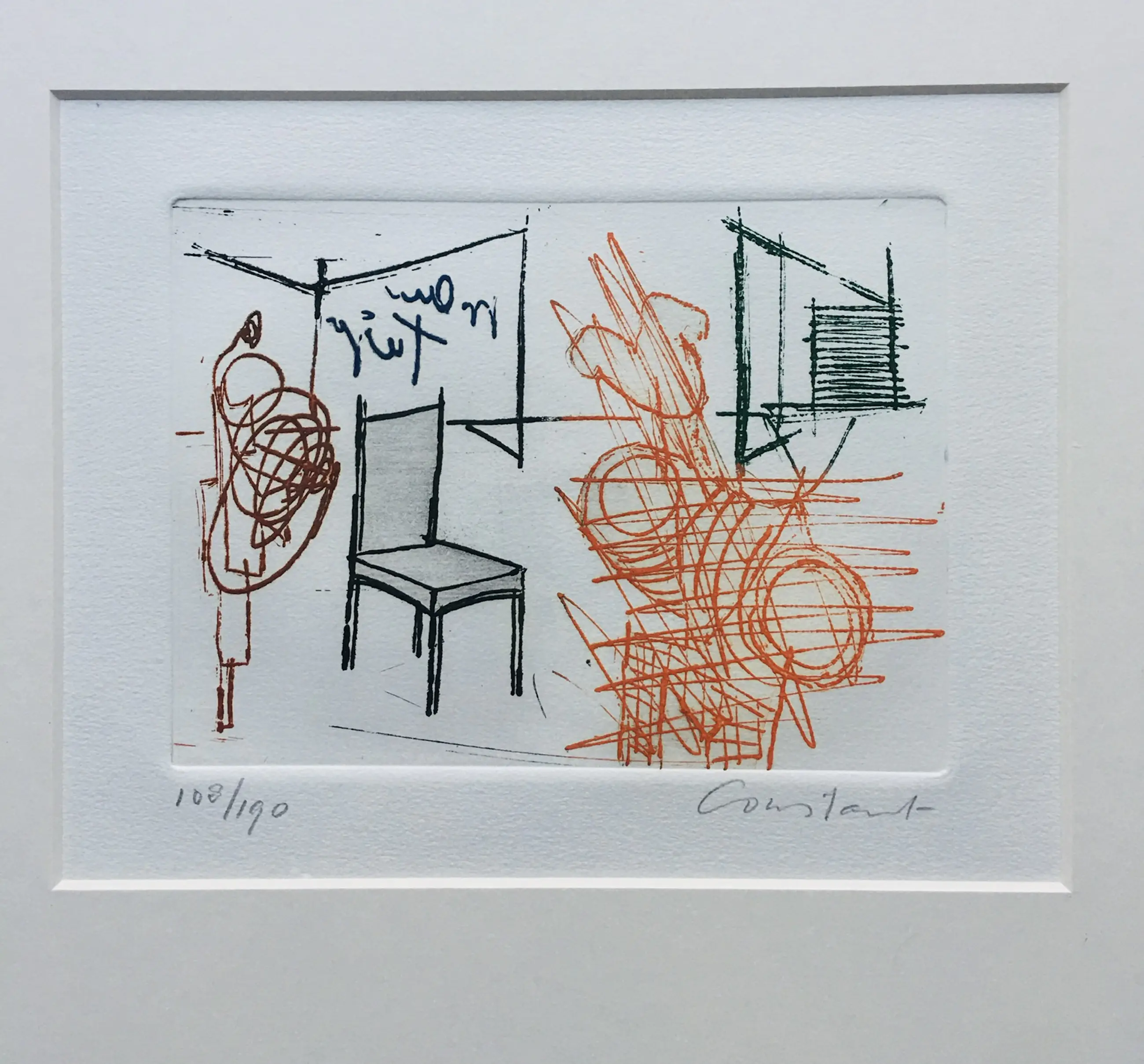 Een fraaie ets van Constant uit 1971. Met potlood gesigneerd en genummerd (108/190). In strakke, zilverkleurige houten lijst, achter glas en passe-partout. De lijst heeft wat kleine plekjes.