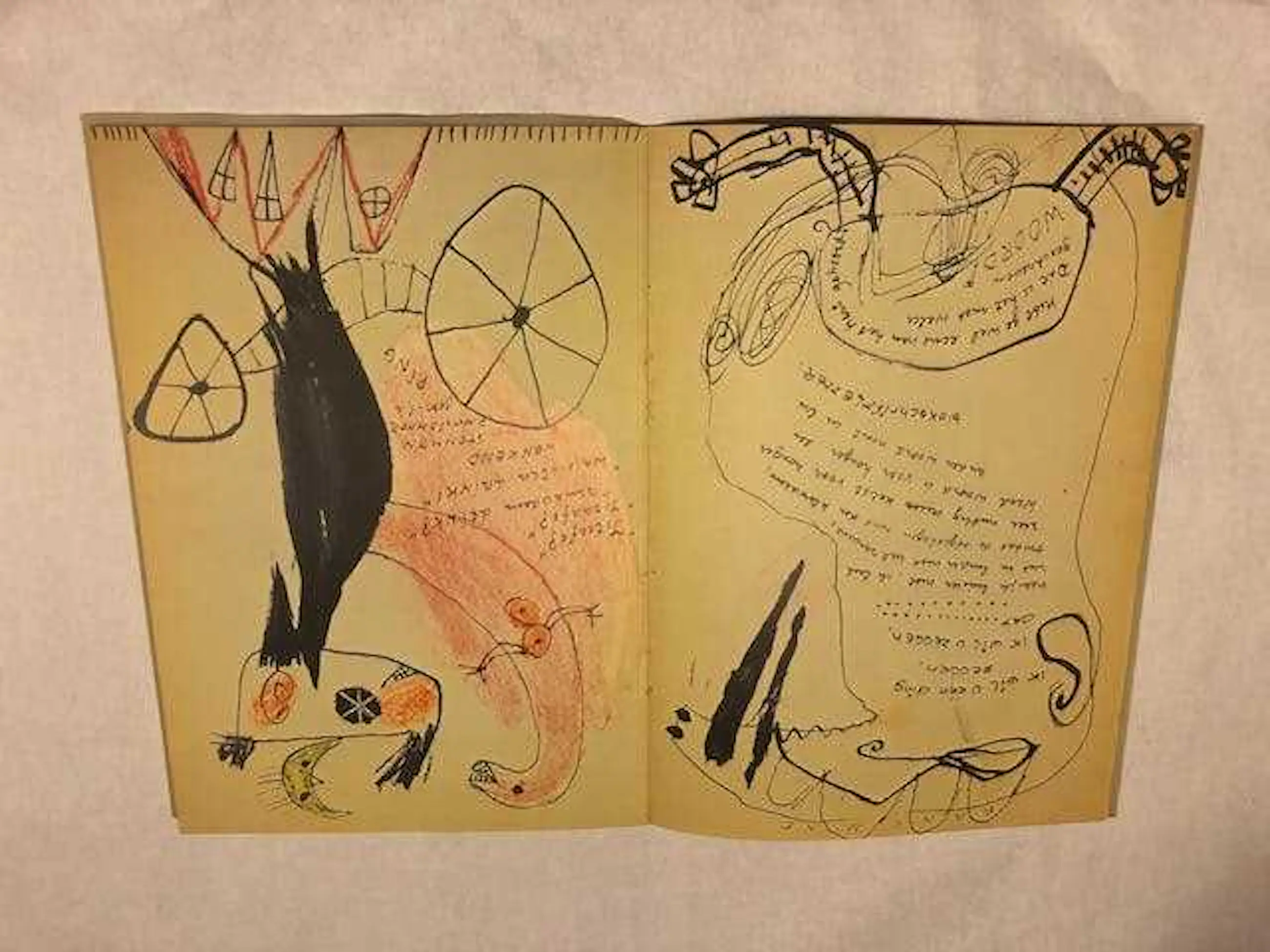 Over Goede morgen Haan: " In april 1949, ontstond Goede morgen Haan, dat in 1978 door Querido in facsimile werd heruitgegeven. Constant schilderde en Kouwenaar dichtte op vellen boterhampapier die tot bladzijden werden versneden en in een fototypie procedee tot dertig exemplaren vermenigvuldigd met de hand werden ingekleurd, genummerd en gesigneerd en door de Experimentele Groep uitgegeven. Goede morgen Haan is het resultaat van de spontane samenwerking van twee verwante experimentele kunstenaars en de directe expressie van hun behoefte tot creatief bezig zijn. Het boekje van veertien bladzijden vertoont alle kenmerken van de vrije experimentele uitingsdrift. In de schilderingen van Constant herkent men het aan Miró ontleende laddertje naar de vrijheid, de korte handen met vier brede vingers, de opengesperde ogen en de niemand ontziende wielen waarmee de verschrikkingen van de oorlog primitief zijn uitgedrukt op een wijze die de beroemde etsen van Goya of de expressie van een Van Gogh in herinnering brengt. Daarnaast staan de vrolijke fabeldieren die we eveneens tegenkomen in de Deense kunst van Jorn en Pedersen, in felle springlevende kleuren. ‘Het schilderij is een dier, een nacht, een schreeuw, een mens of dat alles samen,’ schreef Constant in het ‘Manifest’". (Erik Slagter op DBNL)