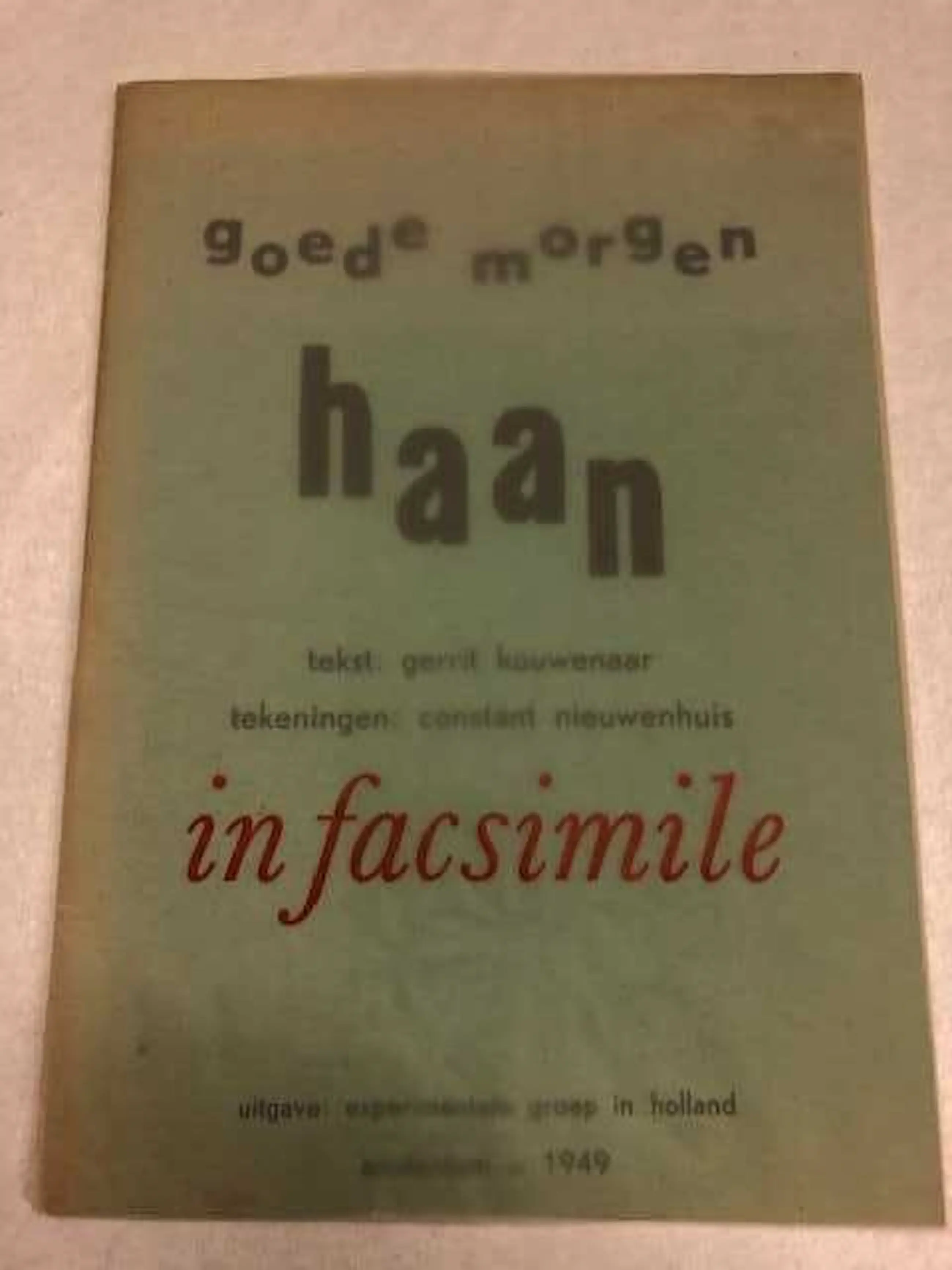 Goede morgen haan Tekst: Gerrit Kouwenaar, tekeningen: Constant Nieuwenhuis; inclusief het (zeldzame) transparante omslag met de tekst "in facsimile". Dit is de tweede druk, in facsimile, Querido 1978; enige gebruikssporen, zie de foto's. Geniet met 16 blz. Gedocumenteerd in Tekst & Beeld / Cobra en Vijftig een bibliografie, van de hand van Erik Slagter, p. 49;
