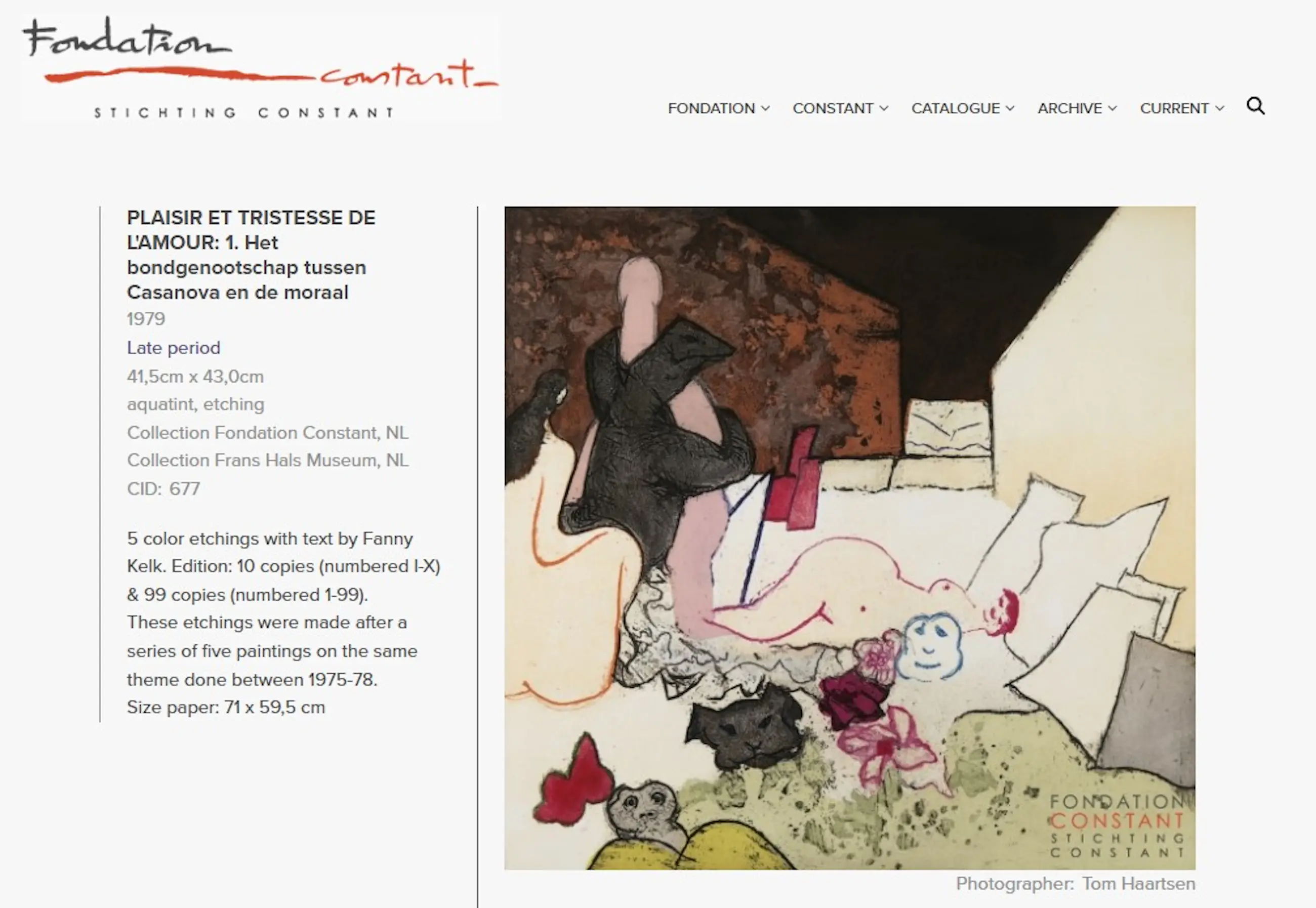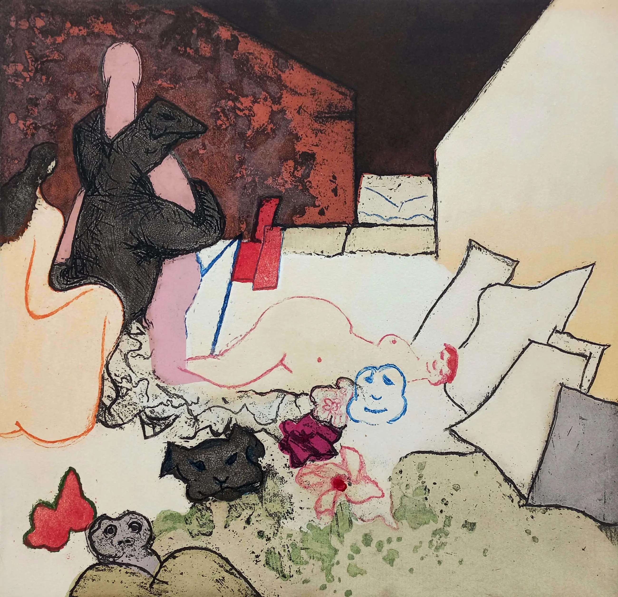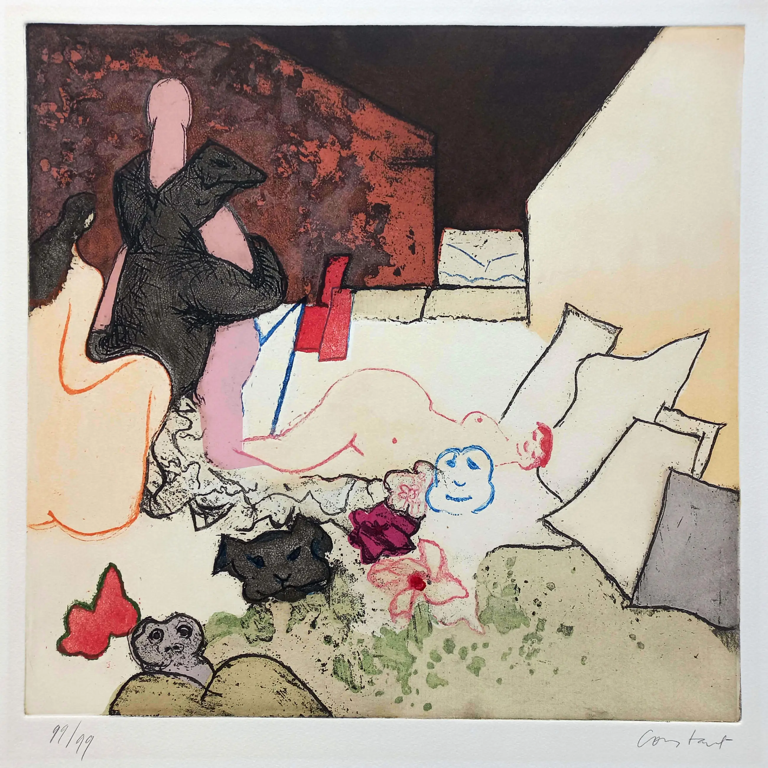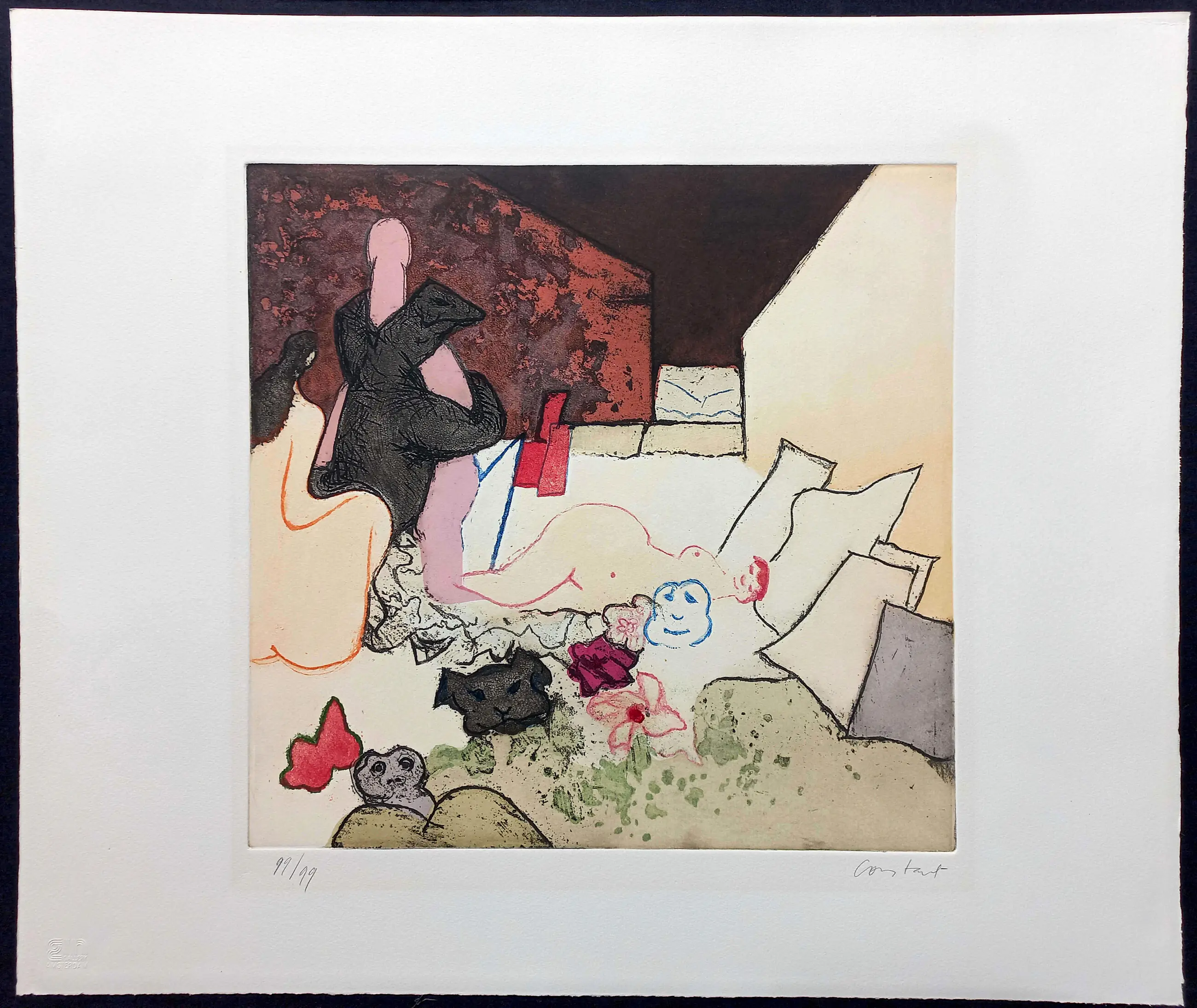 Zeer mooie, grote ets van Constant uit de portfolio Plaisir et tristesse de l’amour, in 1979 uitgegeven door G.I.N. Gallery te Amsterdam. Aquatint ets op geschept papier, met potlood gesigneerd en genummerd (99/99). In zeer goede conditie.