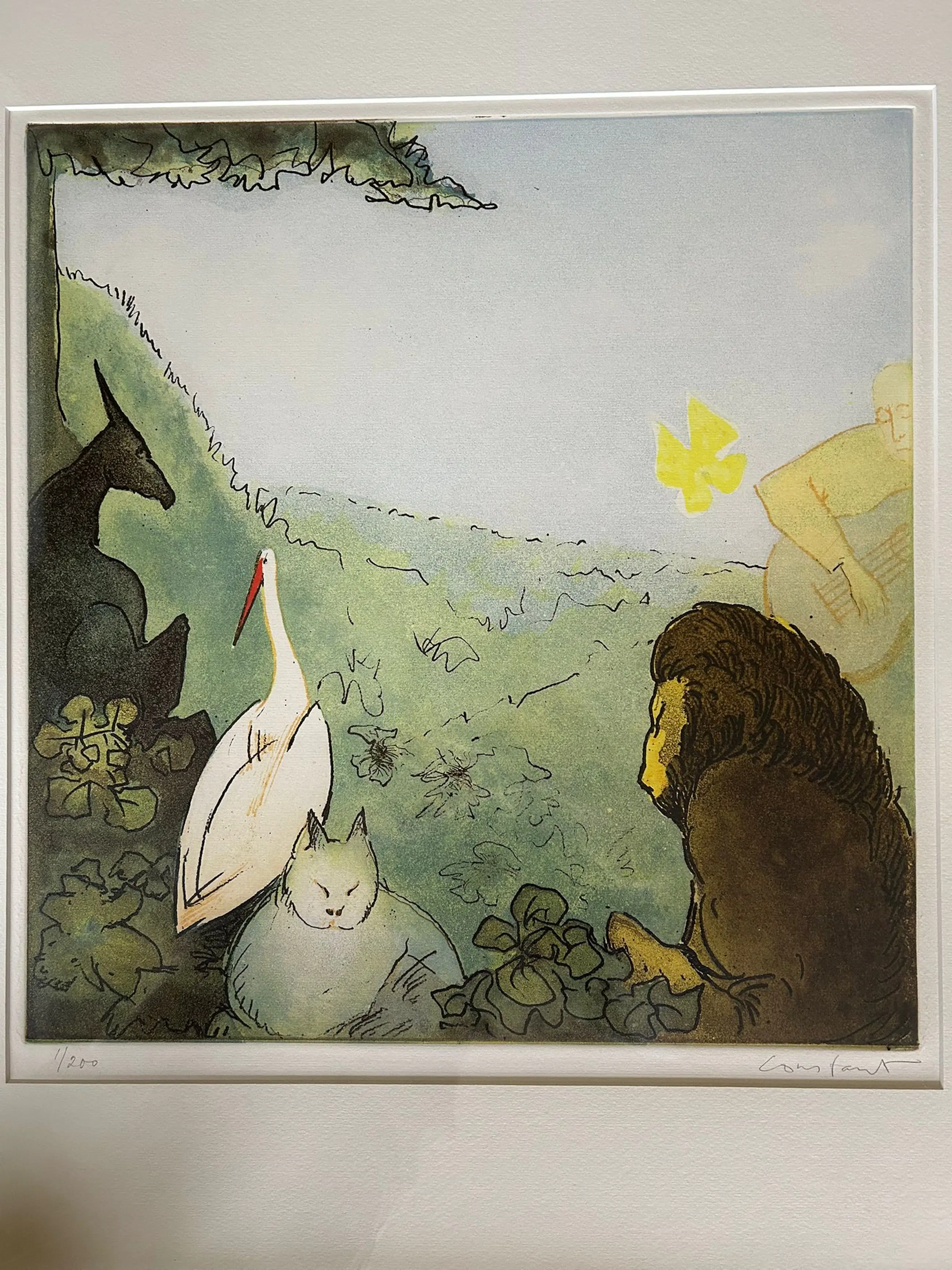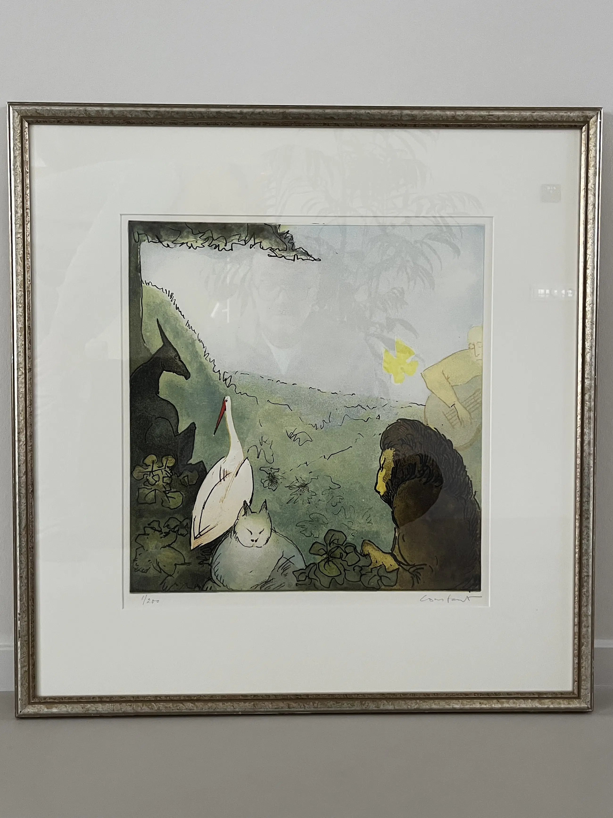 Dit is een ets met de titel 'Orpheus met dieren' van de Nederlandse kunstenaar Constant Nieuwenhuys. Het werk is gemaakt rond 1981.